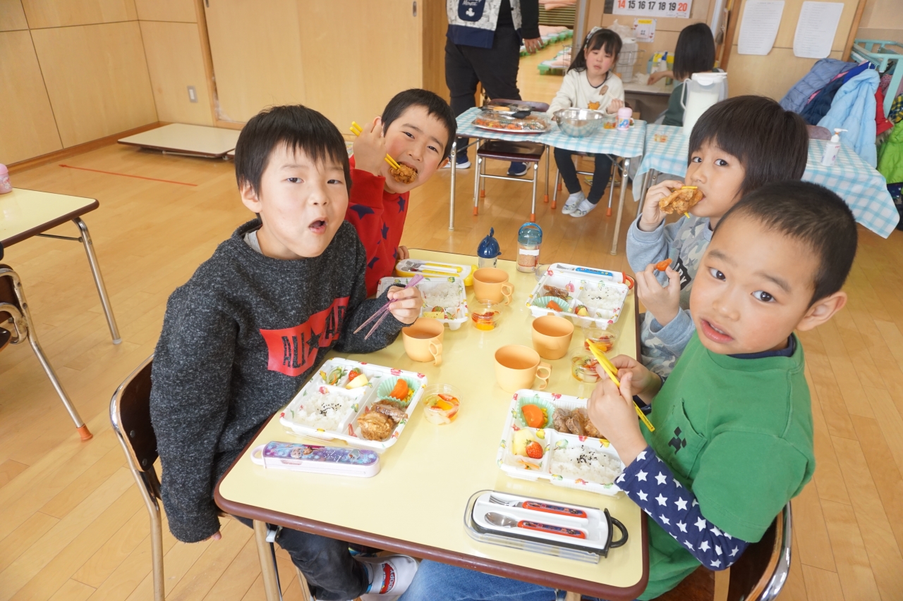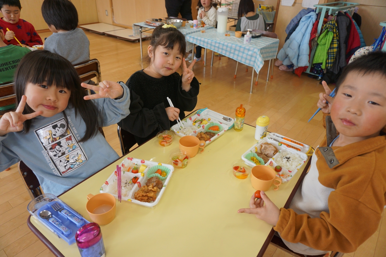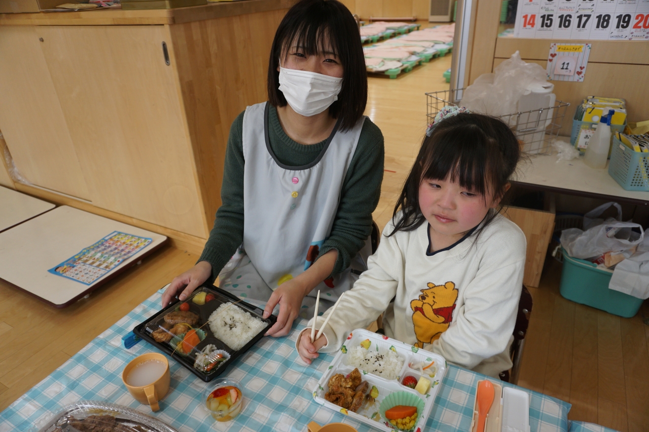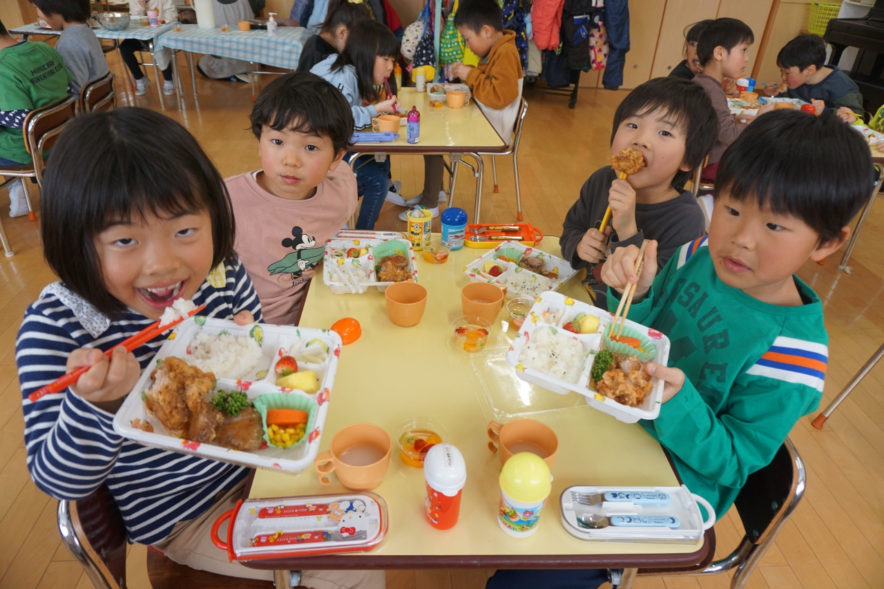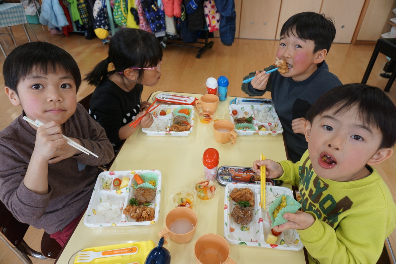 この日の給食はお楽しみお弁当!から揚げやハンバーグなどみんなの大好きなものがたくさんあり、年長組さんはおかわり分も全部ペロリと食べました!