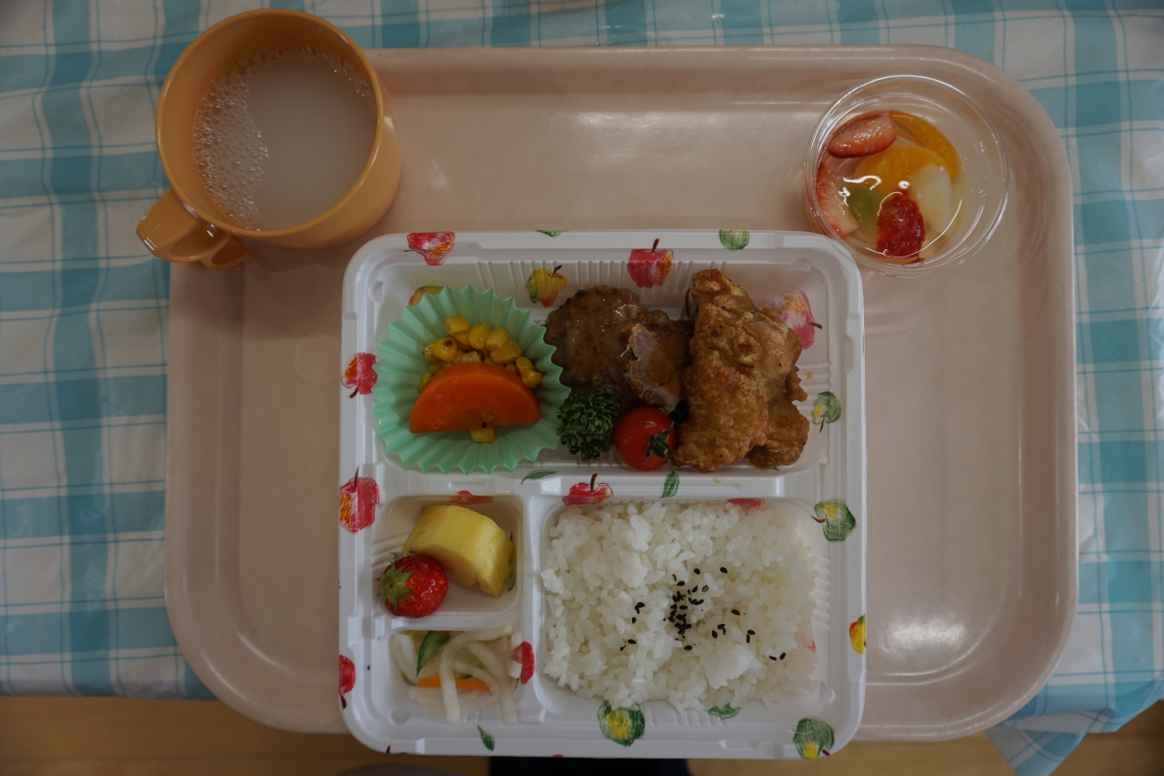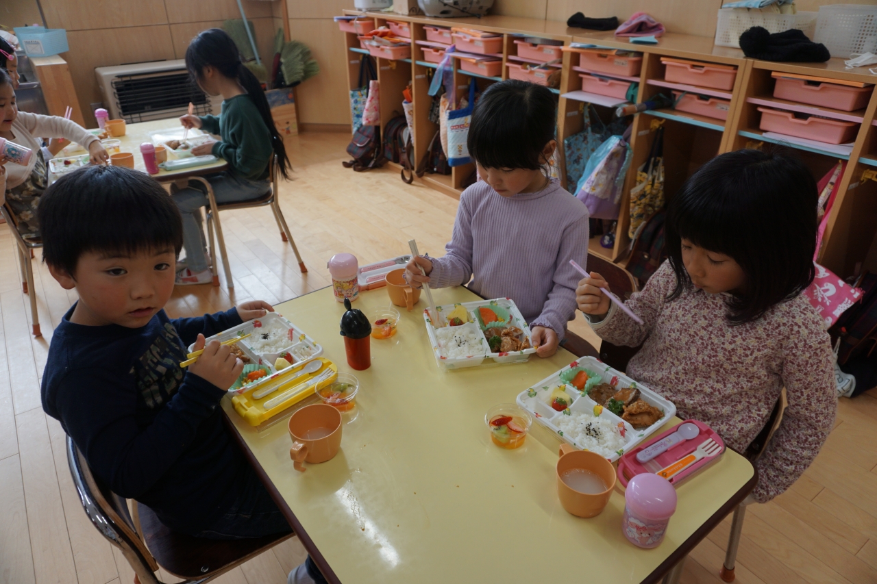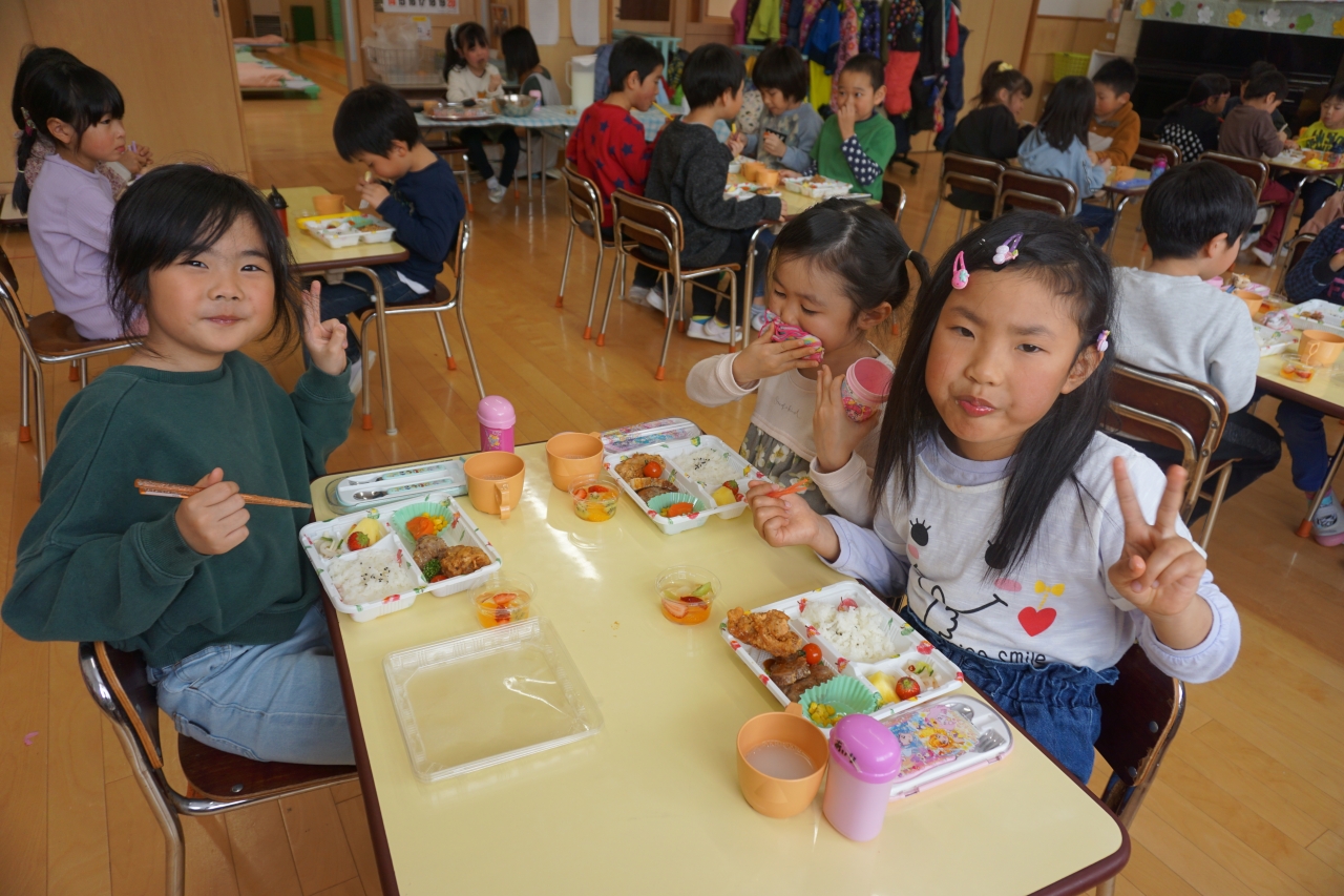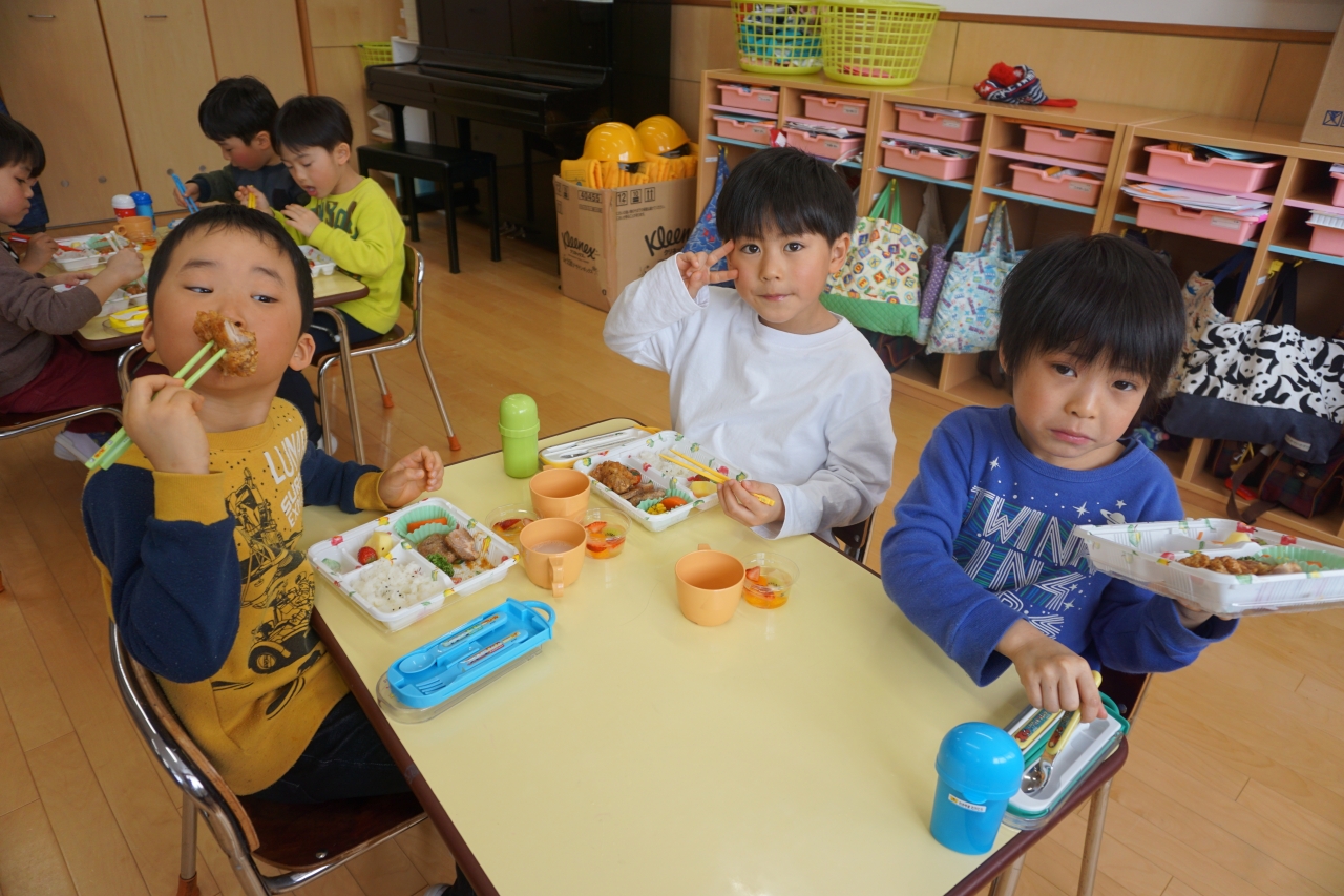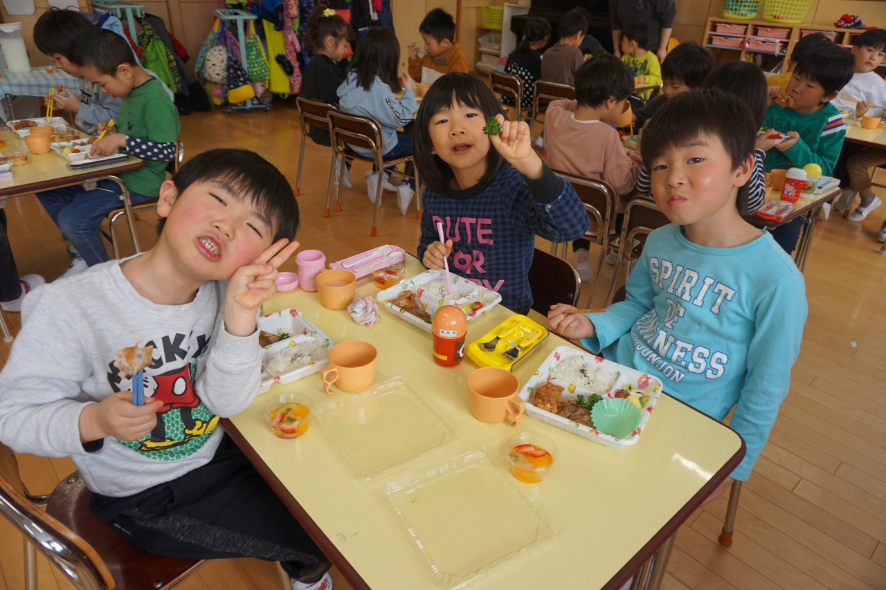 この日の給食はお楽しみお弁当!から揚げやハンバーグなどみんなの大好きなものがたくさんあり、年長組さんはおかわり分も全部ペロリと食べました!