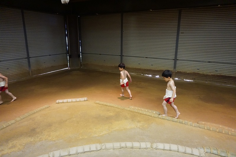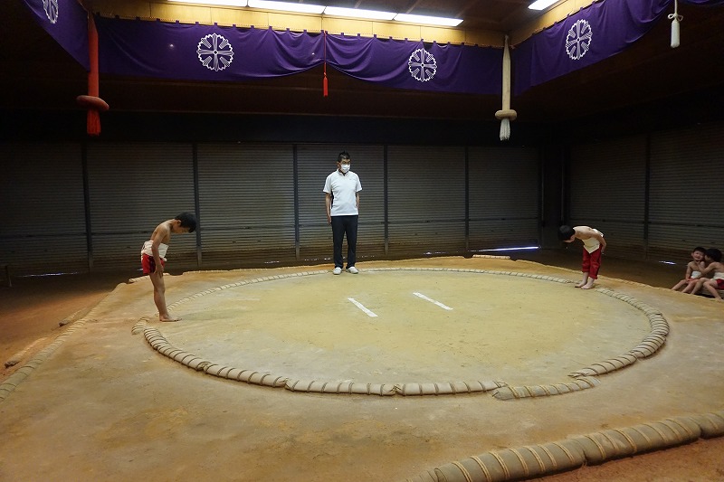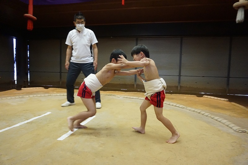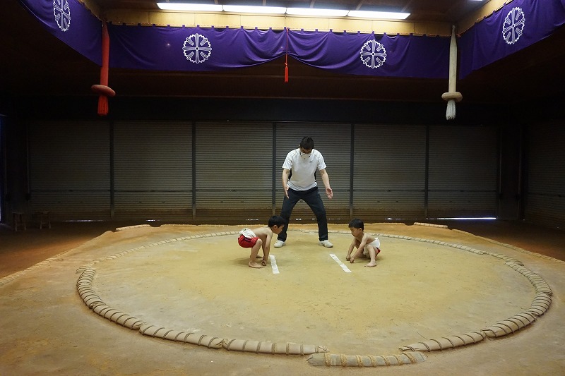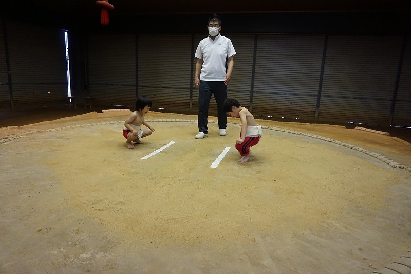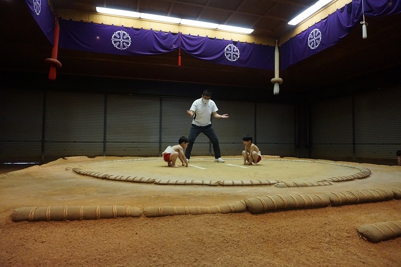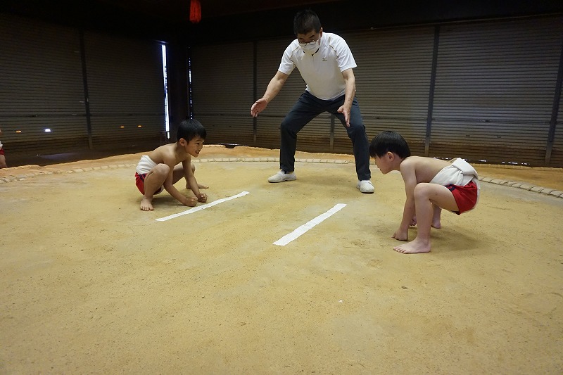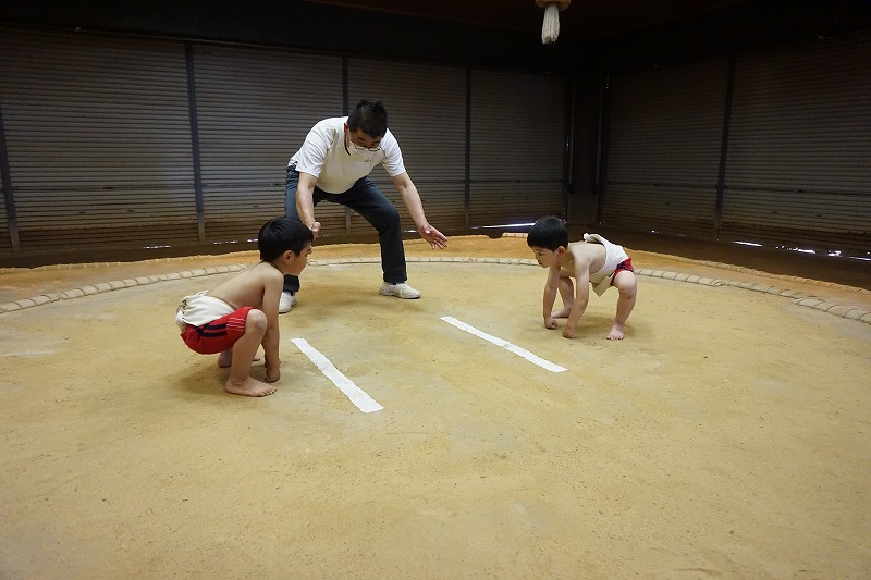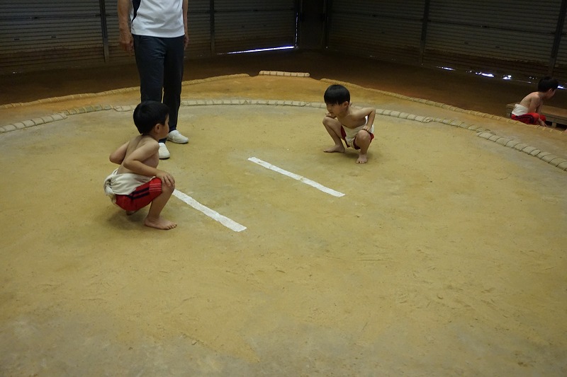 子どもたちも初めて見る相撲場にドキドキワクワク。講師の先生が一人ひとりにまわしをつけて下さり、相撲をとる意欲もどんどん高まっていました。