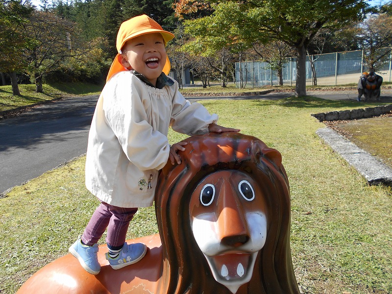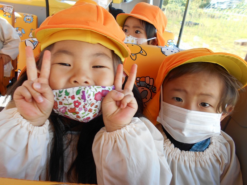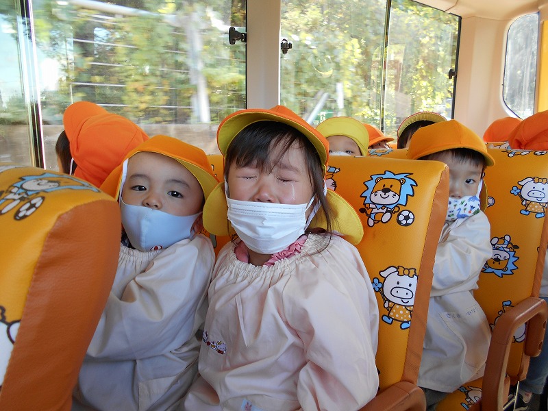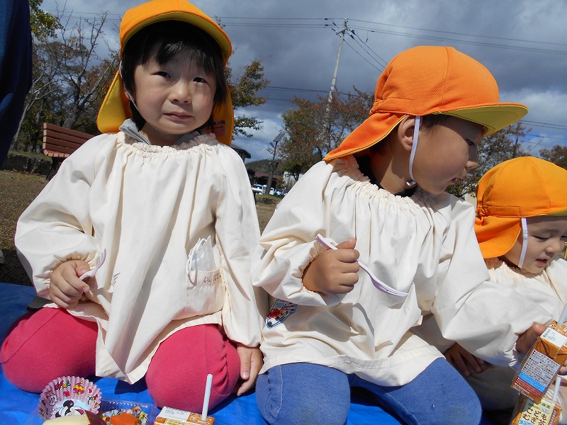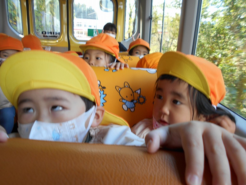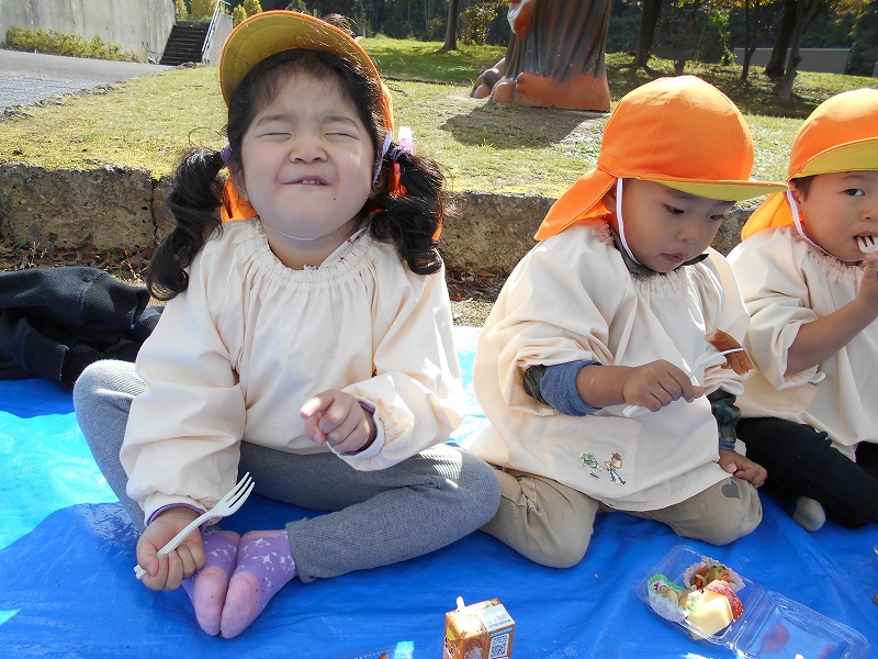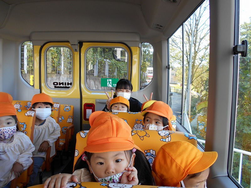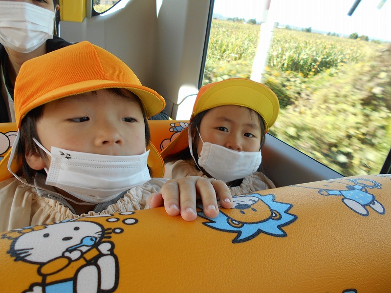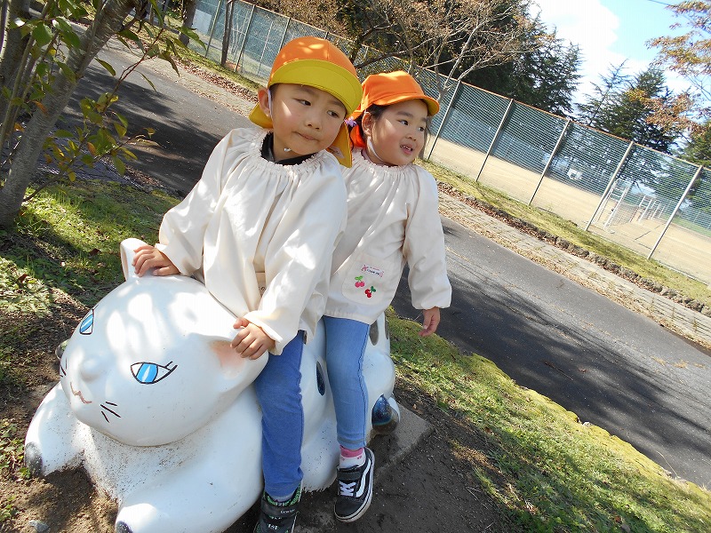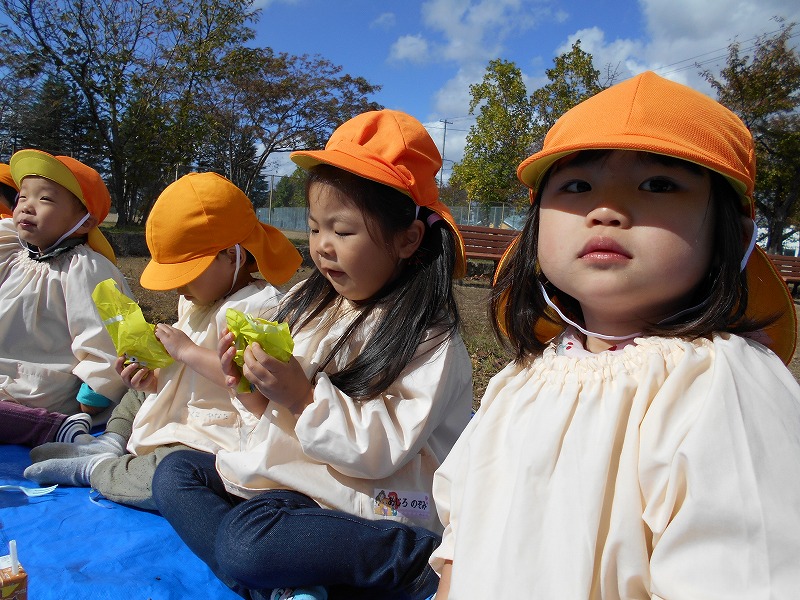 10月21日(木)高畠町の「高畠中央公園」へ園外保育に行ってきました。うさぎバスに乗るのはみんな初めて!「いってきまーす」と元気に出発しました。ブランコや滑り台などの遊具ででいっぱい遊び、昼食は給食の先生が作ってくれたお弁当。みんな「おいしい~」と喜んで食べました。