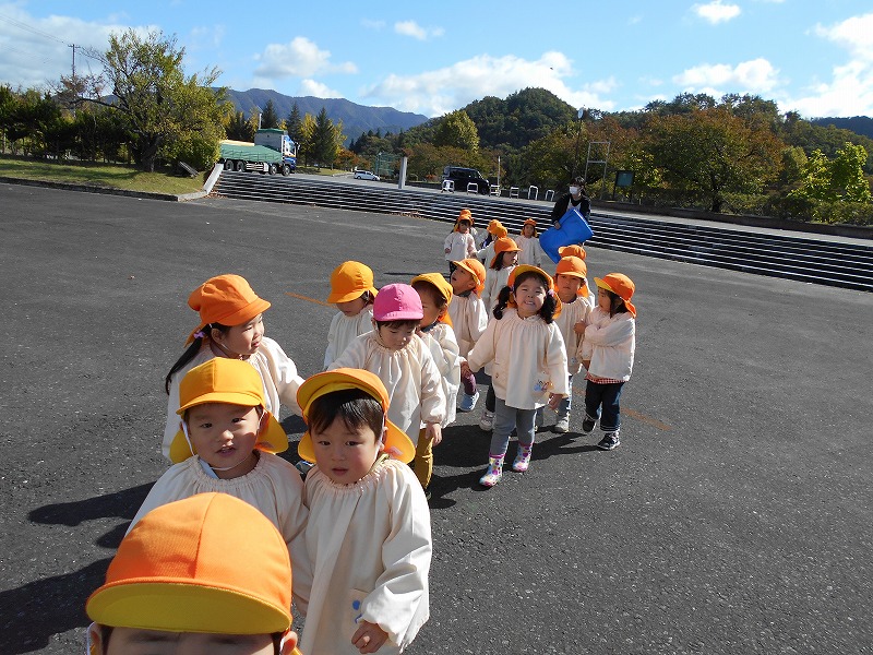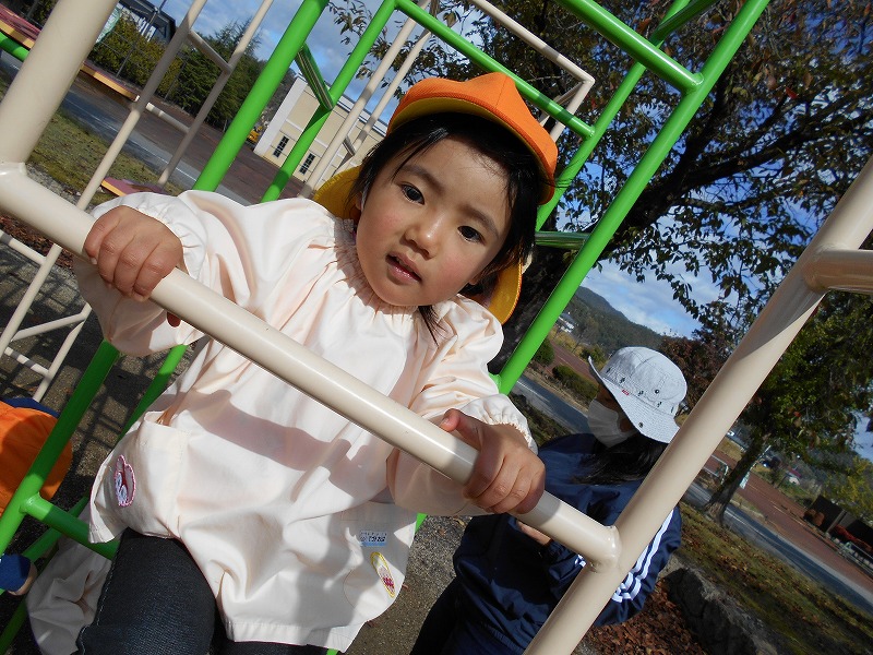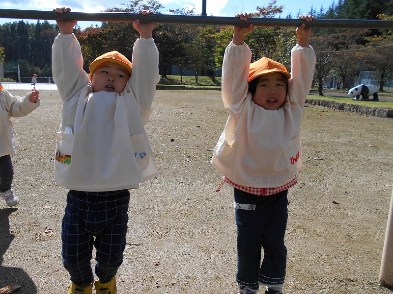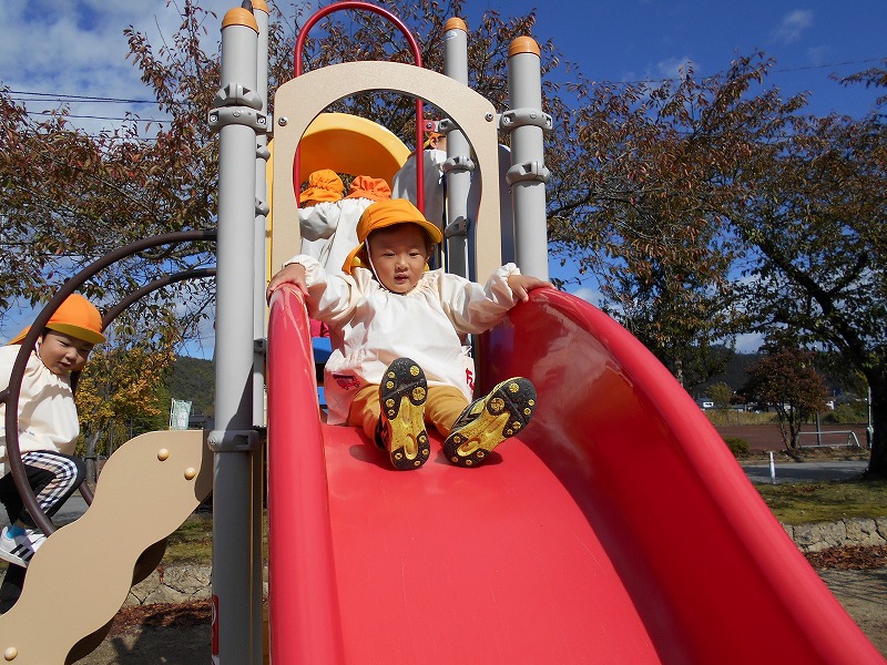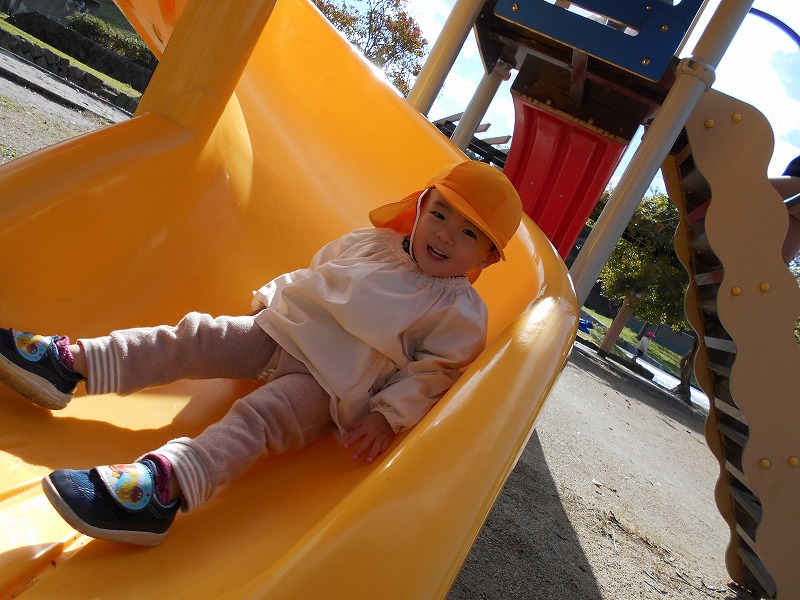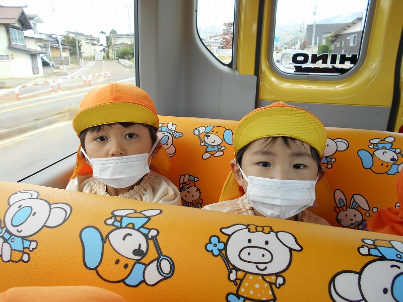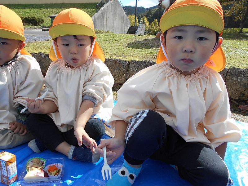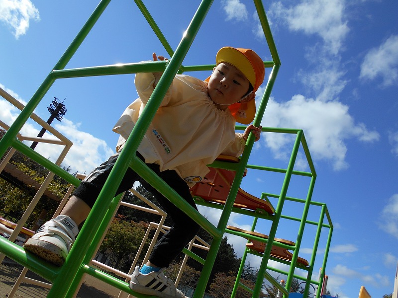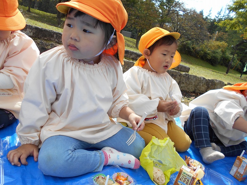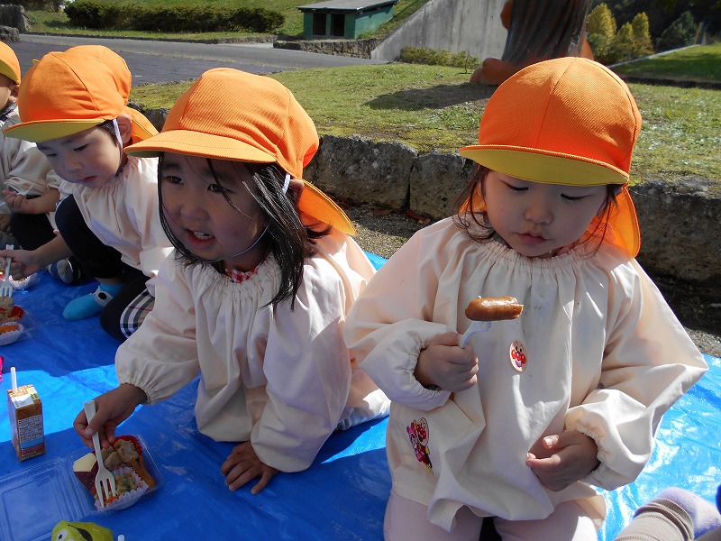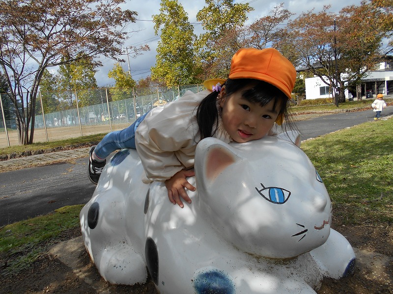 10月21日(木)高畠町の「高畠中央公園」へ園外保育に行ってきました。うさぎバスに乗るのはみんな初めて!「いってきまーす」と元気に出発しました。ブランコや滑り台などの遊具ででいっぱい遊び、昼食は給食の先生が作ってくれたお弁当。みんな「おいしい~」と喜んで食べました。
