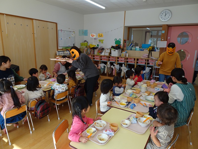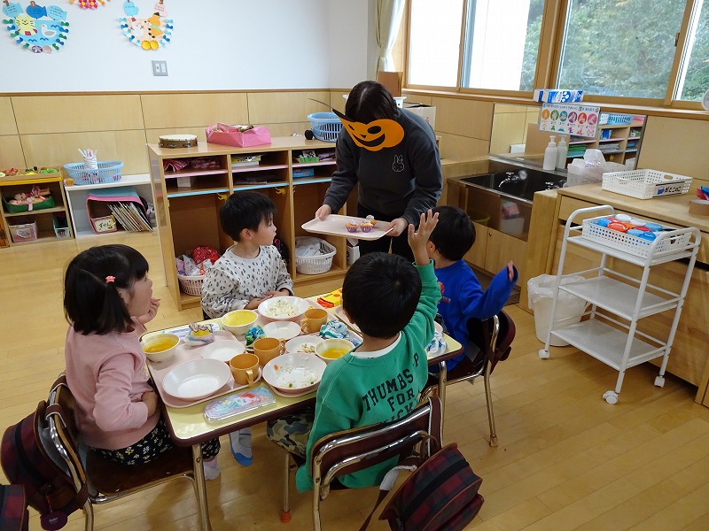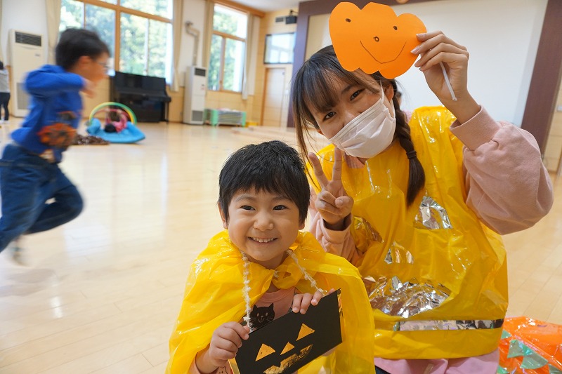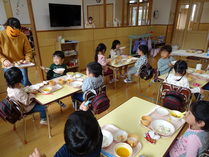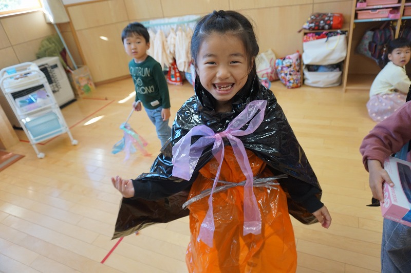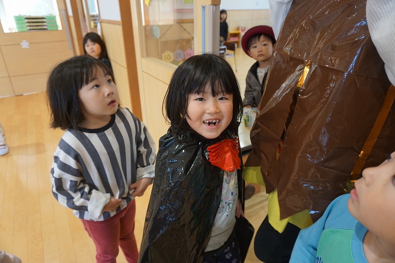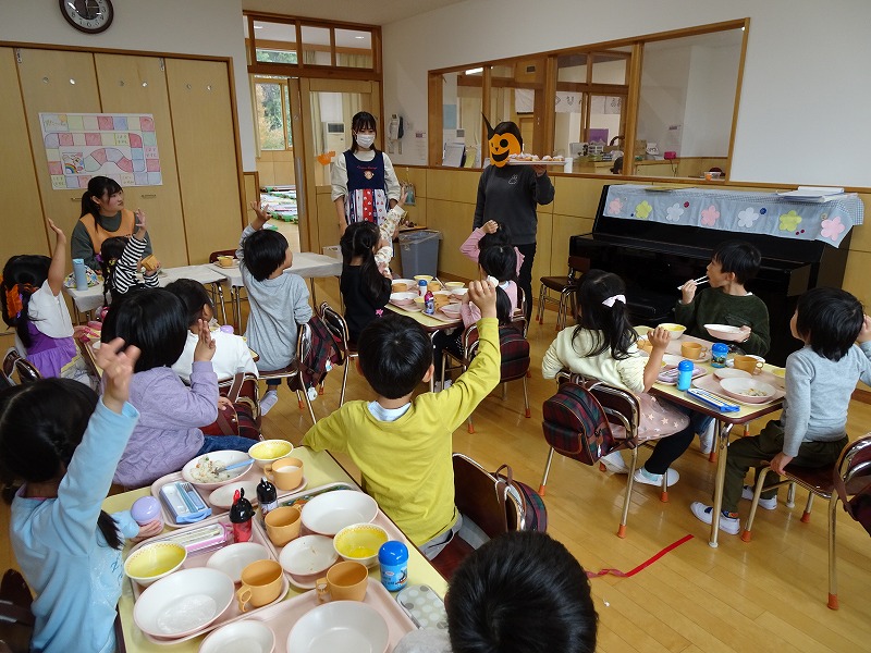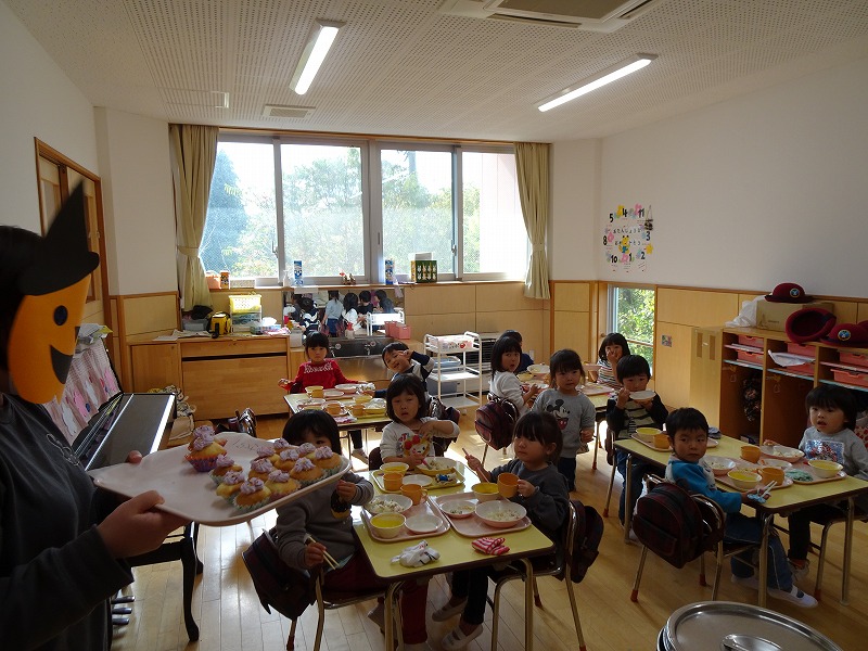 ハロウィンは10月31日ですが、今年は日曜日だったので29日(金)にハロウィンを楽しみました。自分たちで作ったオバケの服で仮装をしたり、ハロウィンダンスを踊ったり、かわいいオバケさんがいっぱい!給食の時間にはジャックオランタンに仮装した給食の先生がパンプキンケーキを持って来てくれました。「トリックオアトリート!」と言ってケーキを配ってもらい、とっても嬉しそうでした。