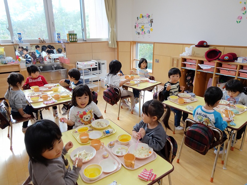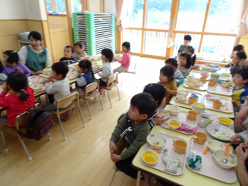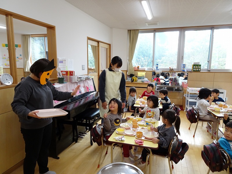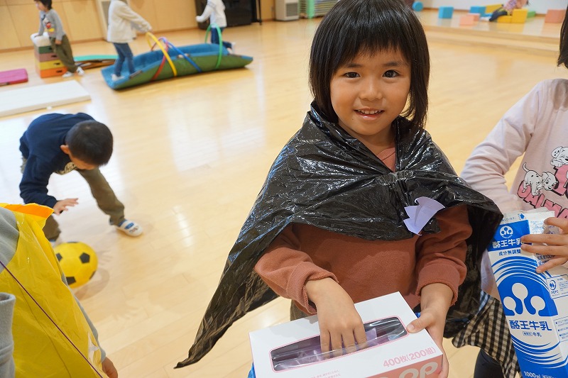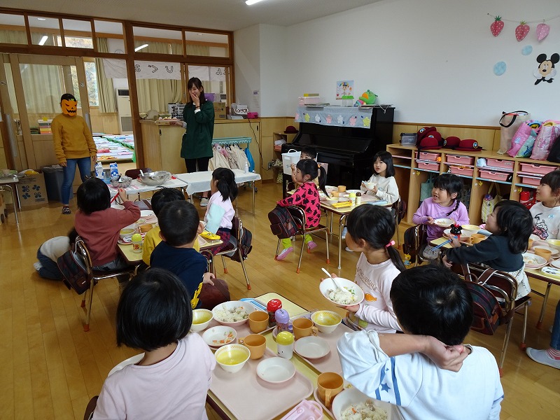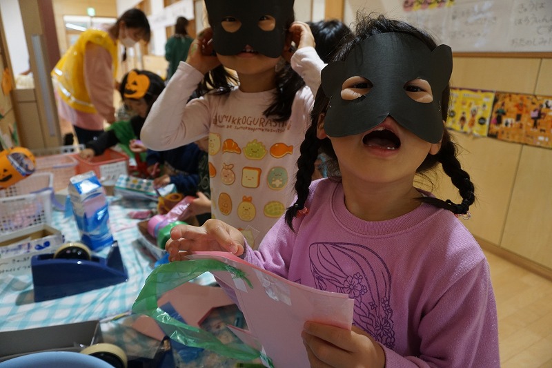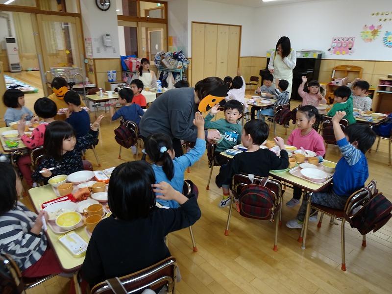 ハロウィンは10月31日ですが、今年は日曜日だったので29日(金)にハロウィンを楽しみました。自分たちで作ったオバケの服で仮装をしたり、ハロウィンダンスを踊ったり、かわいいオバケさんがいっぱい!給食の時間にはジャックオランタンに仮装した給食の先生がパンプキンケーキを持って来てくれました。「トリックオアトリート!」と言ってケーキを配ってもらい、とっても嬉しそうでした。