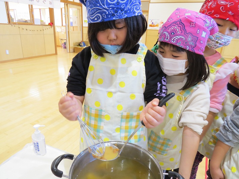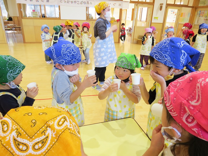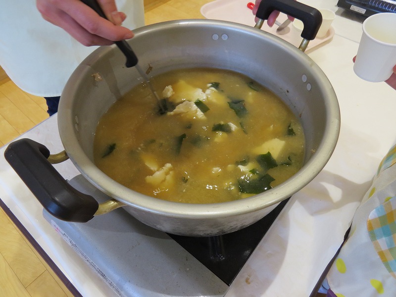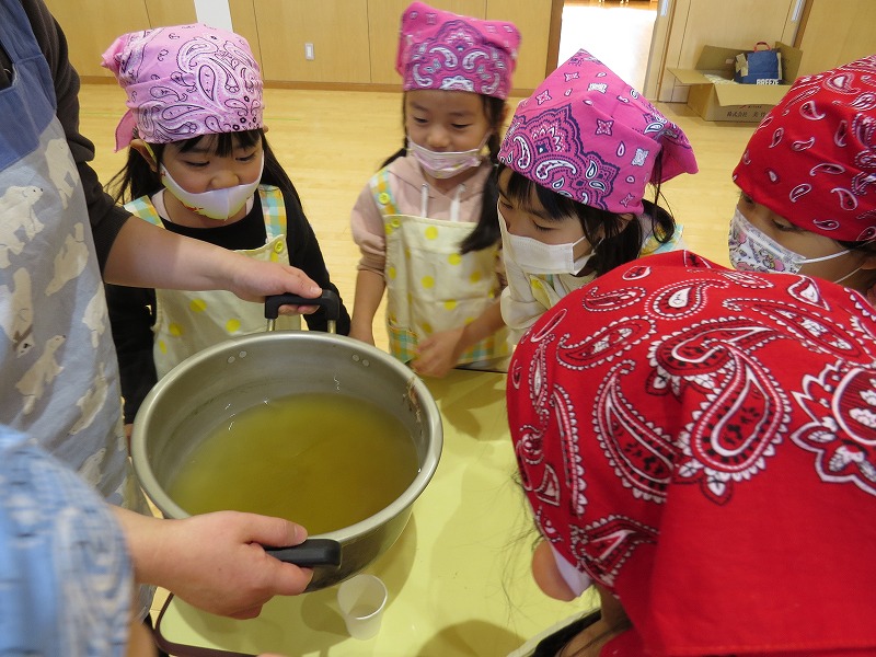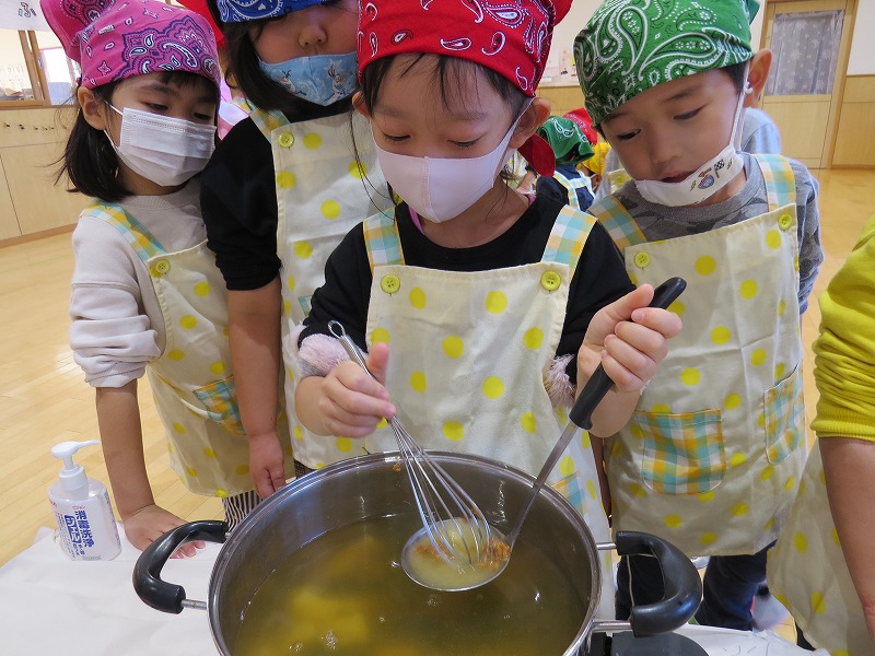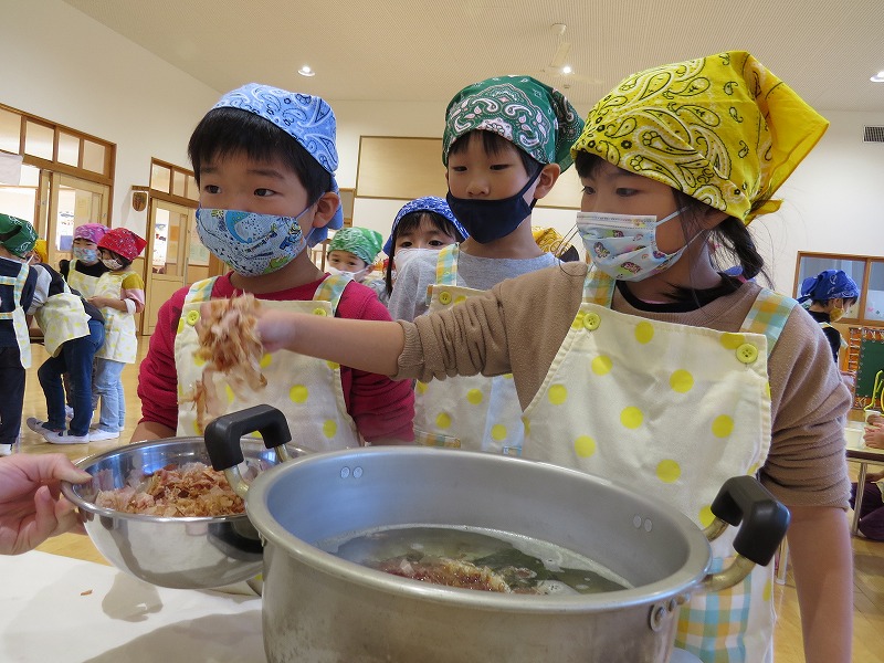 ふじ組さんがお味噌汁作りを行いました。管理栄養士の我彦先生から出汁についての話を聞いた後、昆布とかつお節で出汁をとり、豆腐のお味噌汁を作りました。最初は昆布で出汁をとり、味見。次にかつお節で出汁をとり、味見。味の違いに気づいた子どもたちからは、様々な感想が聞こえてきました。豆腐をスプーンですくって入れ、味噌を溶いたらお味噌汁の完成!「おいしい!」と自分たちで作ったお味噌汁は格別だったようです。