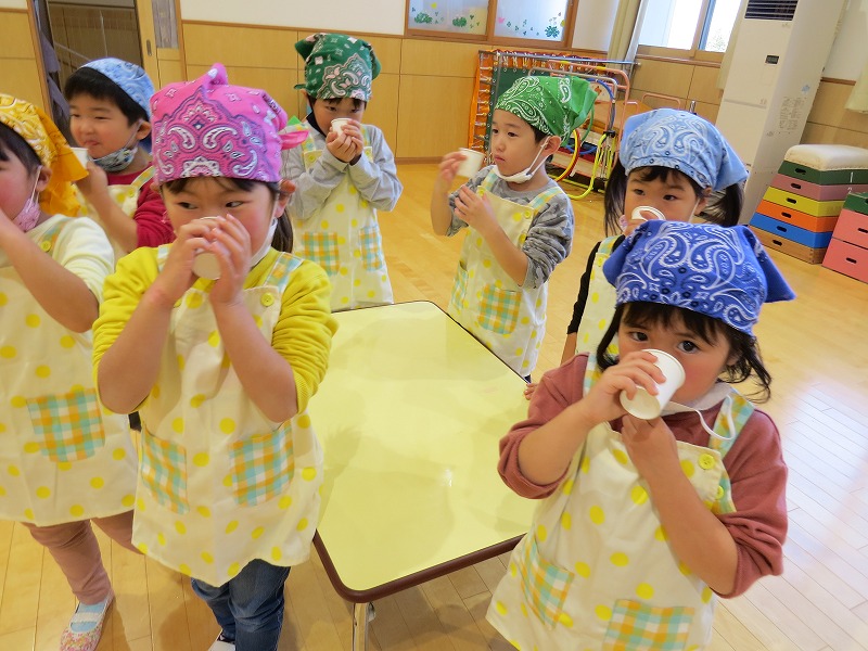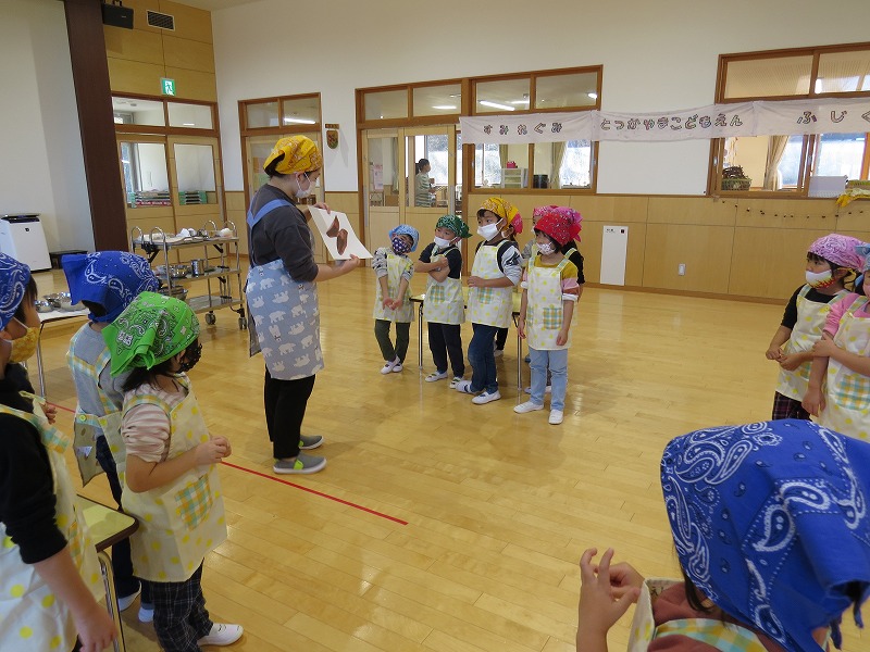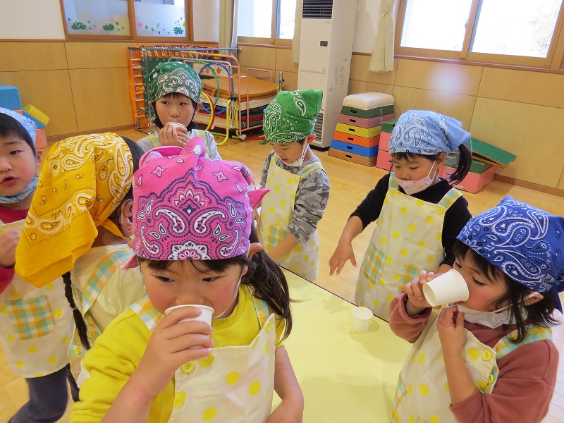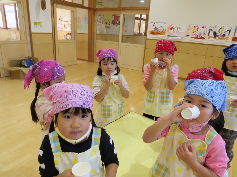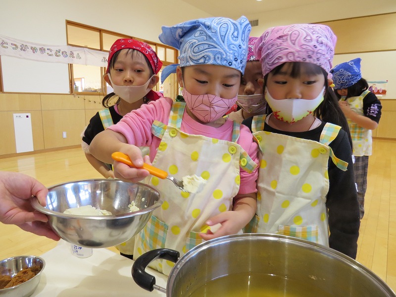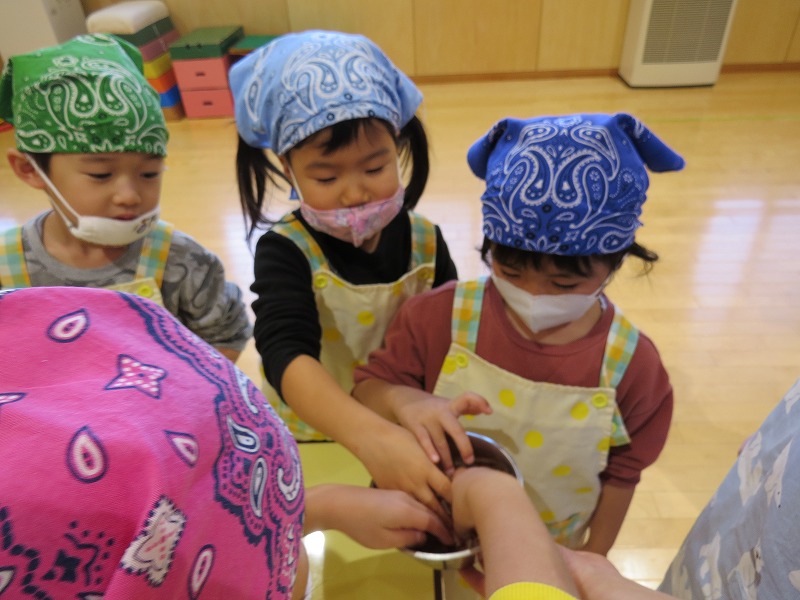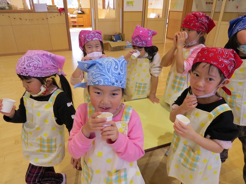 ふじ組さんがお味噌汁作りを行いました。管理栄養士の我彦先生から出汁についての話を聞いた後、昆布とかつお節で出汁をとり、豆腐のお味噌汁を作りました。最初は昆布で出汁をとり、味見。次にかつお節で出汁をとり、味見。味の違いに気づいた子どもたちからは、様々な感想が聞こえてきました。豆腐をスプーンですくって入れ、味噌を溶いたらお味噌汁の完成!「おいしい!」と自分たちで作ったお味噌汁は格別だったようです。