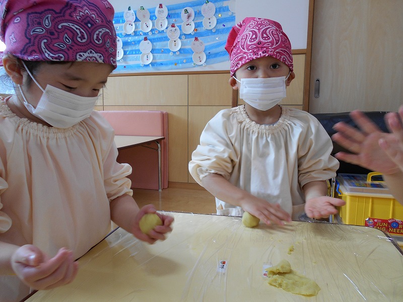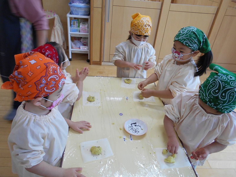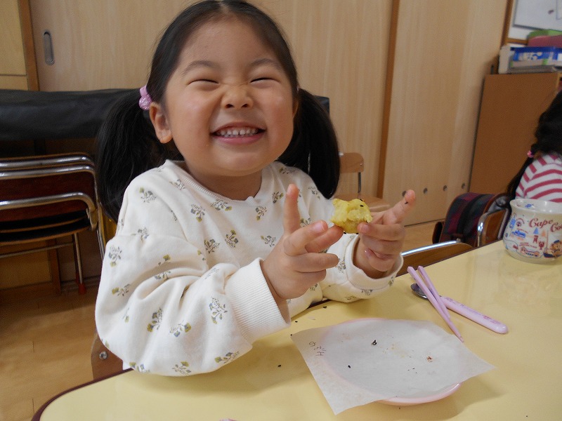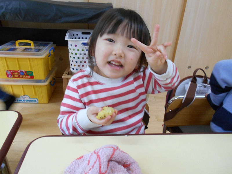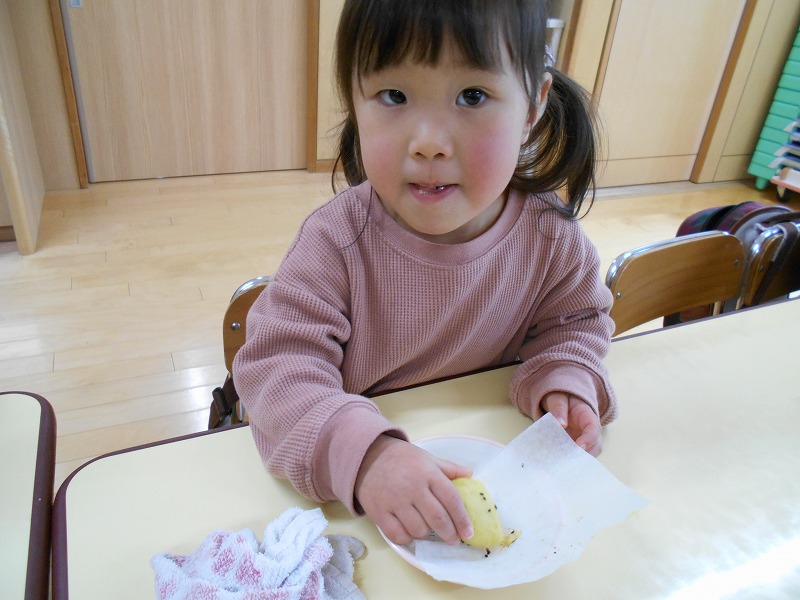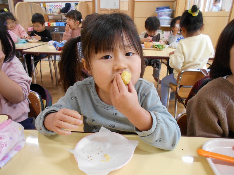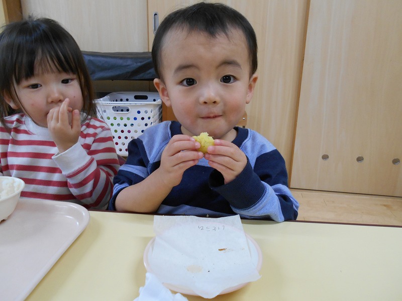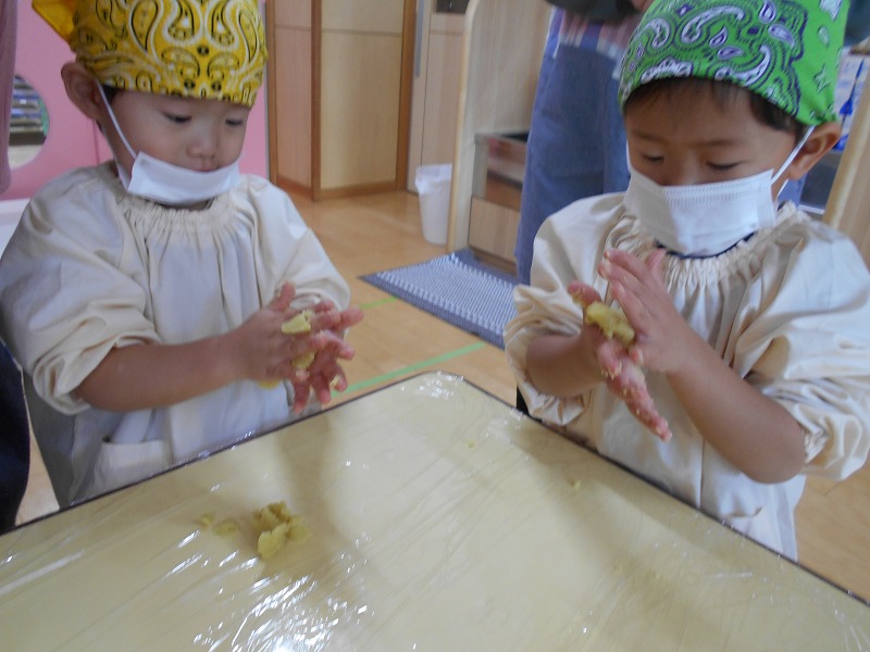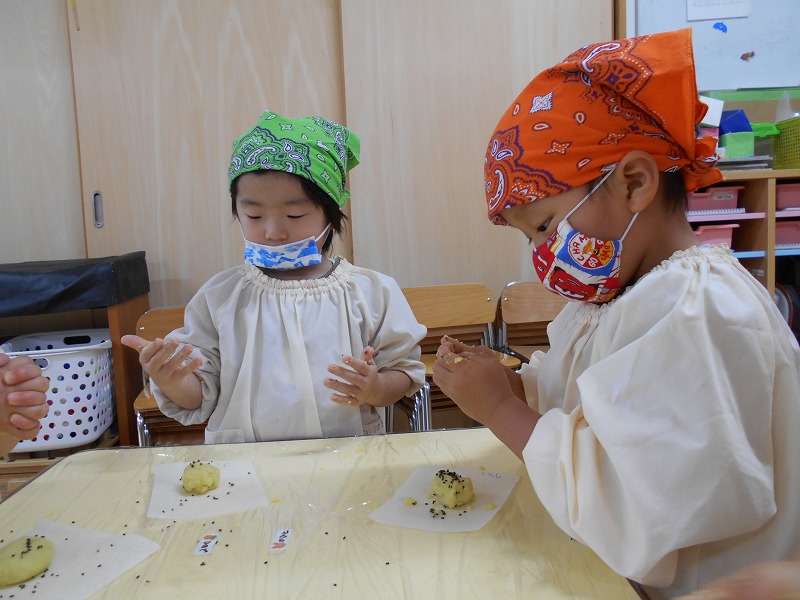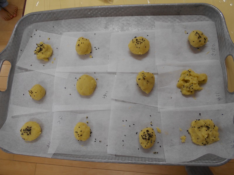 蒸したサツマイモを袋に入れ、柔らかくなるまで手でもみもみ。袋から出したら、つぶれなうように優しく転がしながら丸にしました。ゴマをふりかけ、給食室で焼いてもらったら完成!おいしいスイートポテトにみんなのお顔もほっこりにこにこでした。