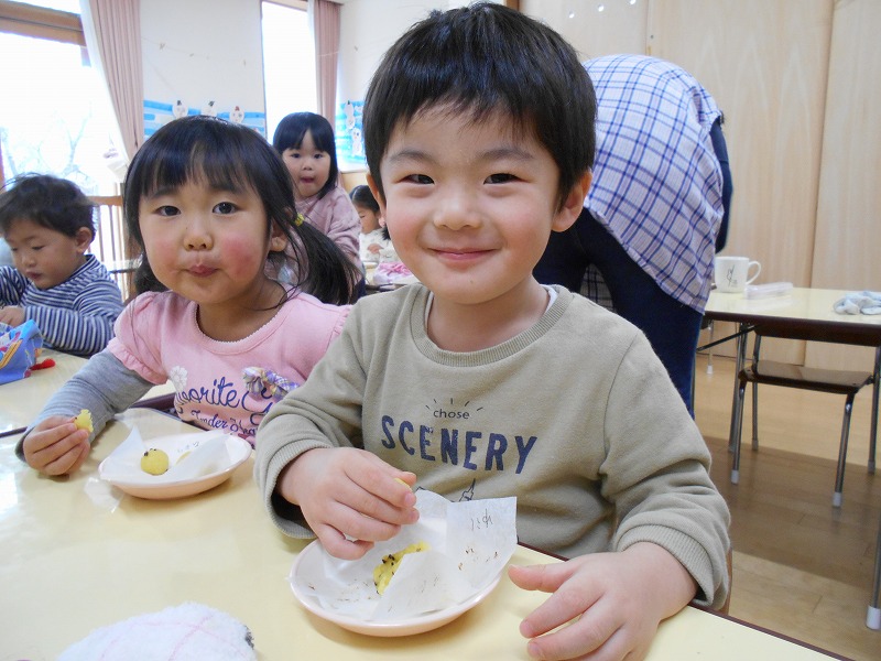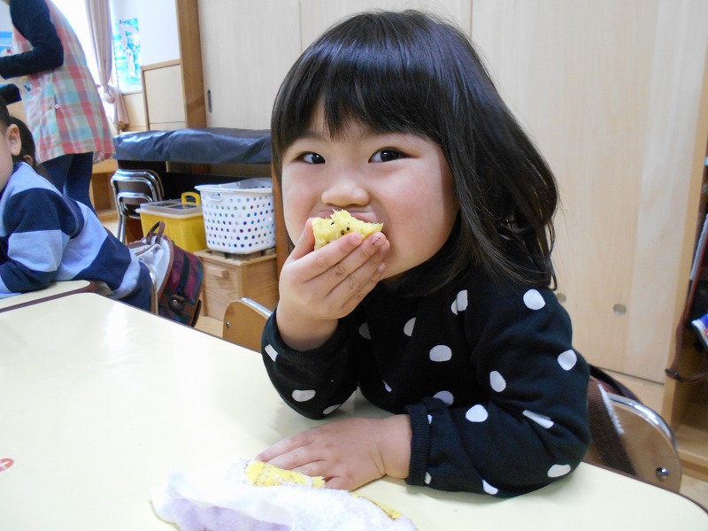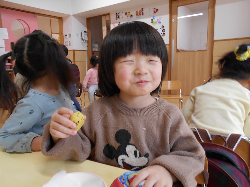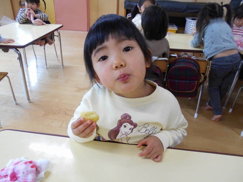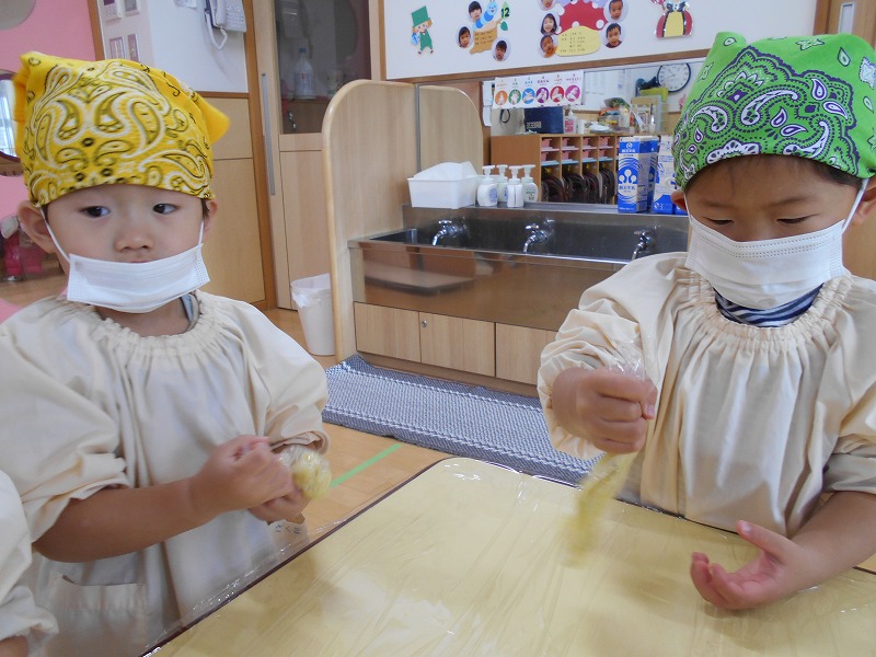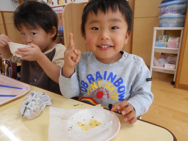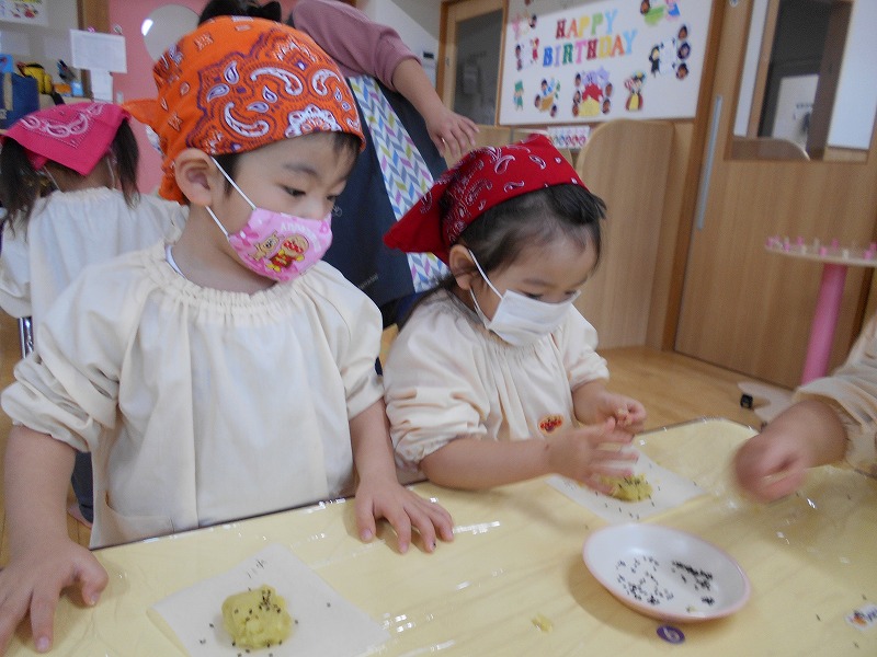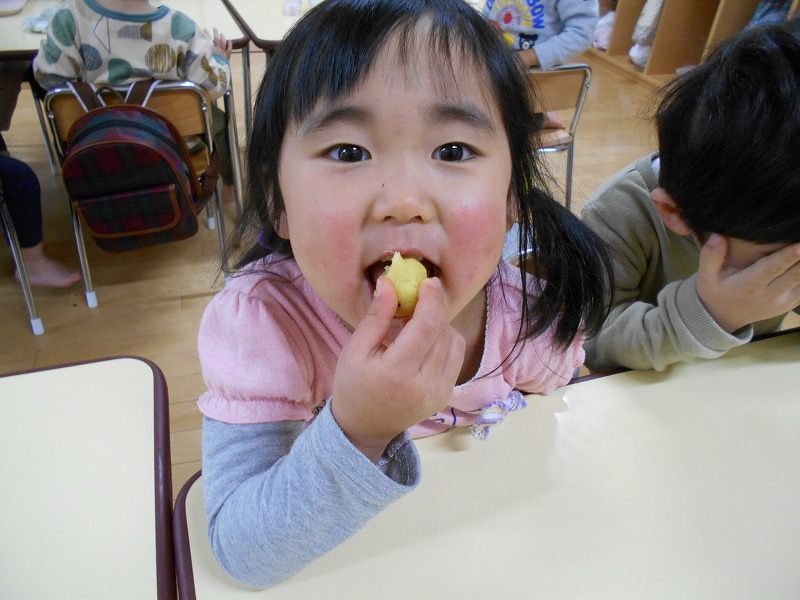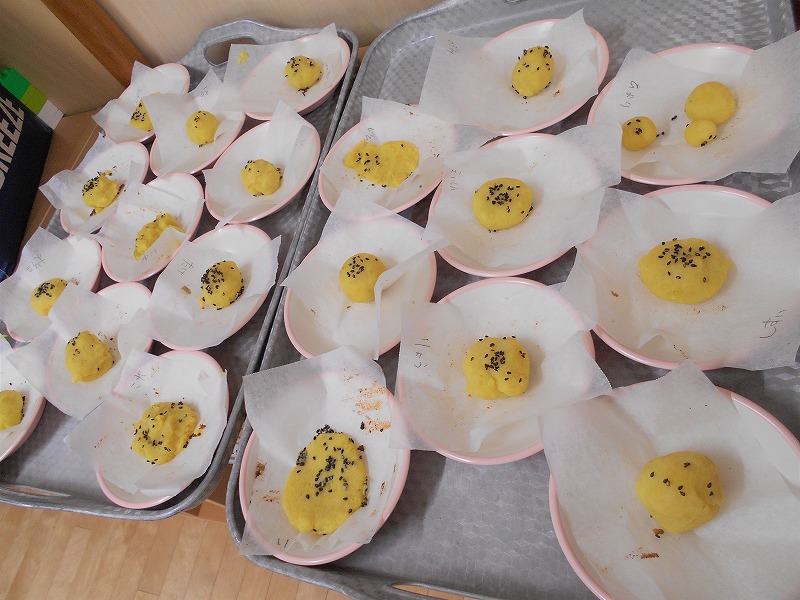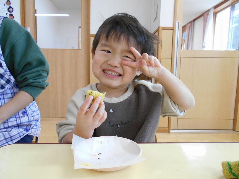 蒸したサツマイモを袋に入れ、柔らかくなるまで手でもみもみ。袋から出したら、つぶれなうように優しく転がしながら丸にしました。ゴマをふりかけ、給食室で焼いてもらったら完成!おいしいスイートポテトにみんなのお顔もほっこりにこにこでした。