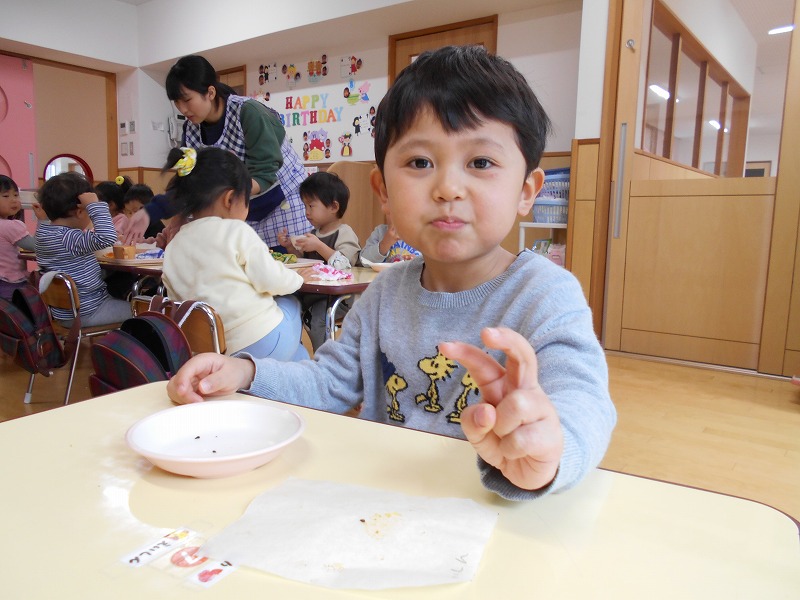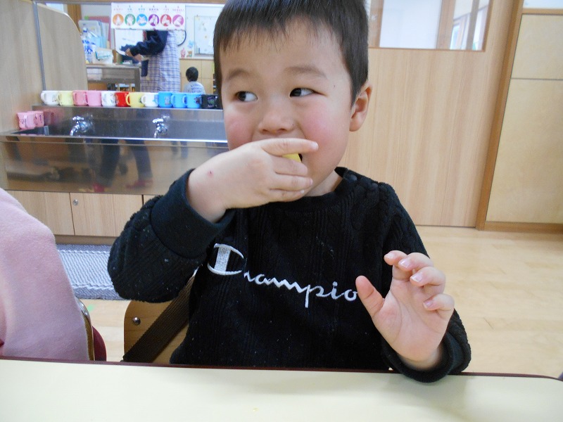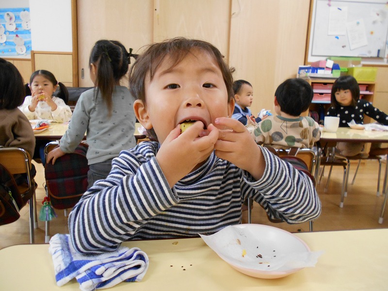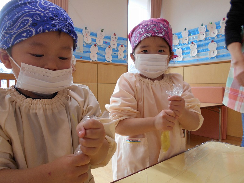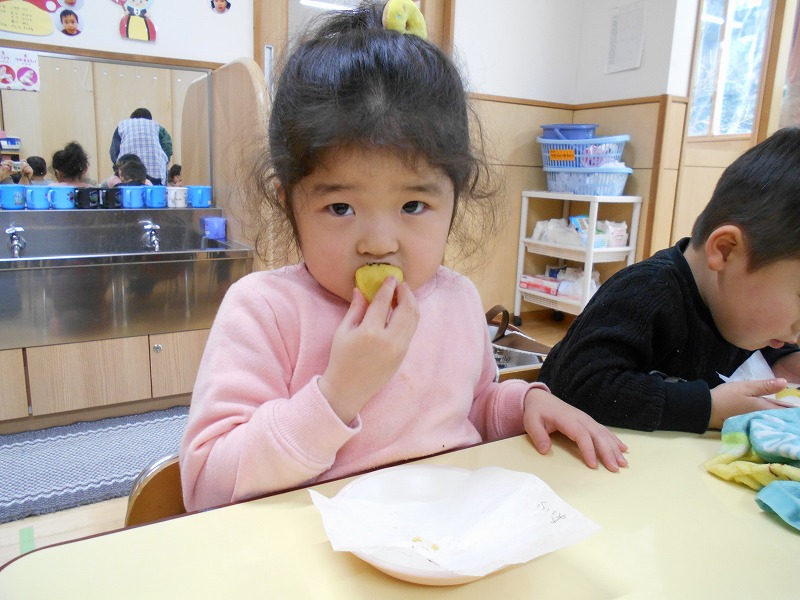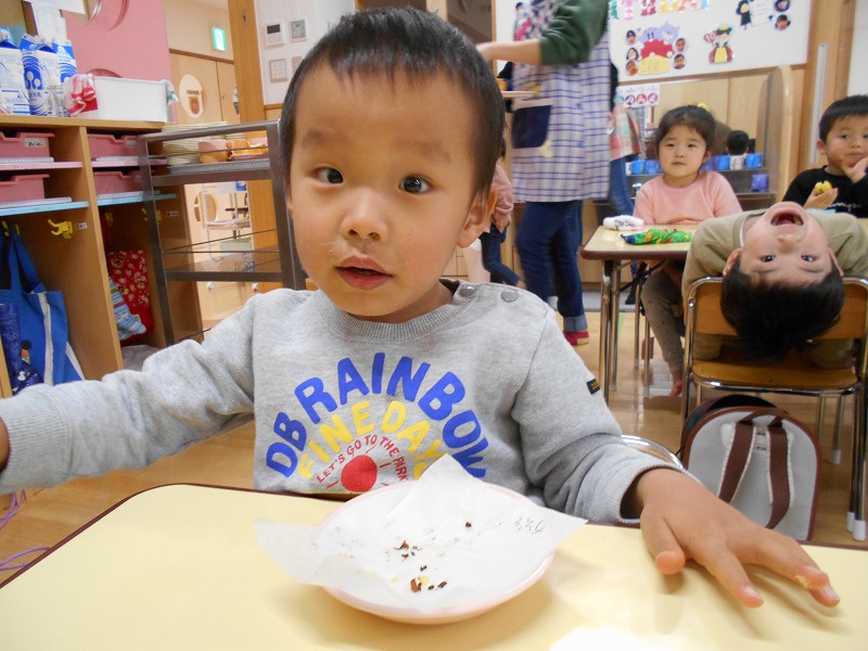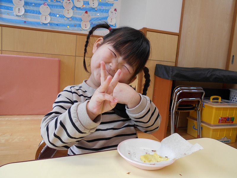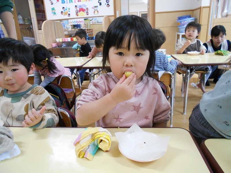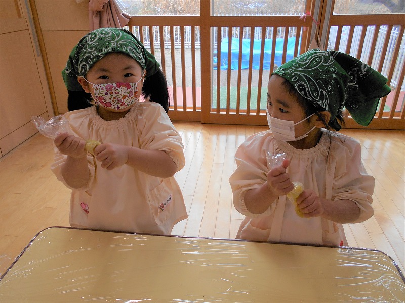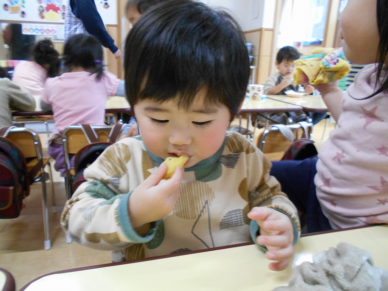 蒸したサツマイモを袋に入れ、柔らかくなるまで手でもみもみ。袋から出したら、つぶれなうように優しく転がしながら丸にしました。ゴマをふりかけ、給食室で焼いてもらったら完成!おいしいスイートポテトにみんなのお顔もほっこりにこにこでした。