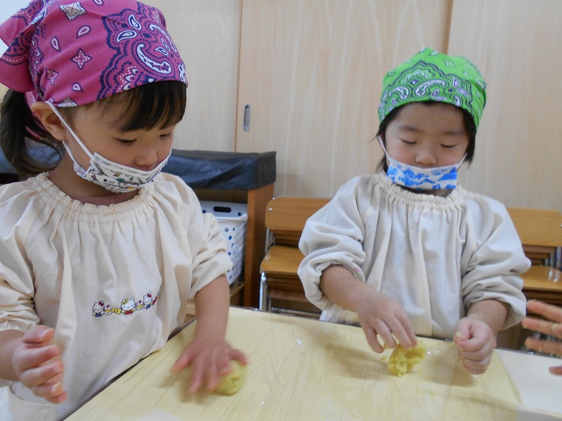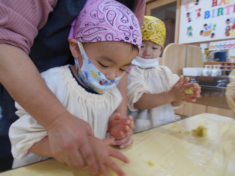 ぱんだ組さんがスイートポテト作りをしました。「スイートポテト作る!」と楽しみに登園したお友だちも多く、朝からワクワクのぱんだ組さん。栄養士の我彦先生に教えてもらいながら作りました。