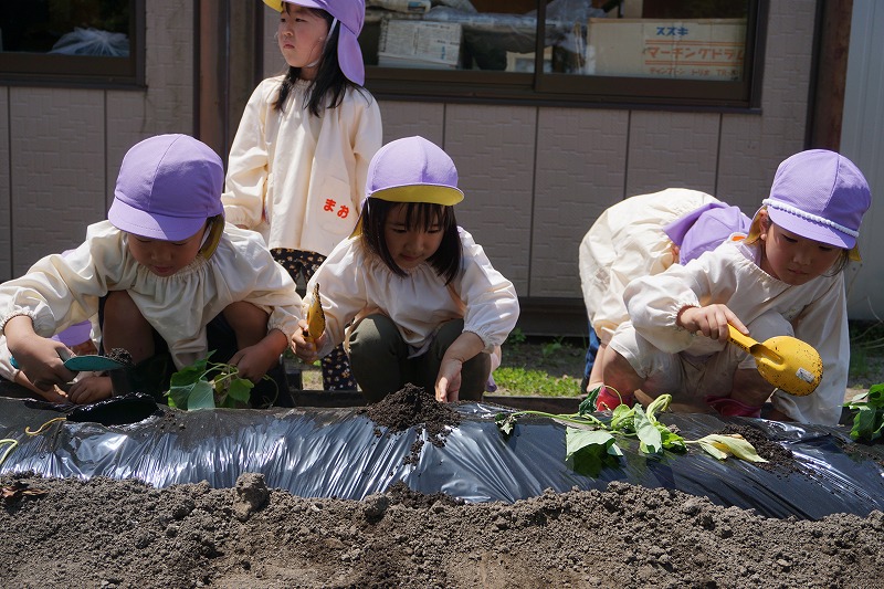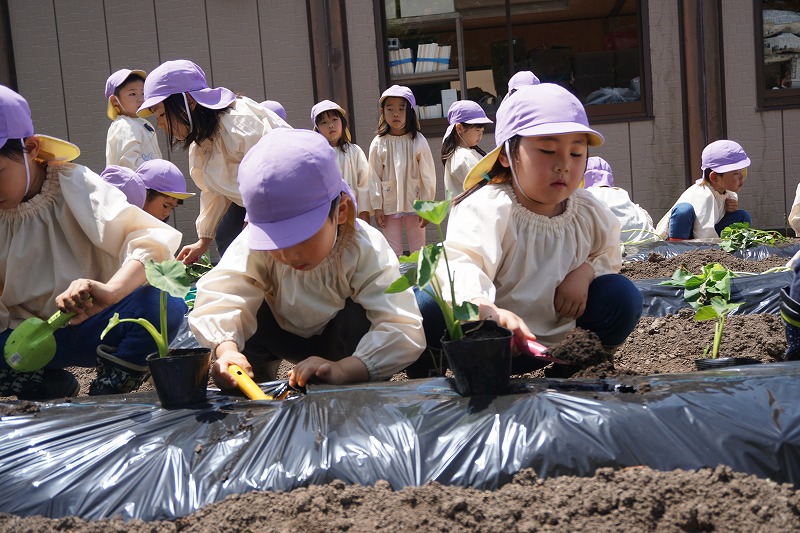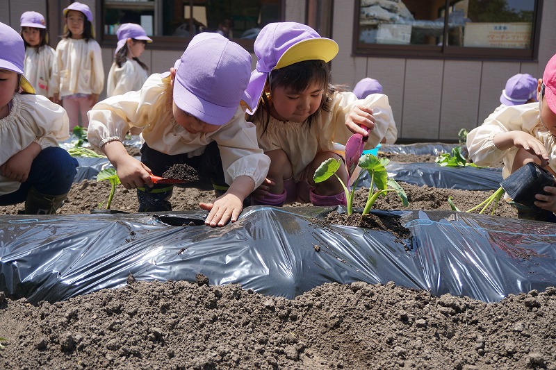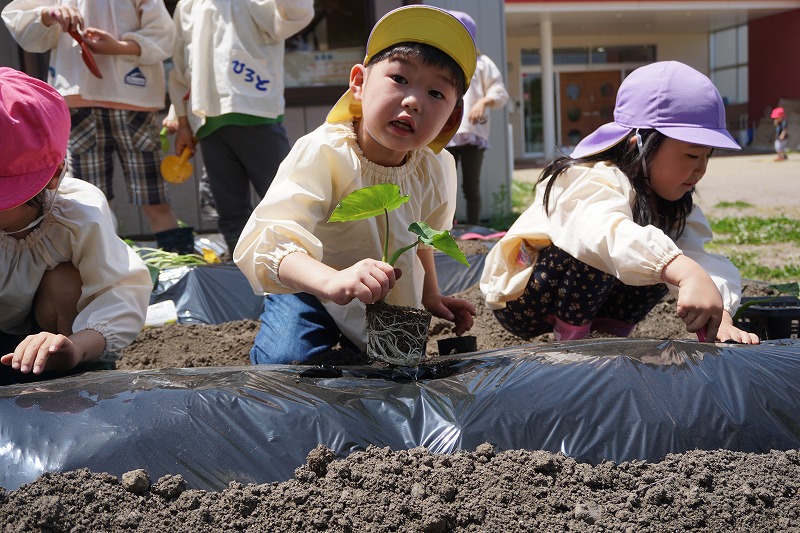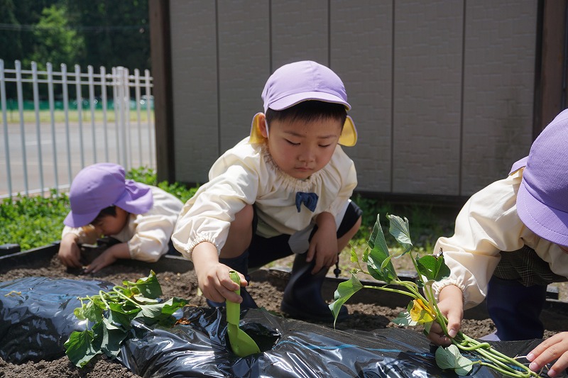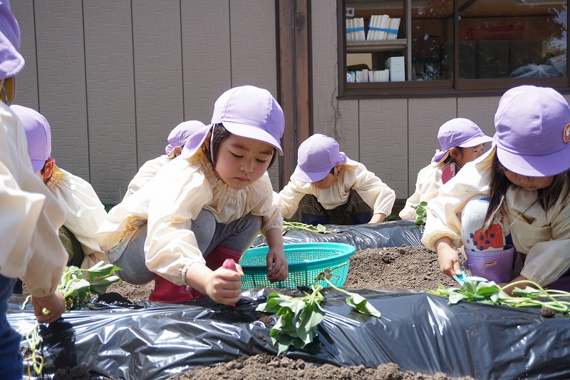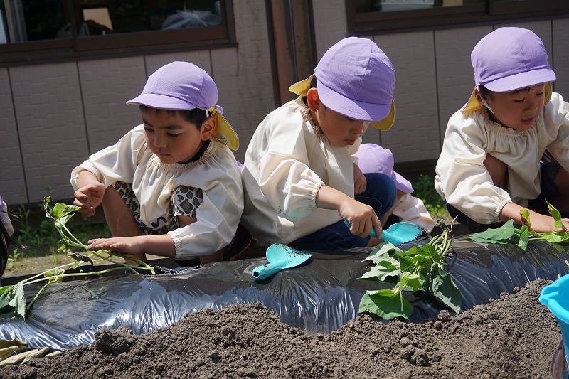 ふじ組さんがトマト・サツマイモ・里芋の苗植えをしました。苗を見るとサツマイモとトマトはすぐに名前が出てきましたが、里芋の苗を見ると「・・・」の子ども達。初めて見る里芋の苗に興味津々でした。秋の収穫が楽しみですね!