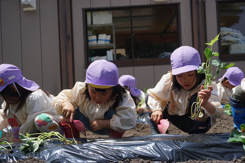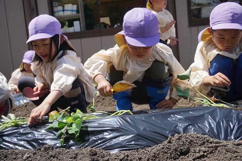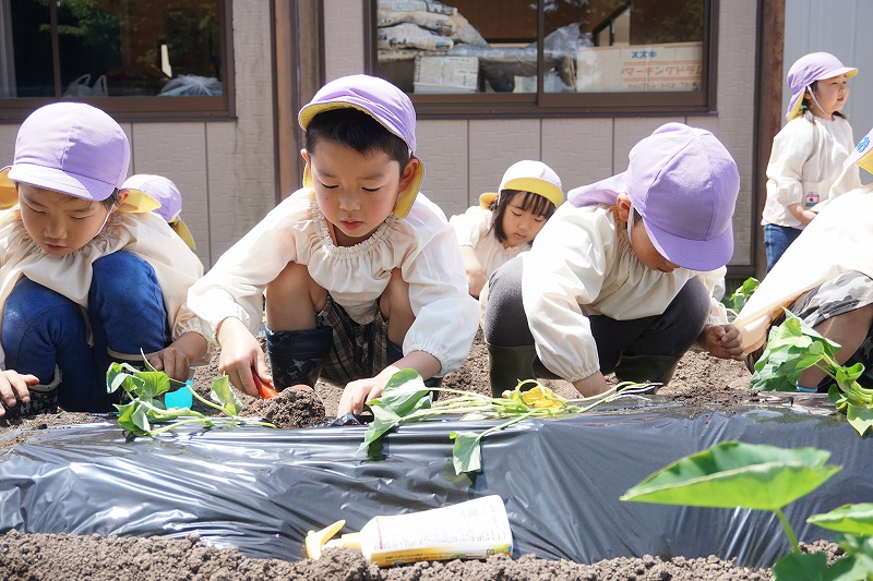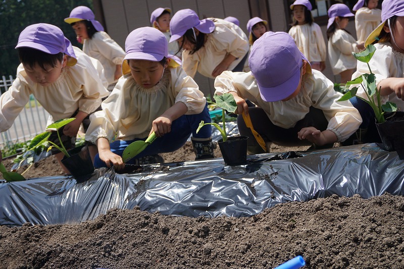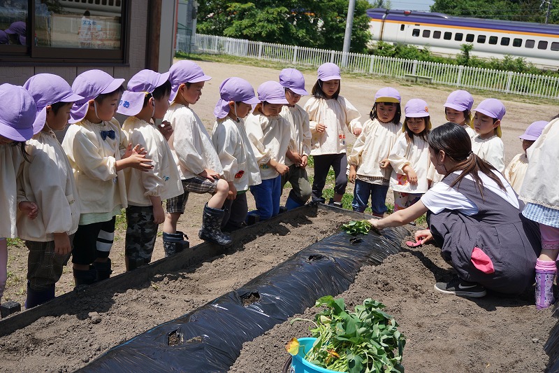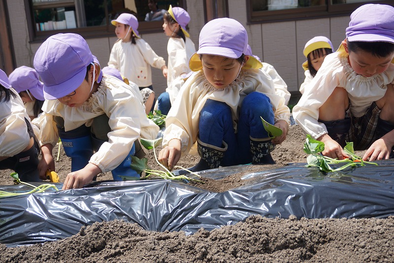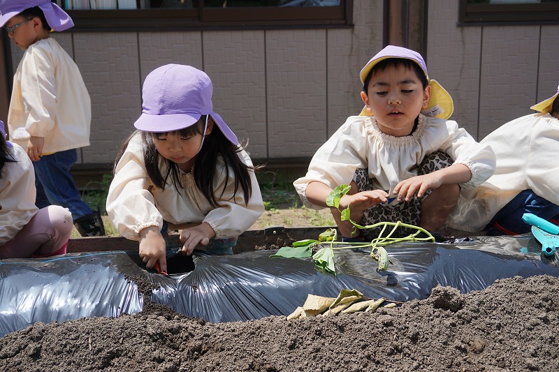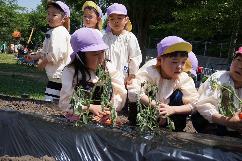 ふじ組さんがトマト・サツマイモ・里芋の苗植えをしました。苗を見るとサツマイモとトマトはすぐに名前が出てきましたが、里芋の苗を見ると「・・・」の子ども達。初めて見る里芋の苗に興味津々でした。秋の収穫が楽しみですね!