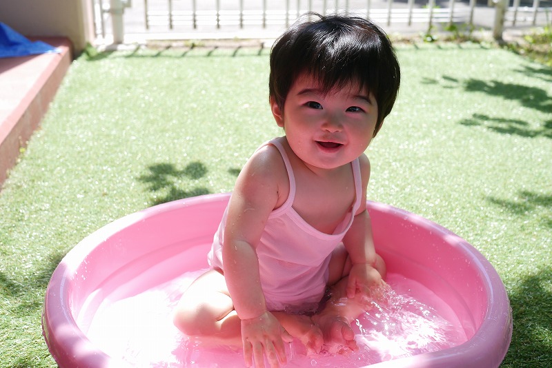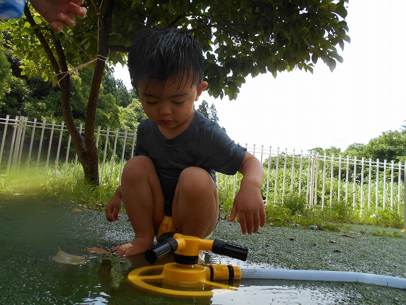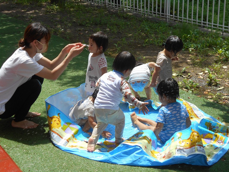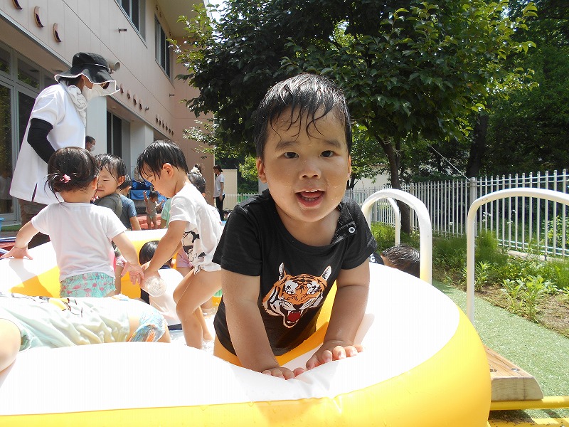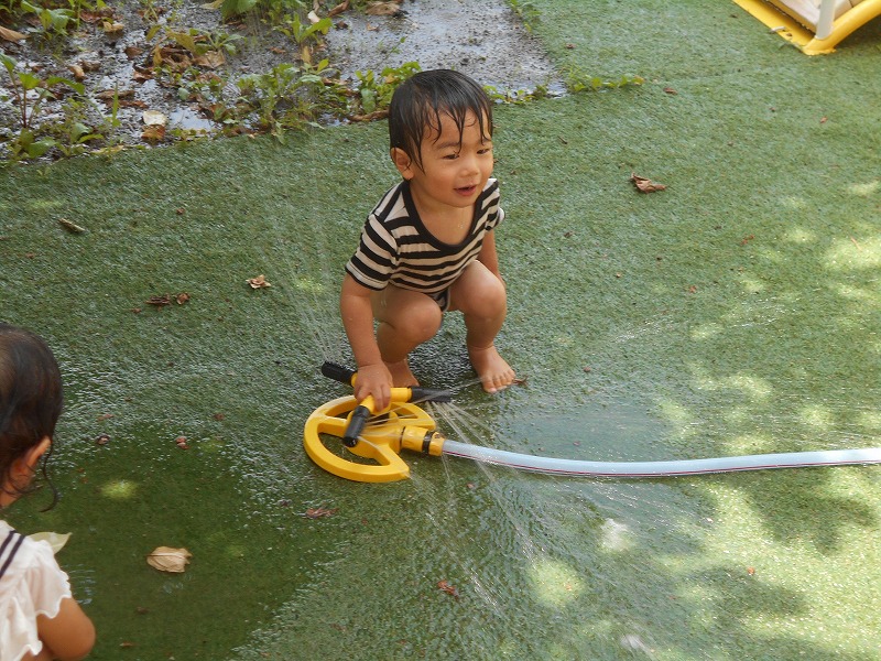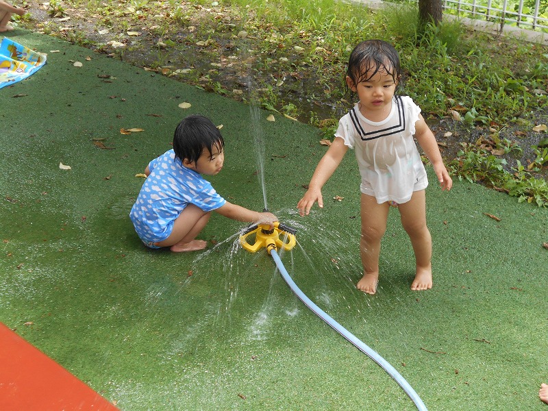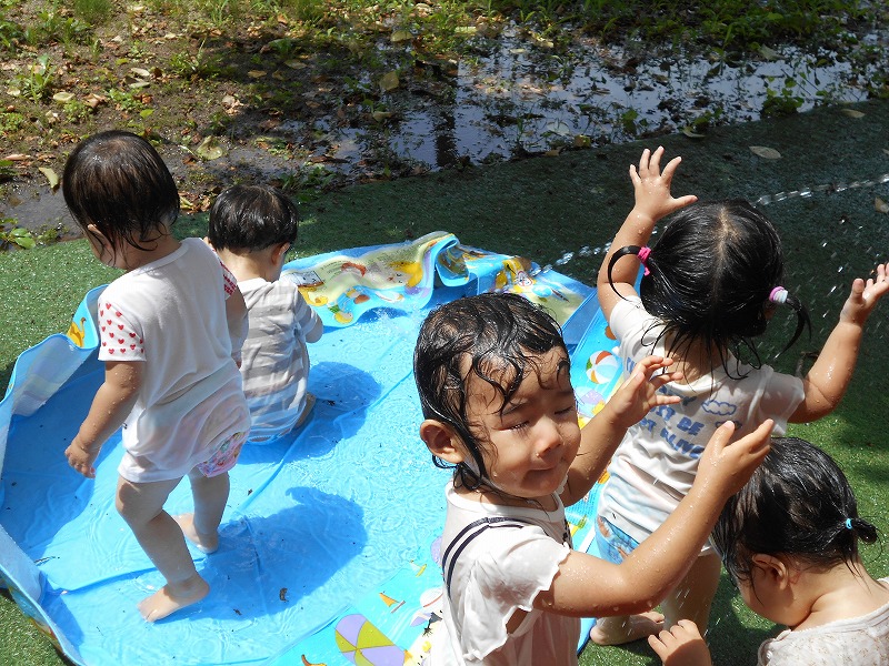 スプリンクラーの水を浴びたり、プールに入って遊んだり、テラスで水あそびを楽しでいます。ちょっぴり水が苦手なお友だちは水を入れたビニール袋を触ったり、たらいに入った水で遊んだりしながら楽しんでいます。