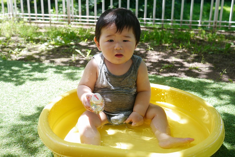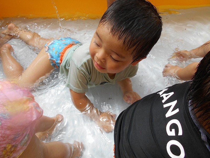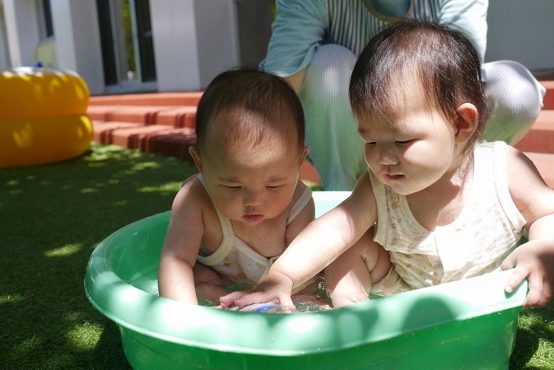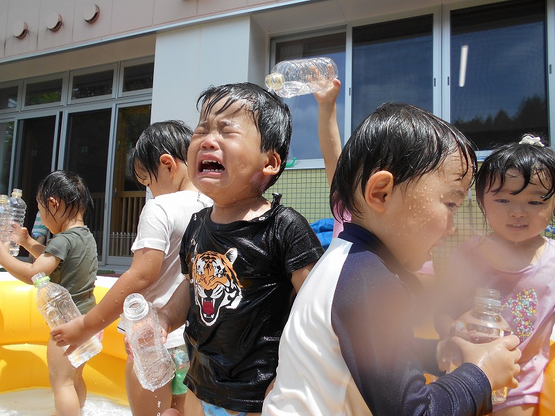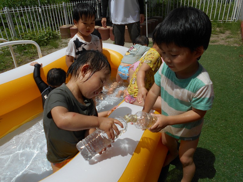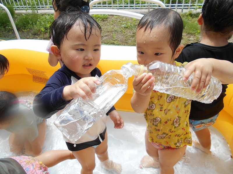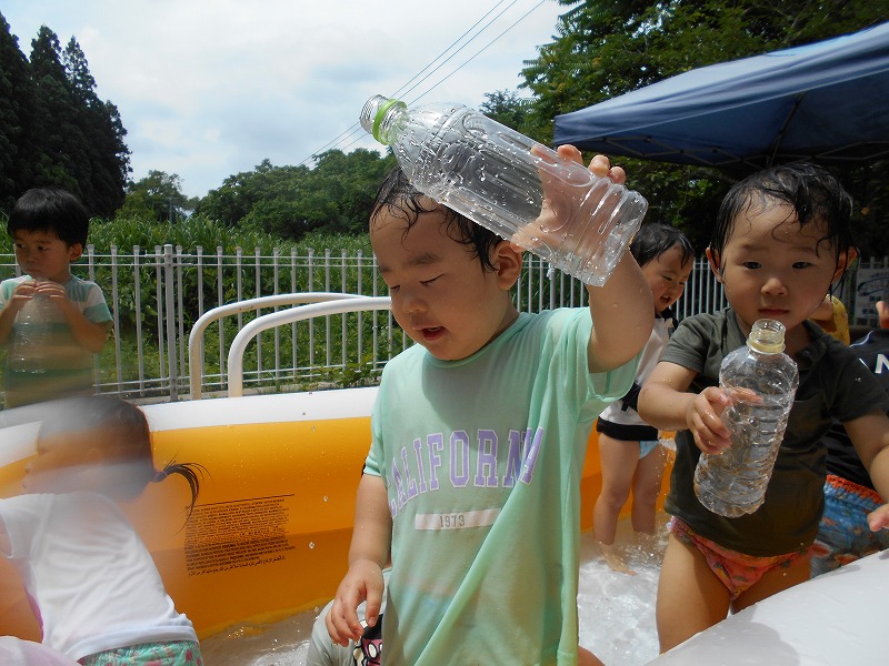 スプリンクラーの水を浴びたり、プールに入って遊んだり、テラスで水あそびを楽しでいます。ちょっぴり水が苦手なお友だちは水を入れたビニール袋を触ったり、たらいに入った水で遊んだりしながら楽しんでいます。