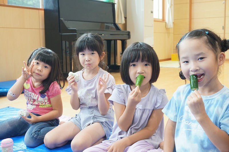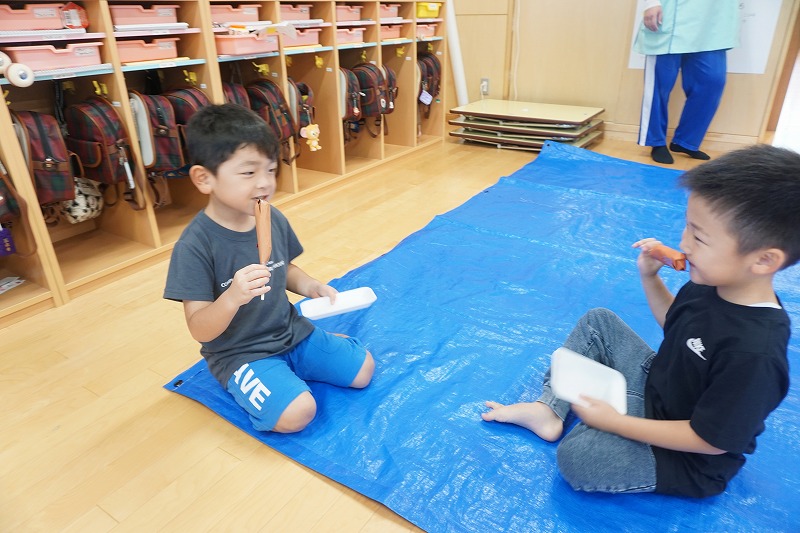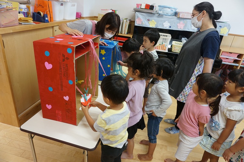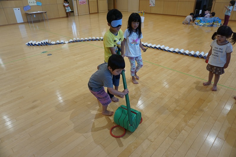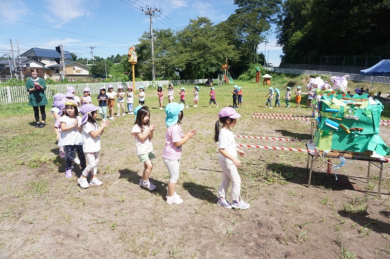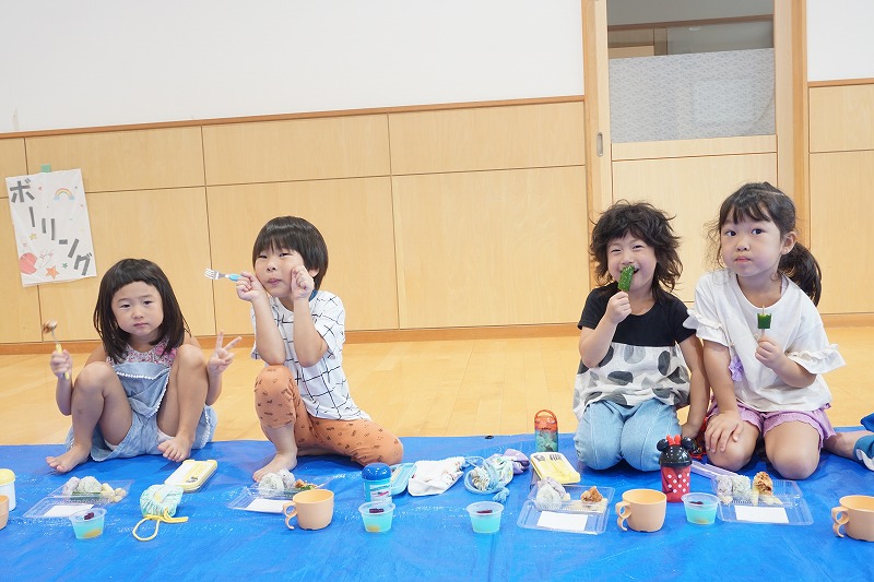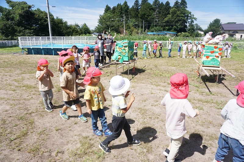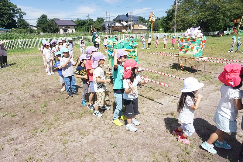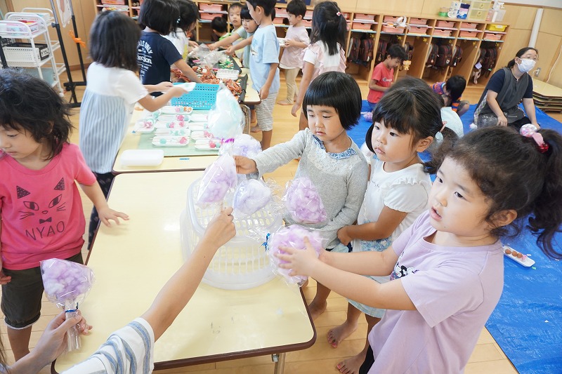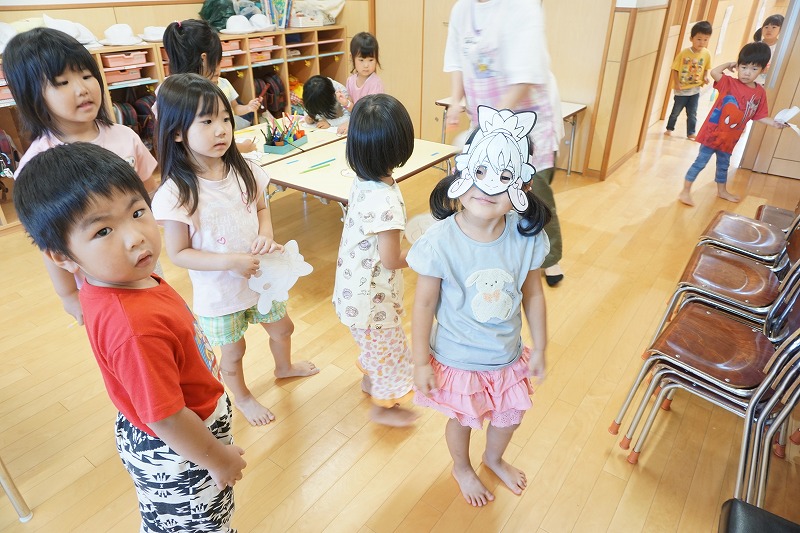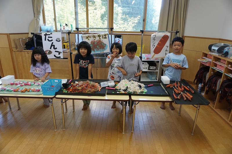 おまつりごっこをしました。おみこしを担いで園庭を歩き、みんなで「もったいないばあさん音頭」を踊りました。お遊戯室や保育室に焼きそば屋さんやかき氷屋さんなどの出店がオープンすると、お店屋さんやお客さんになりきって大盛り上がりでした!ゲームコーナーではスイカ割りや金魚すくい、射的で遊び、お面コーナーではぬり絵をしてお面を作りました。給食はおまつりメニュー!おにぎり、唐揚げ、フライドポテト、キュウリの浅漬けなどみんなでおいしくいただきました。