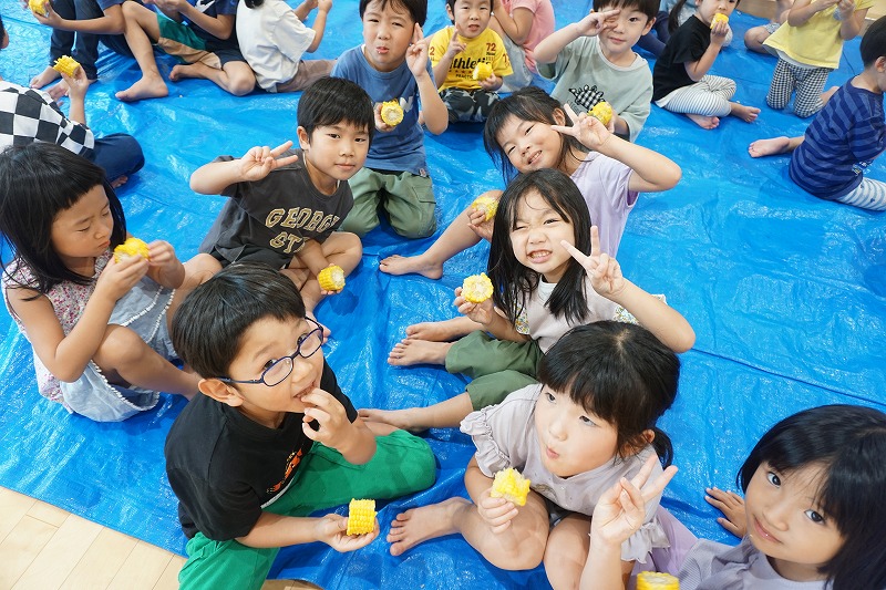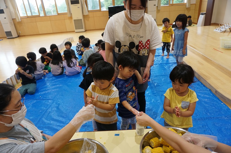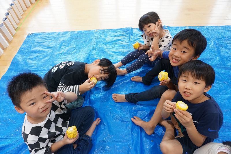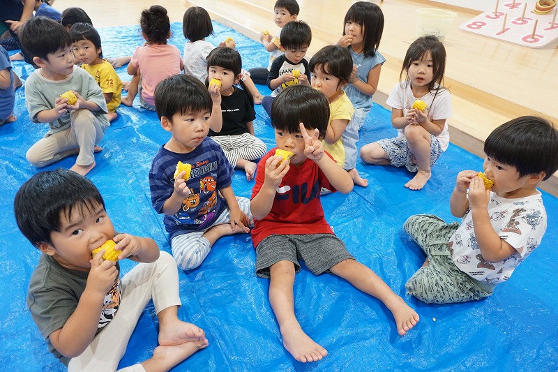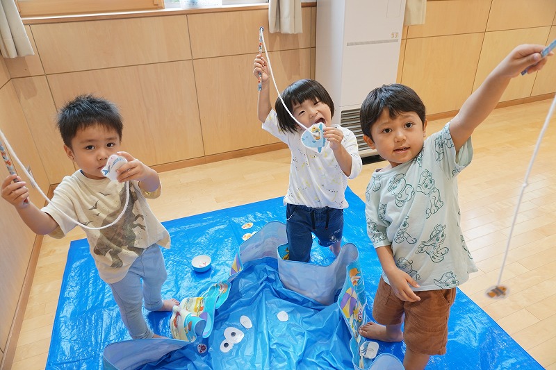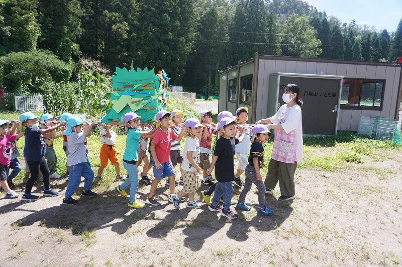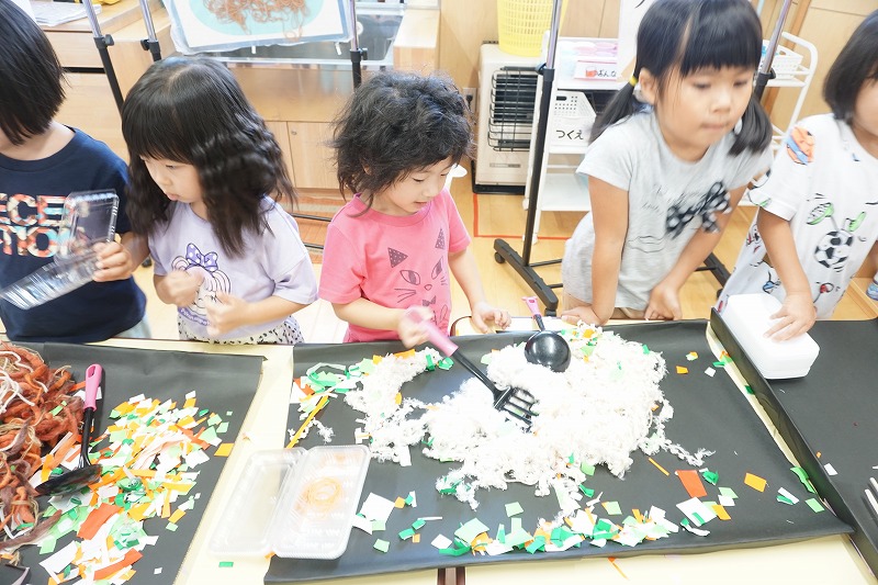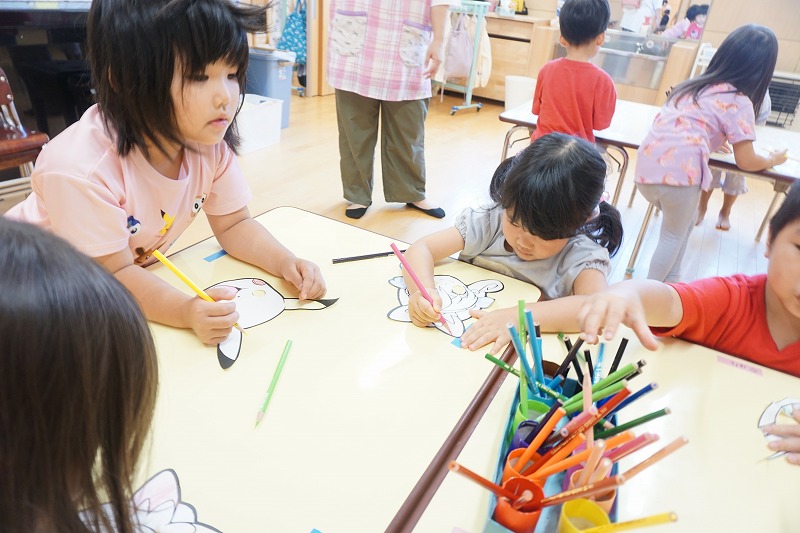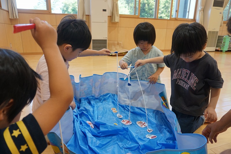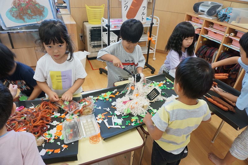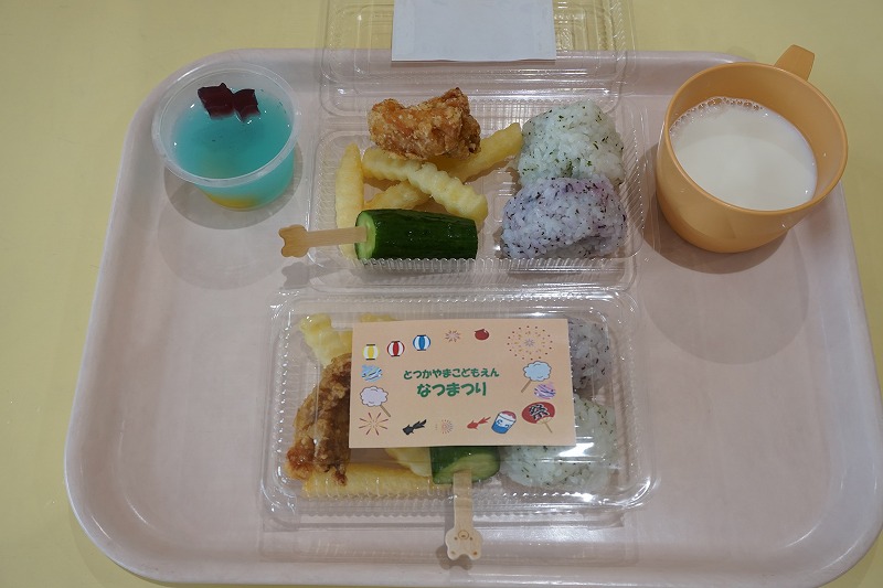 おまつりごっこをしました。おみこしを担いで園庭を歩き、みんなで「もったいないばあさん音頭」を踊りました。お遊戯室や保育室に焼きそば屋さんやかき氷屋さんなどの出店がオープンすると、お店屋さんやお客さんになりきって大盛り上がりでした!ゲームコーナーではスイカ割りや金魚すくい、射的で遊び、お面コーナーではぬり絵をしてお面を作りました。給食はおまつりメニュー!おにぎり、唐揚げ、フライドポテト、キュウリの浅漬けなどみんなでおいしくいただきました。