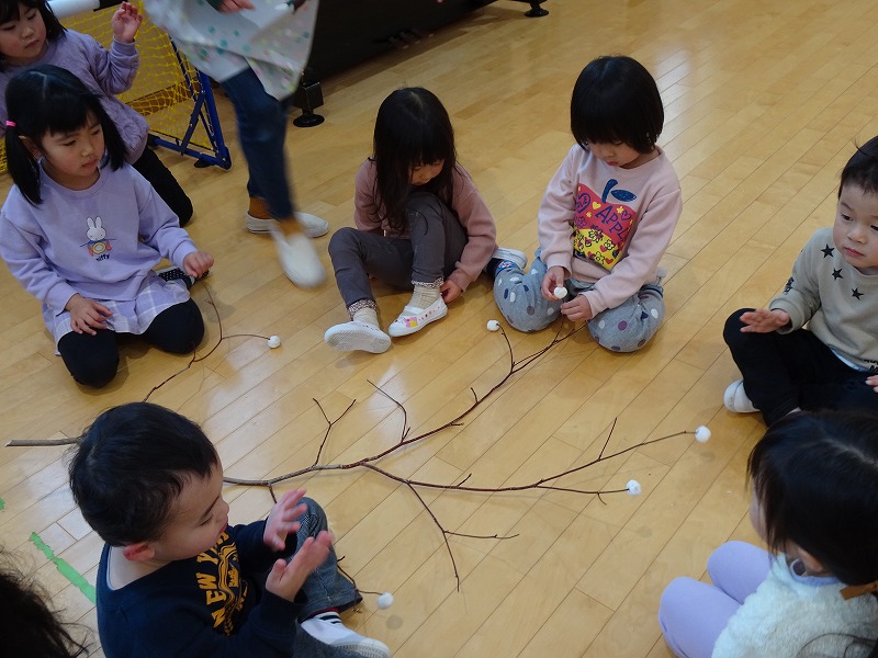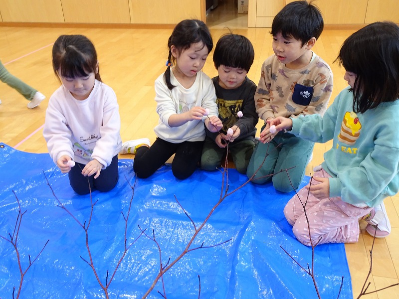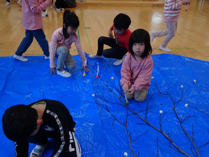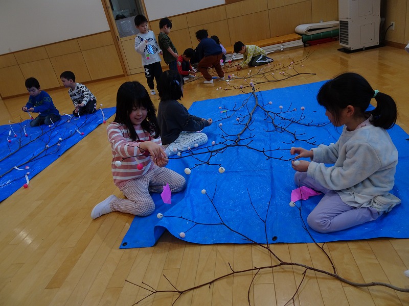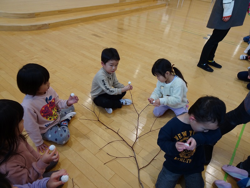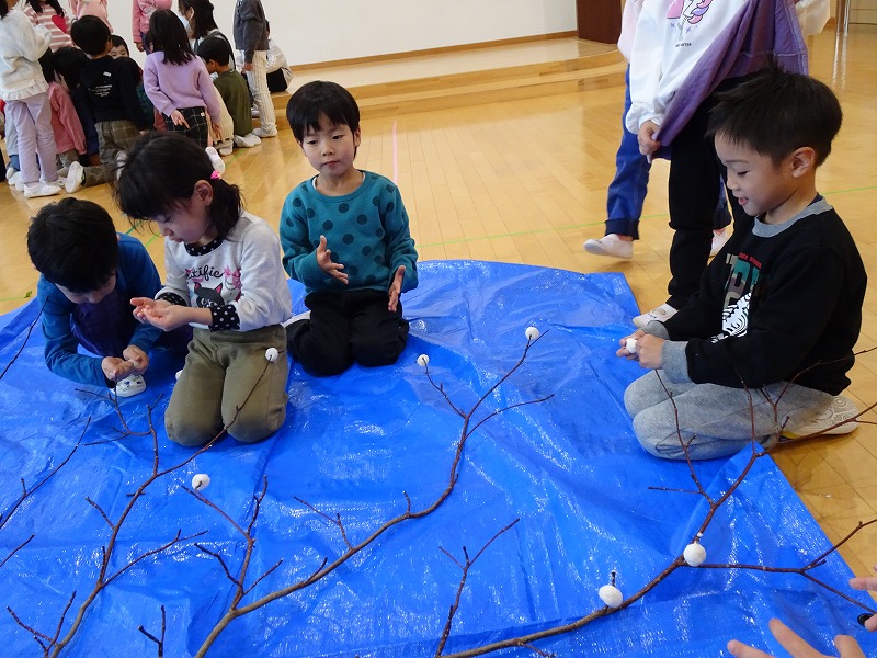 1月15日の小正月を前に、13日(金)だんごの木飾りをしました。先生からだんごの木についての由来を聞いた後、ミズキの木にだんごや船せんべい、みんなで作った折り紙を飾り「無病息災」や「豊作」願いました。