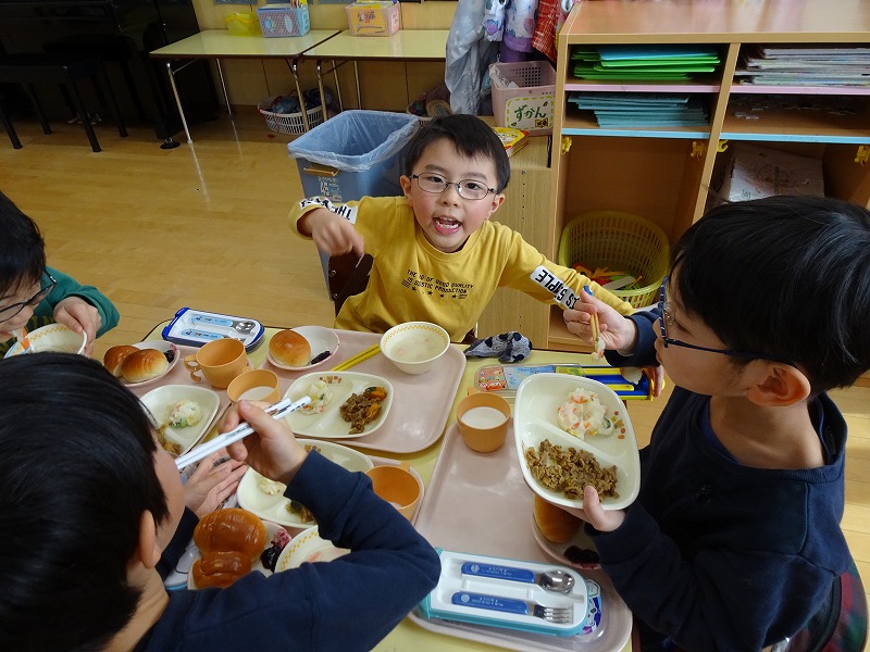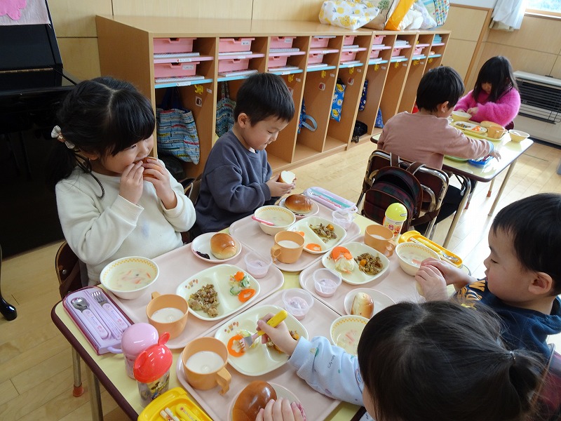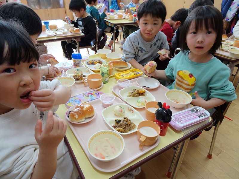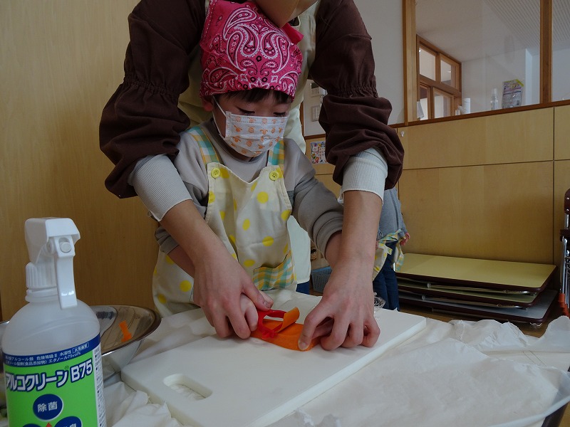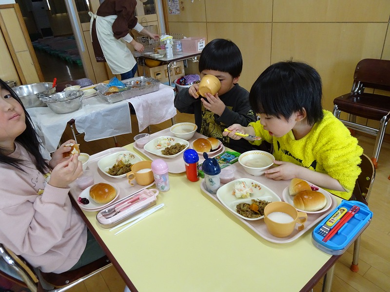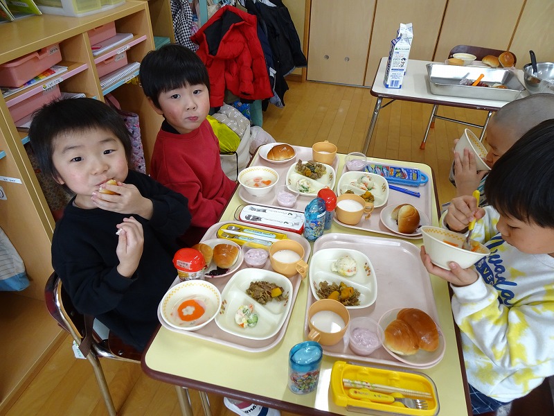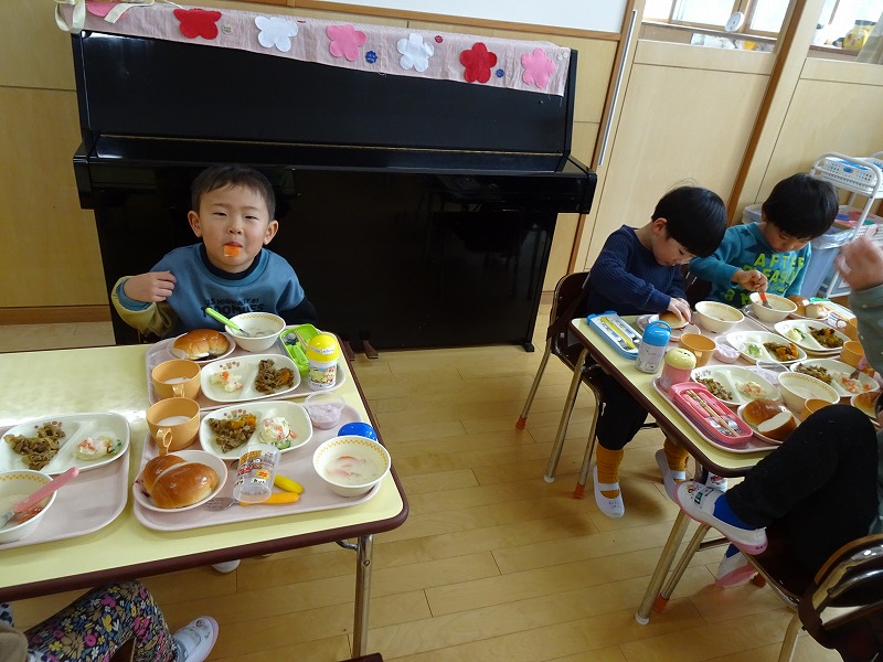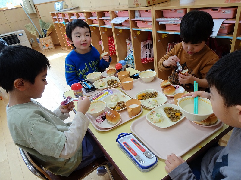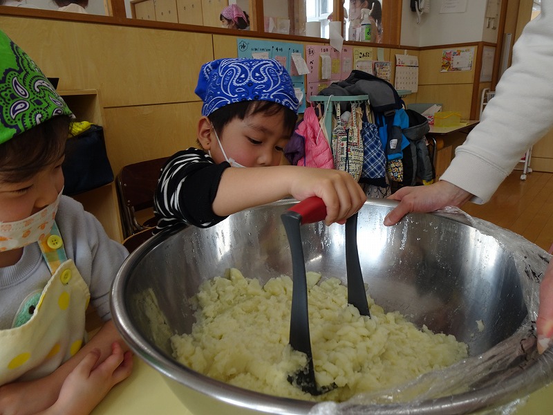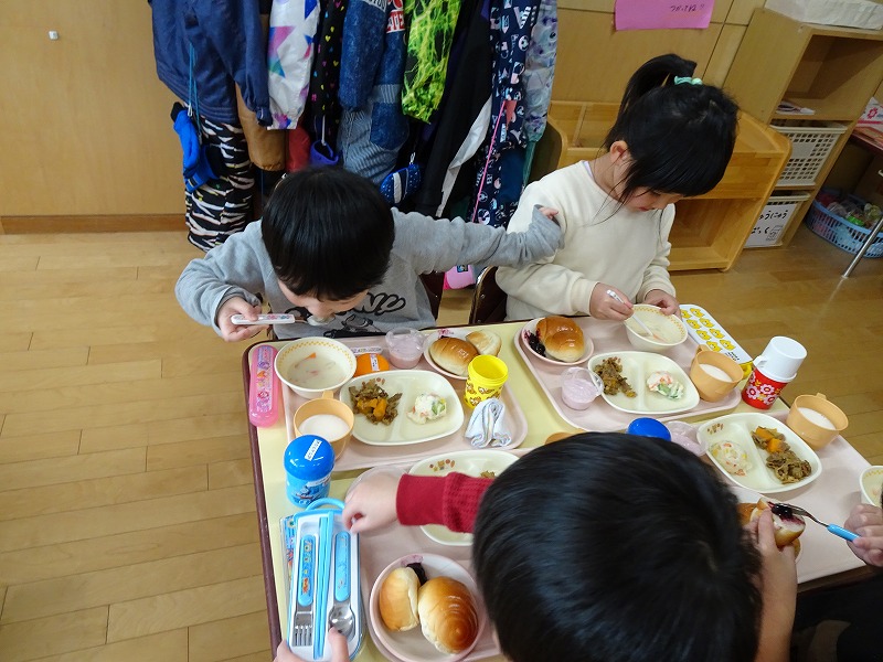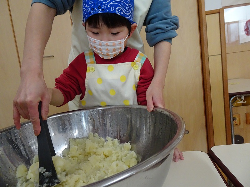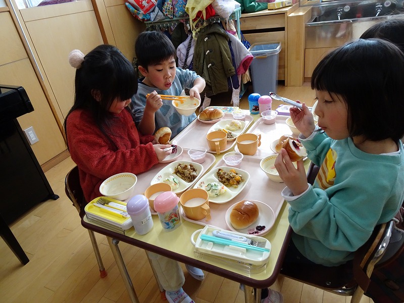 2月24日(金)はランチパーティをしました。メニューはふじ組さんのリクエストで「バターロール・牛肉とカボチャの炒め物・ポテトサラダ・コーンスープ・フルーチェ」でした。ぱんだ組さんはフルーチェ、さくら組さんはポテトサラダのポテトを潰して、ニンジンの型抜き、すみれ組さんはスープのニンジンをピーラーでむいて、しめじをほぐし、ふじ組さんはキュウリやカボチャの野菜を切り、牛肉とカボチャの炒め物を作りました。自分たちで作るとまた格別で、「おいしい!!」「いいにいおい!」と食べる顔も笑みがあふれ、みんなとってもいいお顔!楽しいランチパーティーになりました!