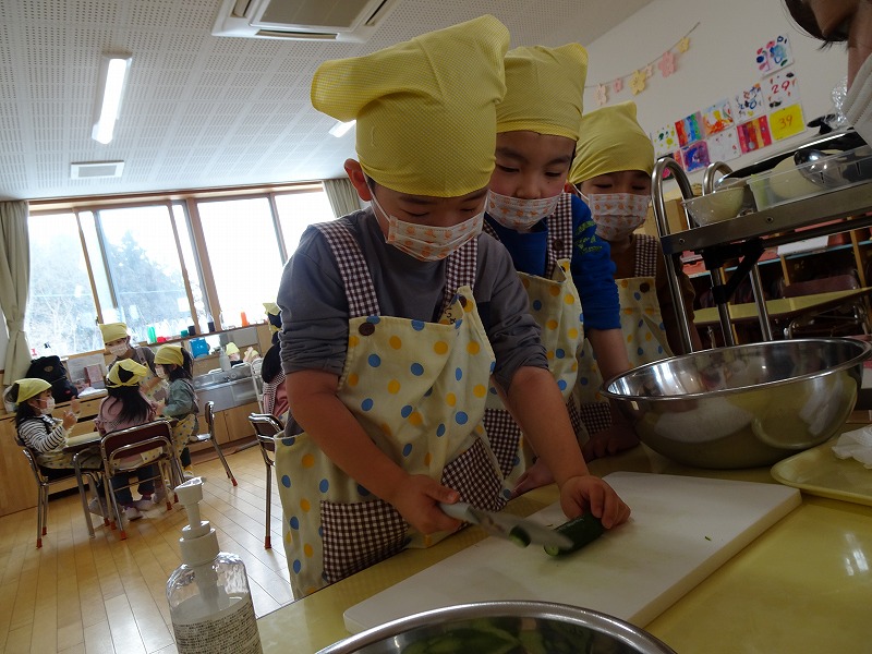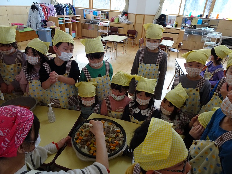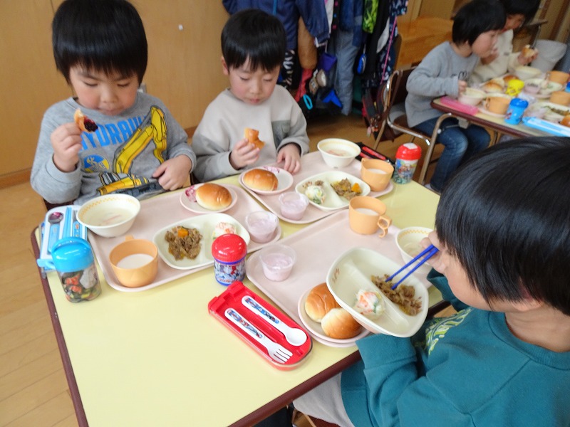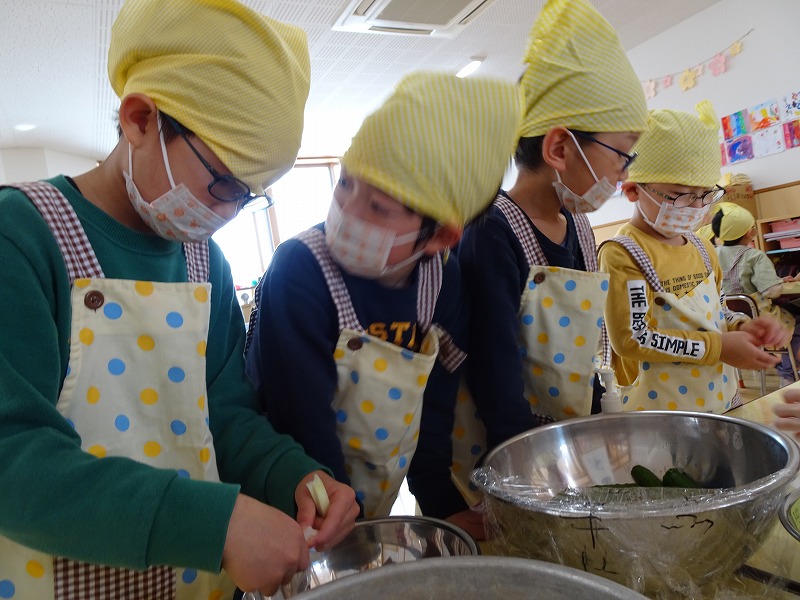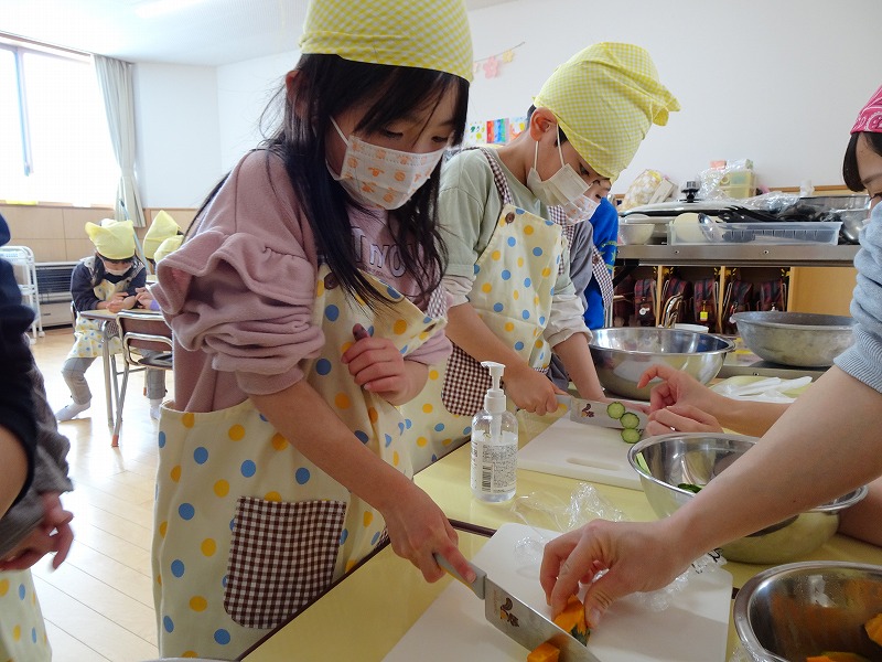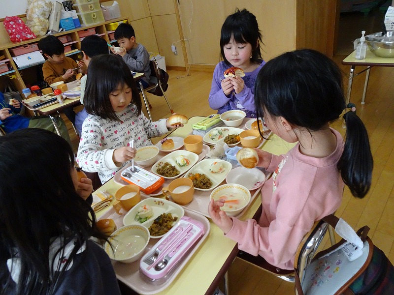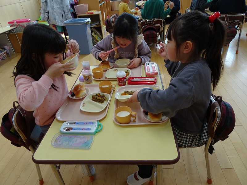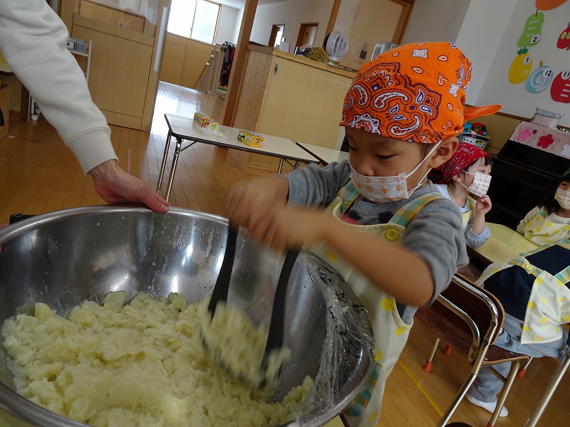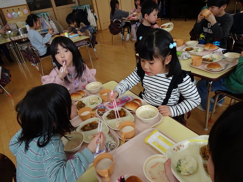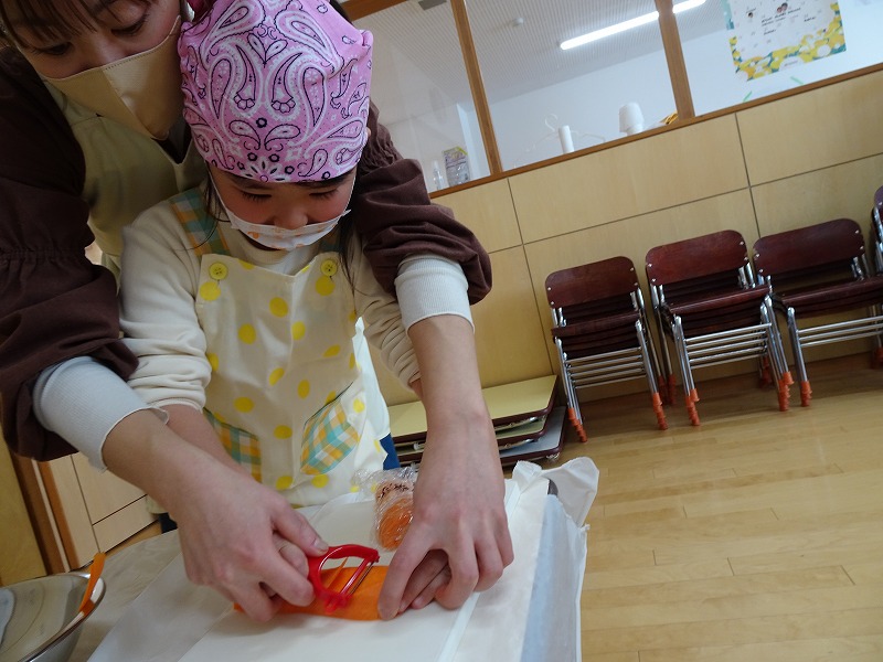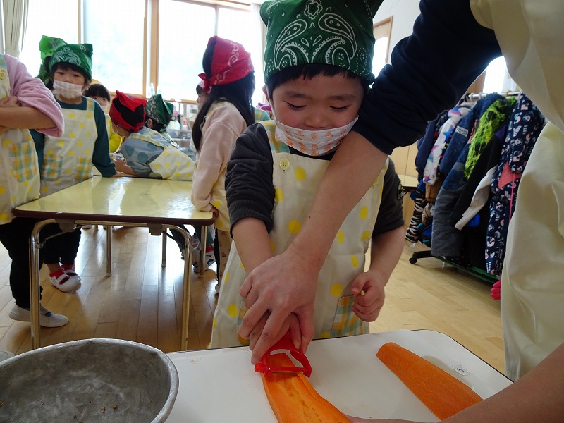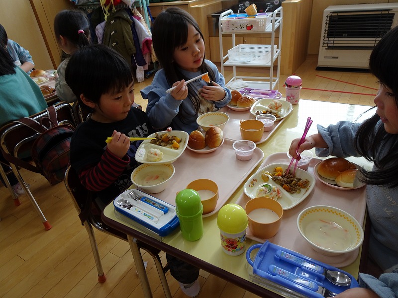 2月24日(金)はランチパーティをしました。メニューはふじ組さんのリクエストで「バターロール・牛肉とカボチャの炒め物・ポテトサラダ・コーンスープ・フルーチェ」でした。ぱんだ組さんはフルーチェ、さくら組さんはポテトサラダのポテトを潰して、ニンジンの型抜き、すみれ組さんはスープのニンジンをピーラーでむいて、しめじをほぐし、ふじ組さんはキュウリやカボチャの野菜を切り、牛肉とカボチャの炒め物を作りました。自分たちで作るとまた格別で、「おいしい!!」「いいにいおい!」と食べる顔も笑みがあふれ、みんなとってもいいお顔!楽しいランチパーティーになりました!