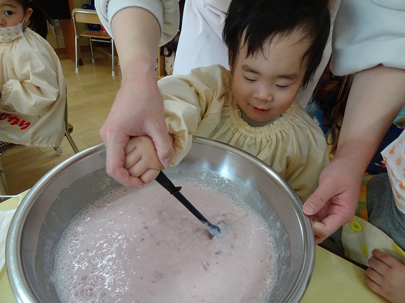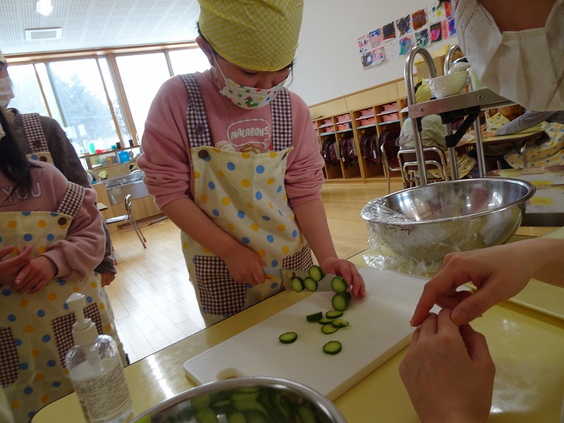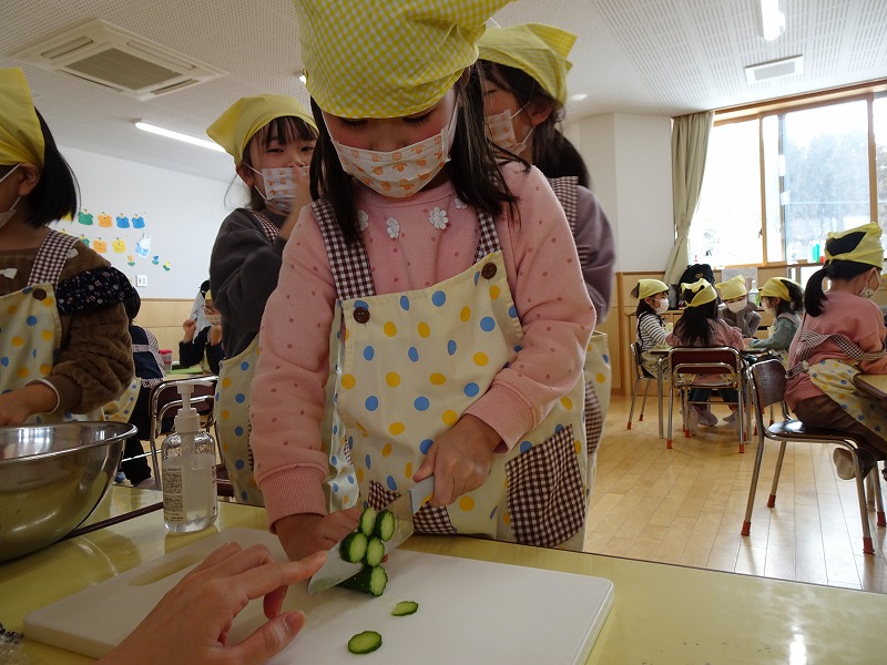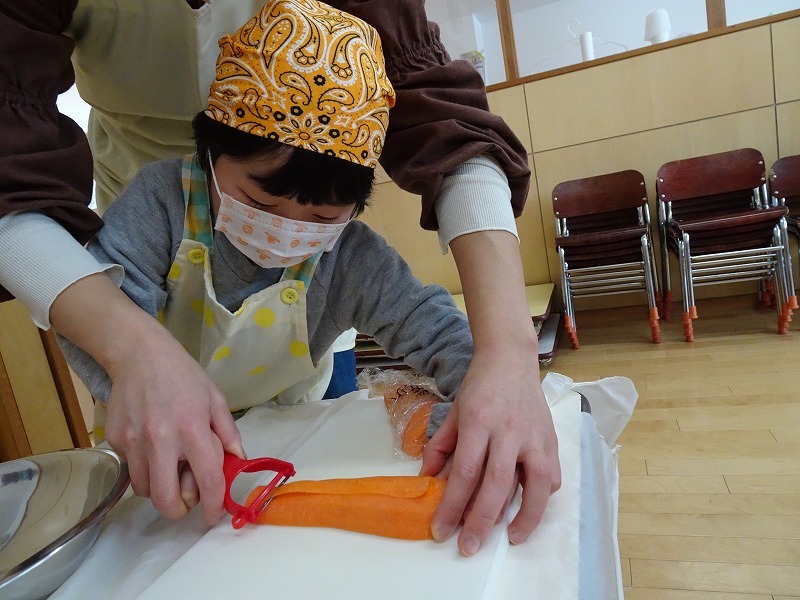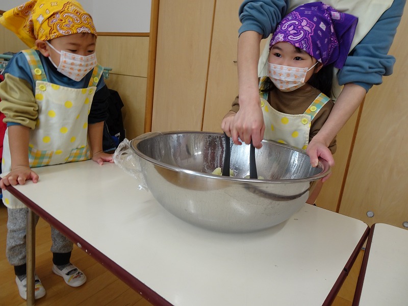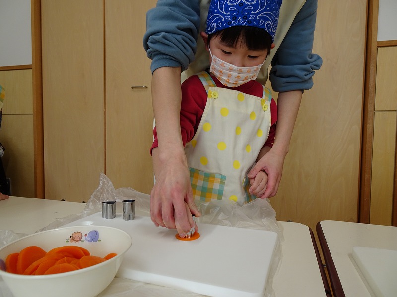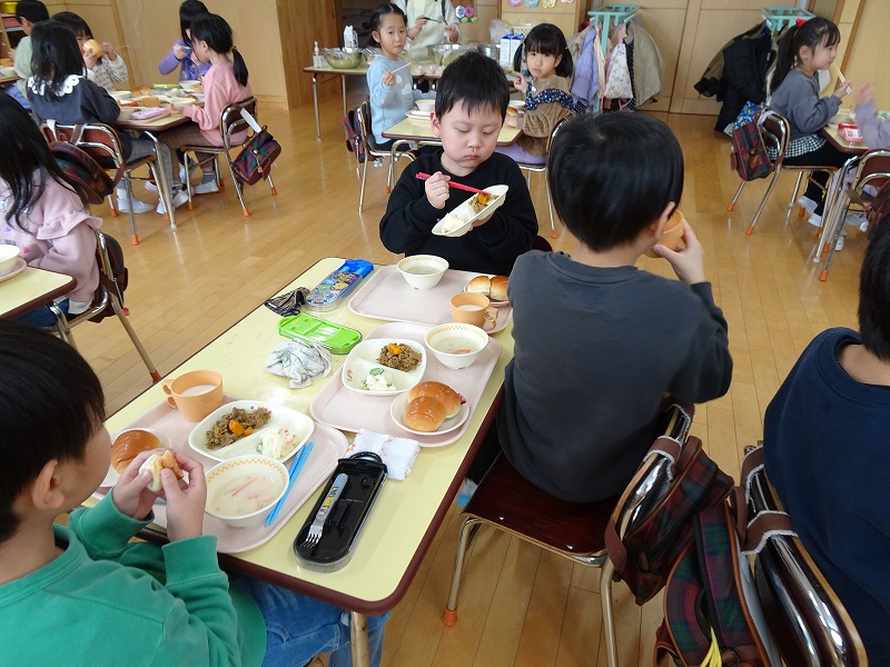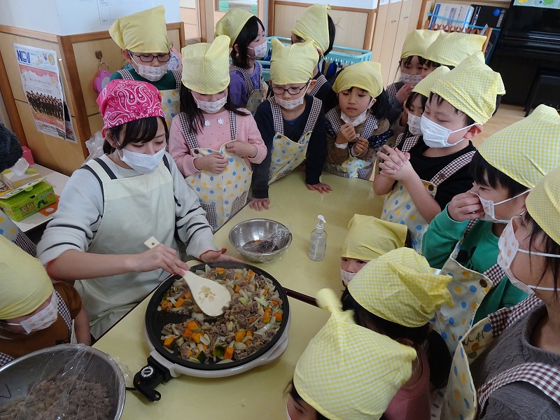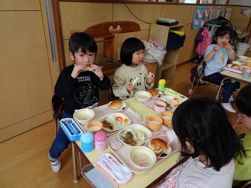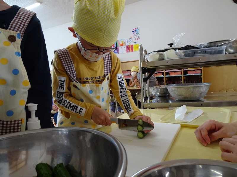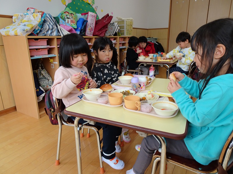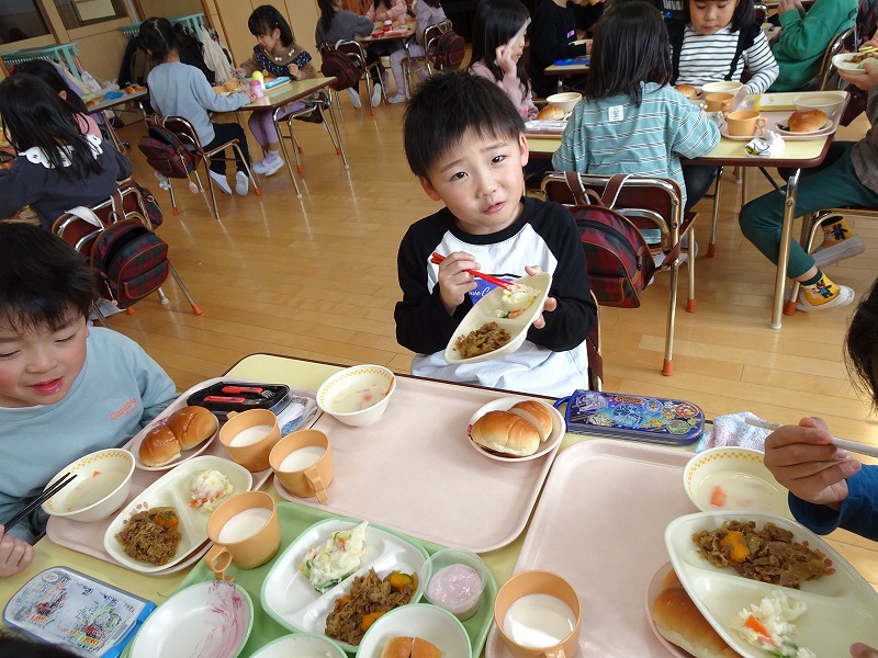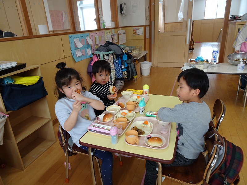 2月24日(金)はランチパーティをしました。メニューはふじ組さんのリクエストで「バターロール・牛肉とカボチャの炒め物・ポテトサラダ・コーンスープ・フルーチェ」でした。ぱんだ組さんはフルーチェ、さくら組さんはポテトサラダのポテトを潰して、ニンジンの型抜き、すみれ組さんはスープのニンジンをピーラーでむいて、しめじをほぐし、ふじ組さんはキュウリやカボチャの野菜を切り、牛肉とカボチャの炒め物を作りました。自分たちで作るとまた格別で、「おいしい!!」「いいにいおい!」と食べる顔も笑みがあふれ、みんなとってもいいお顔!楽しいランチパーティーになりました!