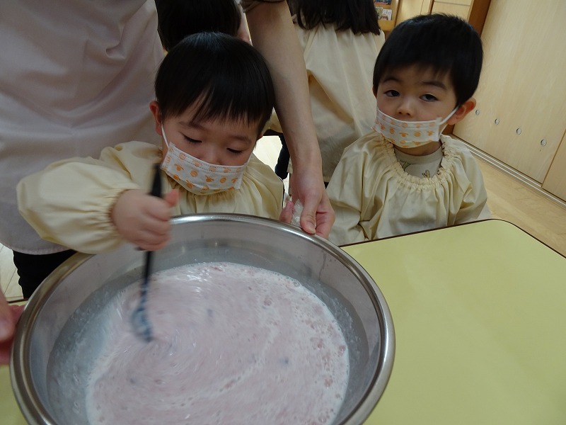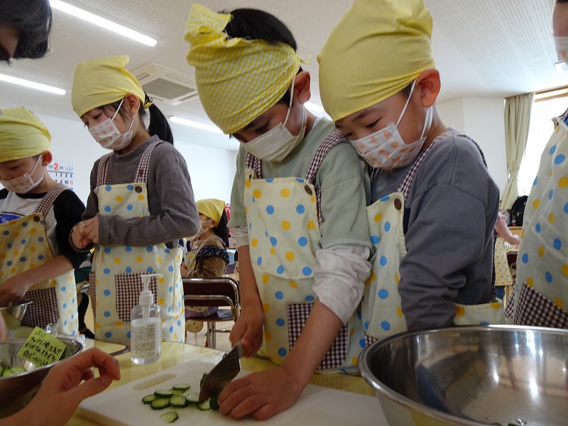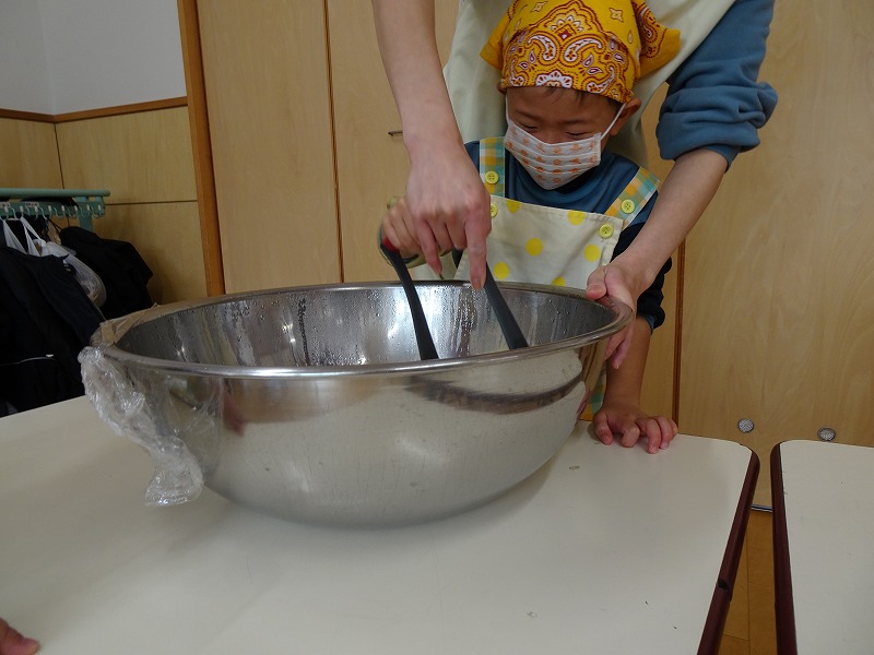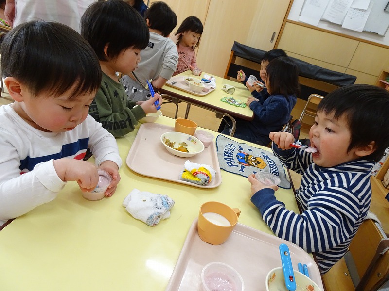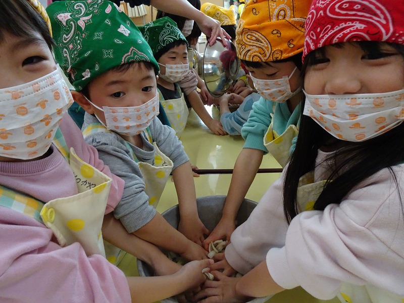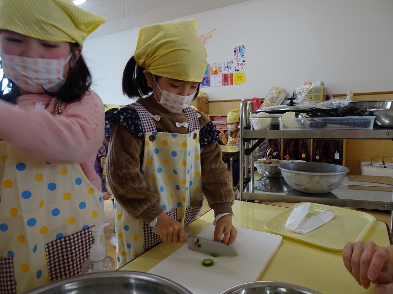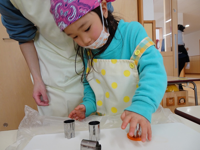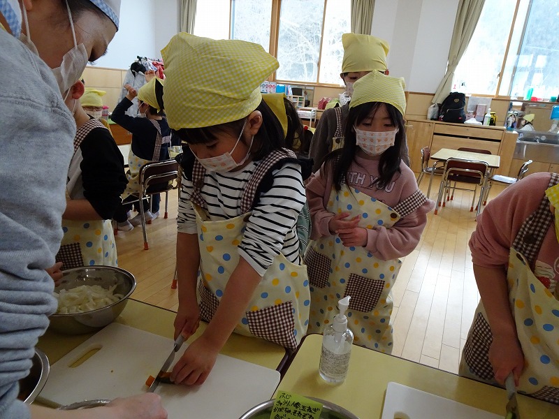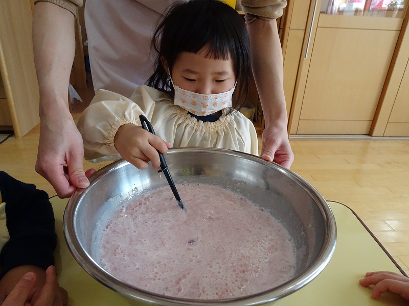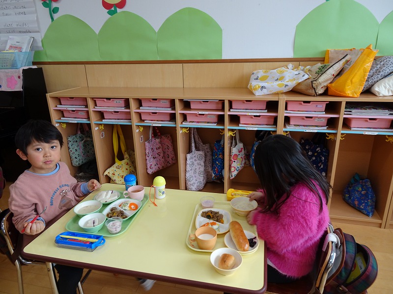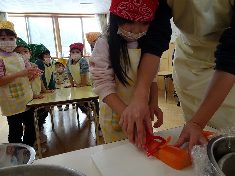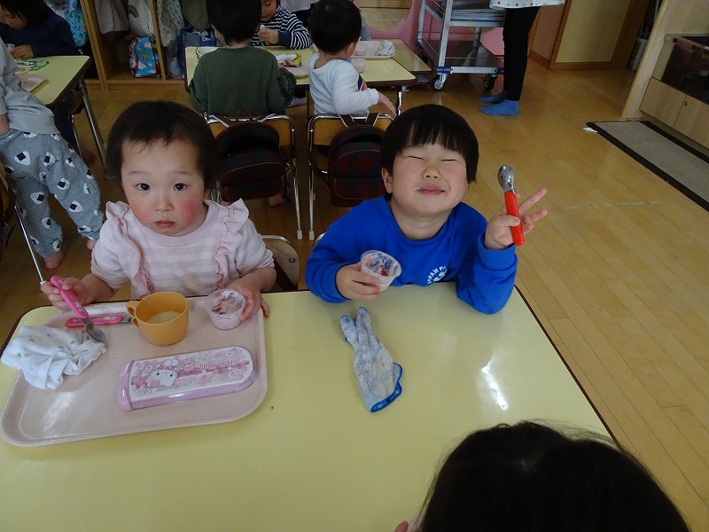 2月24日(金)はランチパーティをしました。メニューはふじ組さんのリクエストで「バターロール・牛肉とカボチャの炒め物・ポテトサラダ・コーンスープ・フルーチェ」でした。ぱんだ組さんはフルーチェ、さくら組さんはポテトサラダのポテトを潰して、ニンジンの型抜き、すみれ組さんはスープのニンジンをピーラーでむいて、しめじをほぐし、ふじ組さんはキュウリやカボチャの野菜を切り、牛肉とカボチャの炒め物を作りました。自分たちで作るとまた格別で、「おいしい!!」「いいにいおい!」と食べる顔も笑みがあふれ、みんなとってもいいお顔!楽しいランチパーティーになりました!