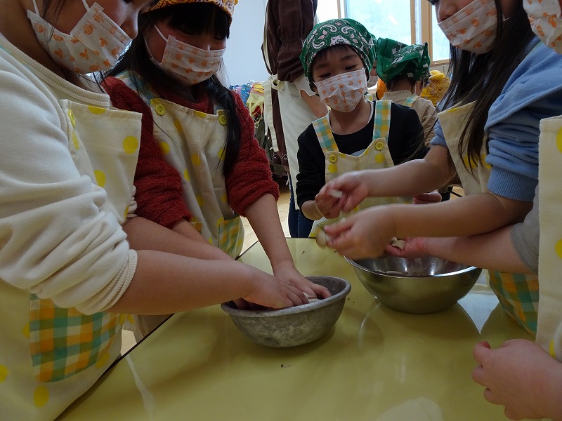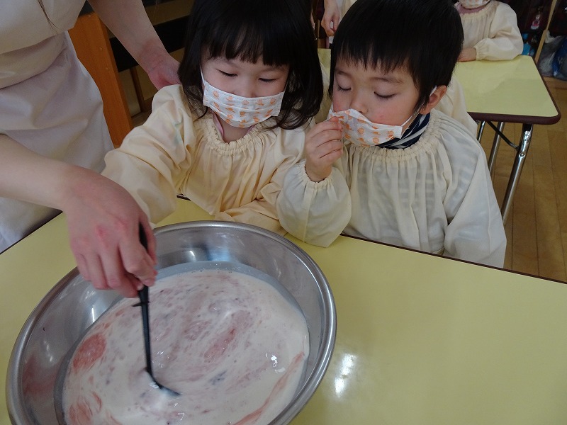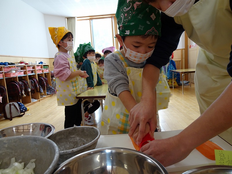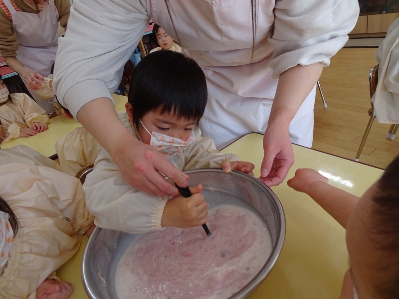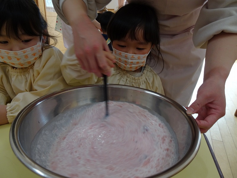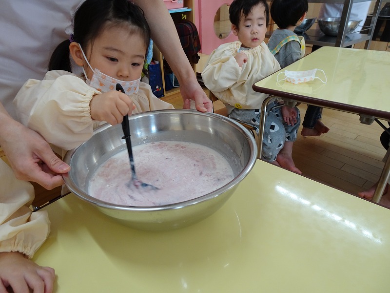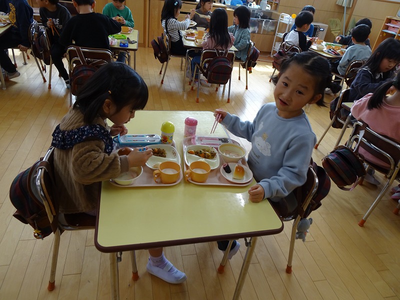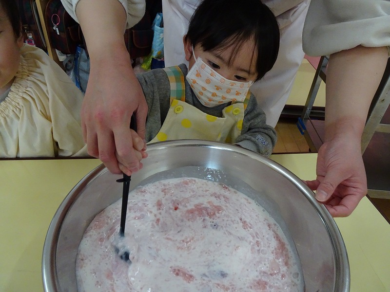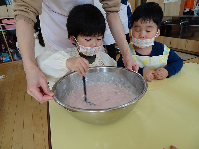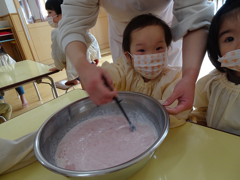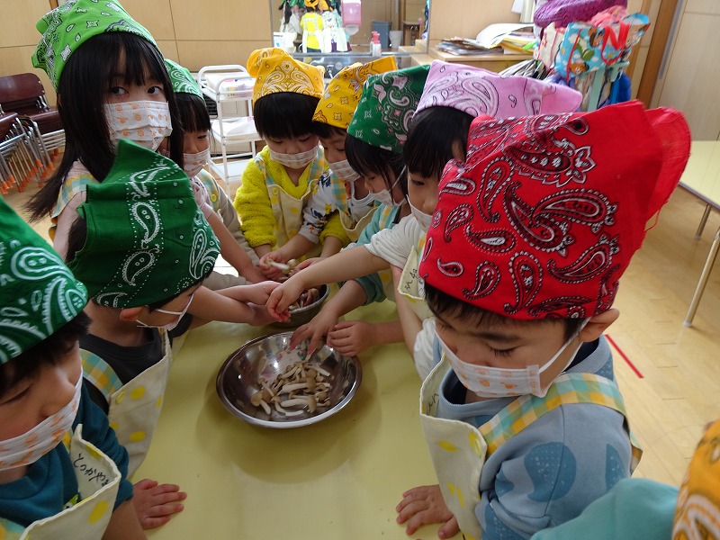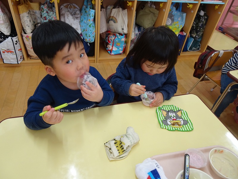2月24日(金)はランチパーティをしました。メニューはふじ組さんのリクエストで「バターロール・牛肉とカボチャの炒め物・ポテトサラダ・コーンスープ・フルーチェ」でした。ぱんだ組さんはフルーチェ、さくら組さんはポテトサラダのポテトを潰して、ニンジンの型抜き、すみれ組さんはスープのニンジンをピーラーでむいて、しめじをほぐし、ふじ組さんはキュウリやカボチャの野菜を切り、牛肉とカボチャの炒め物を作りました。自分たちで作るとまた格別で、「おいしい!!」「いいにいおい!」と食べる顔も笑みがあふれ、みんなとってもいいお顔!楽しいランチパーティーになりました!
