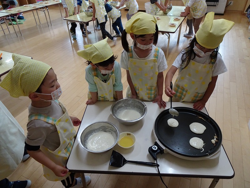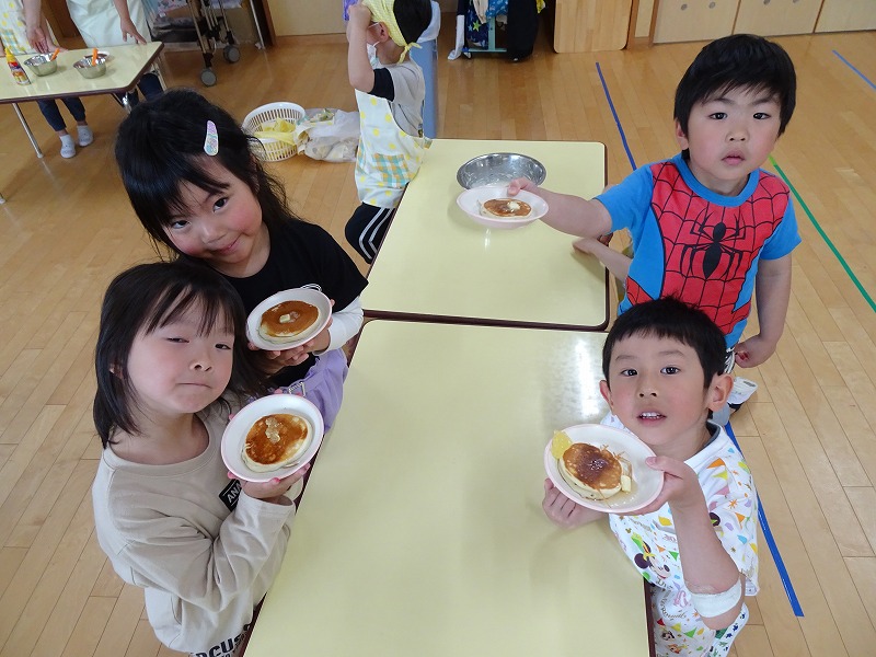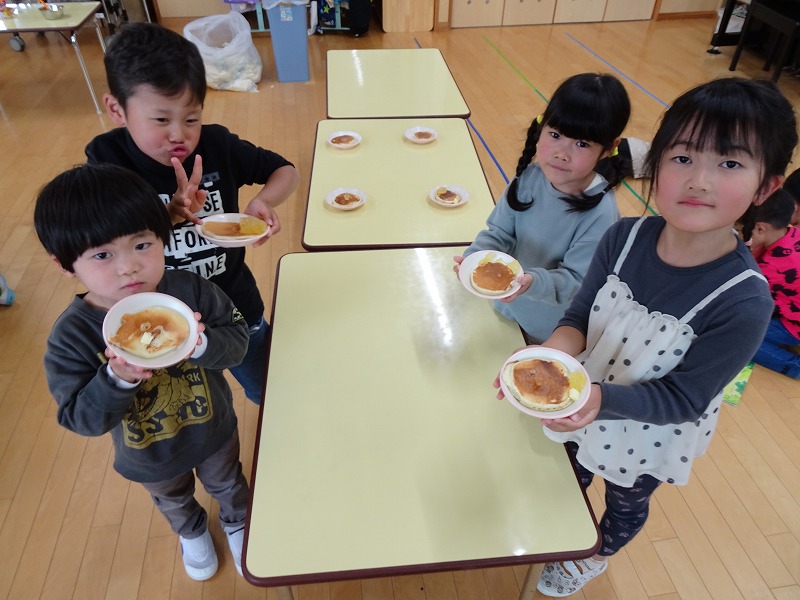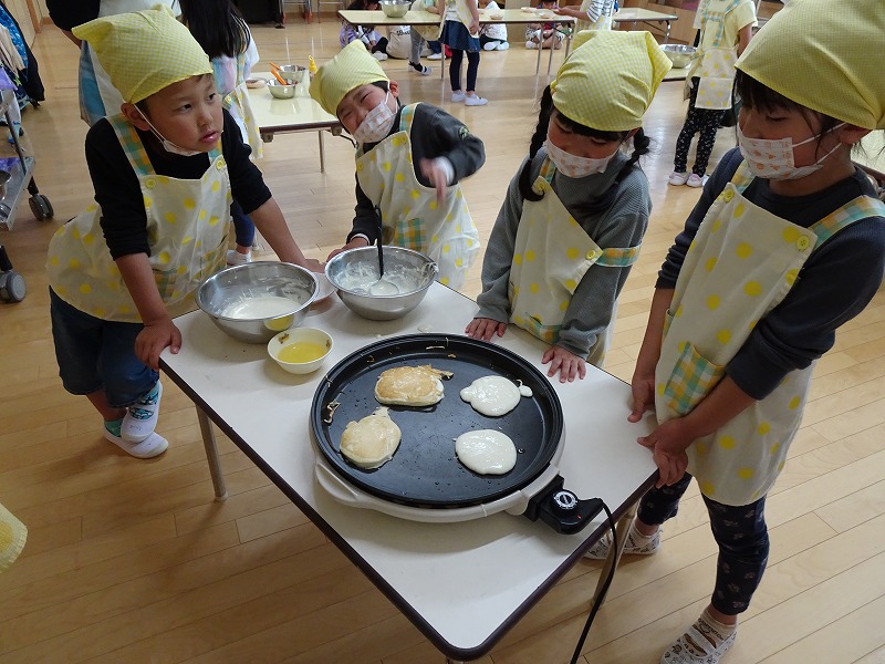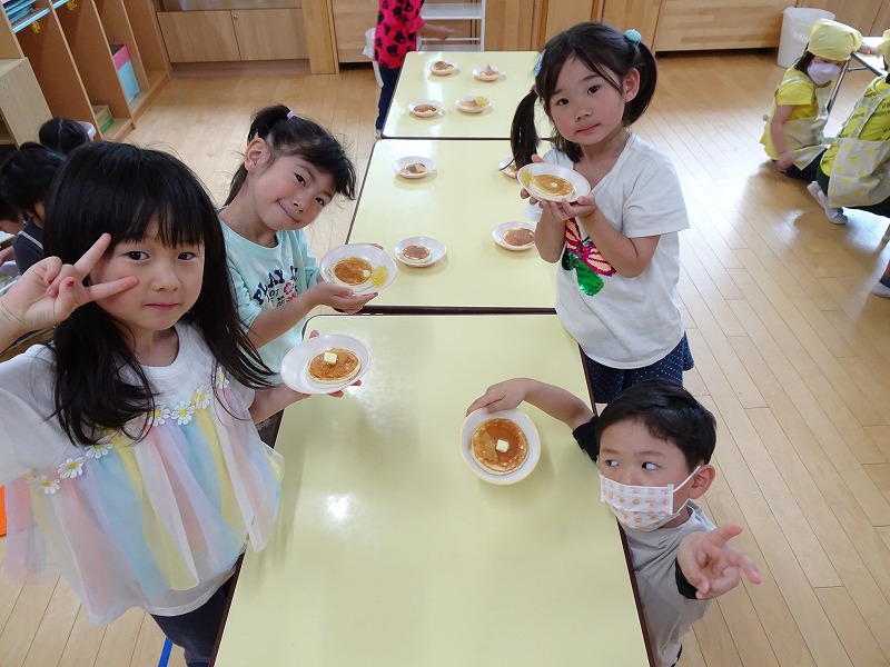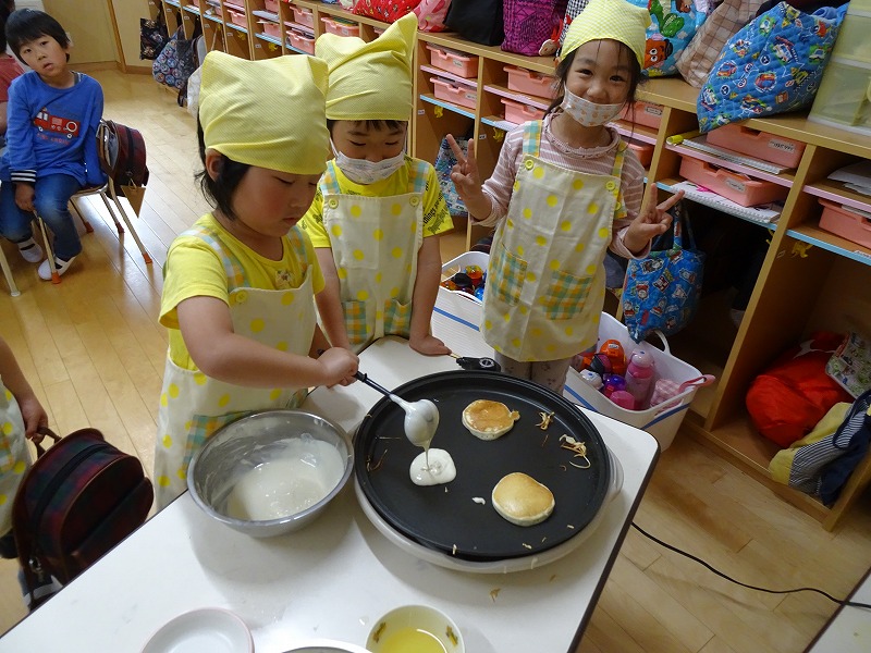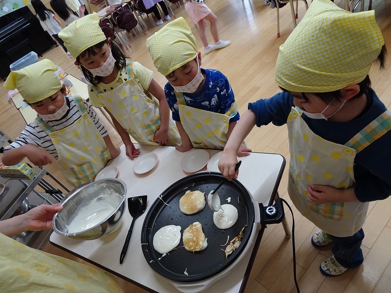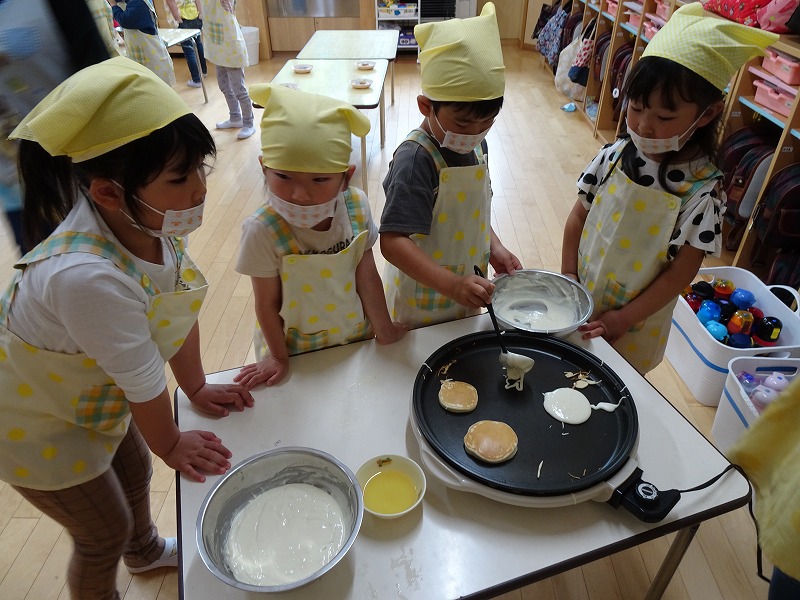 ふじ組さんがホットケーキ作りをしました。しろくまちゃんのホットケーキの絵本のように材料を混ぜて、少しずつ焼きあがる様子を見ながら美味しいホットケーキが完成しました。ふじ組さんのお部屋はホットケーキの美味しそうな匂いでいっぱいになりました。みんなで作ったホットケーキ、とっても美味しかったね!