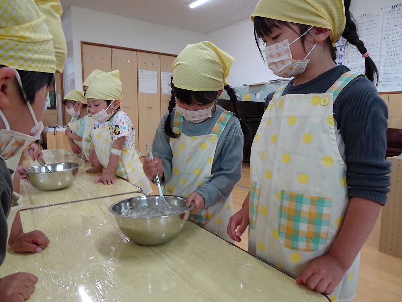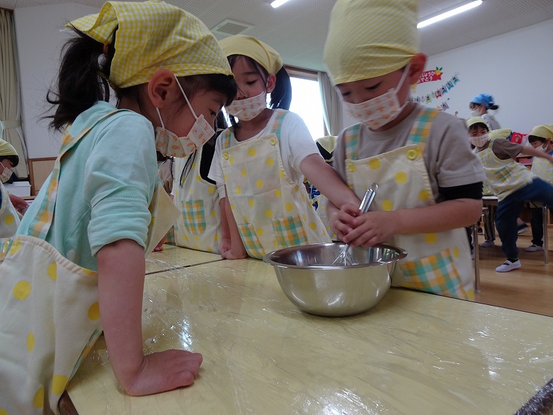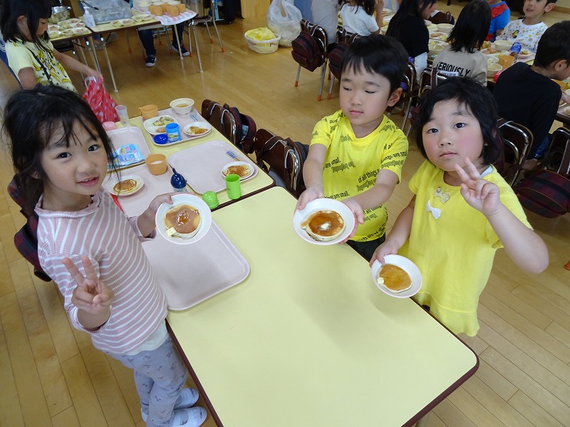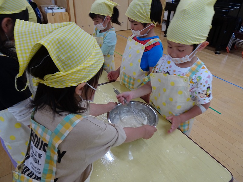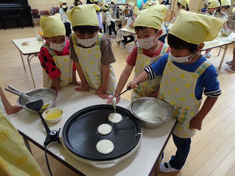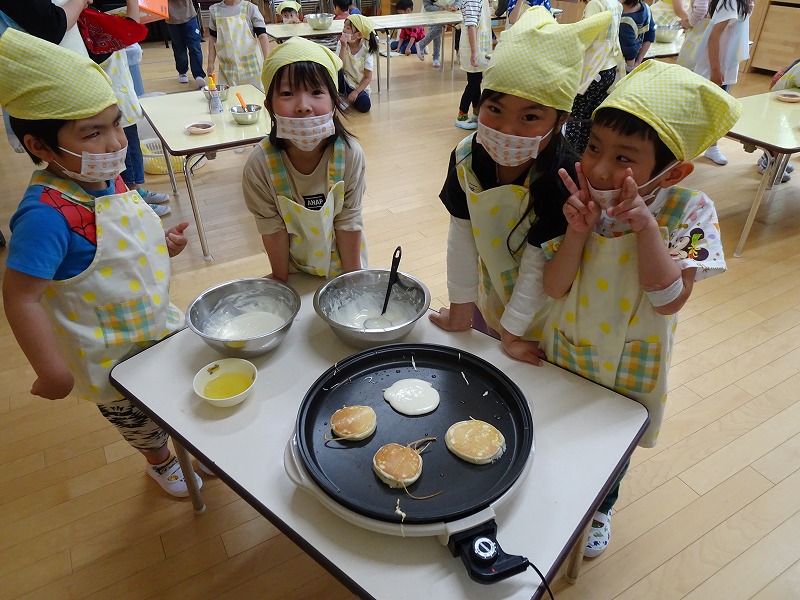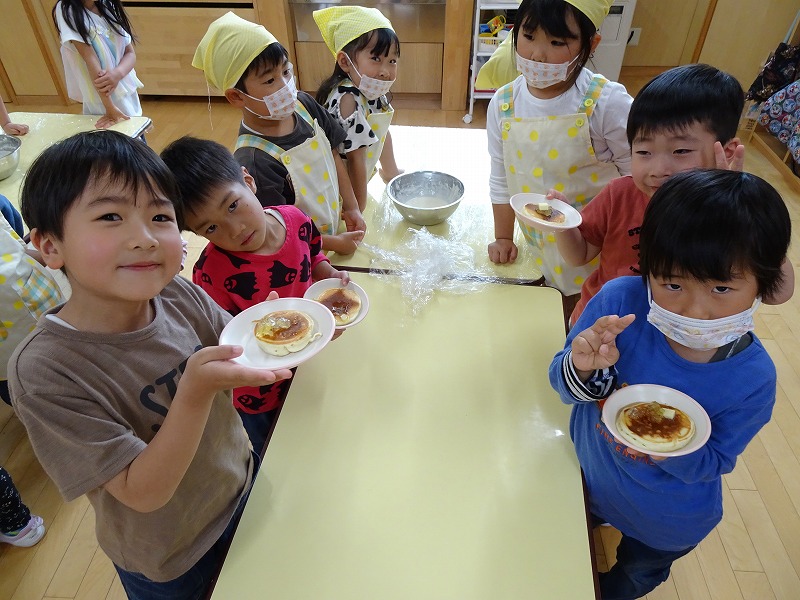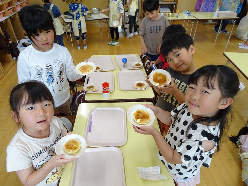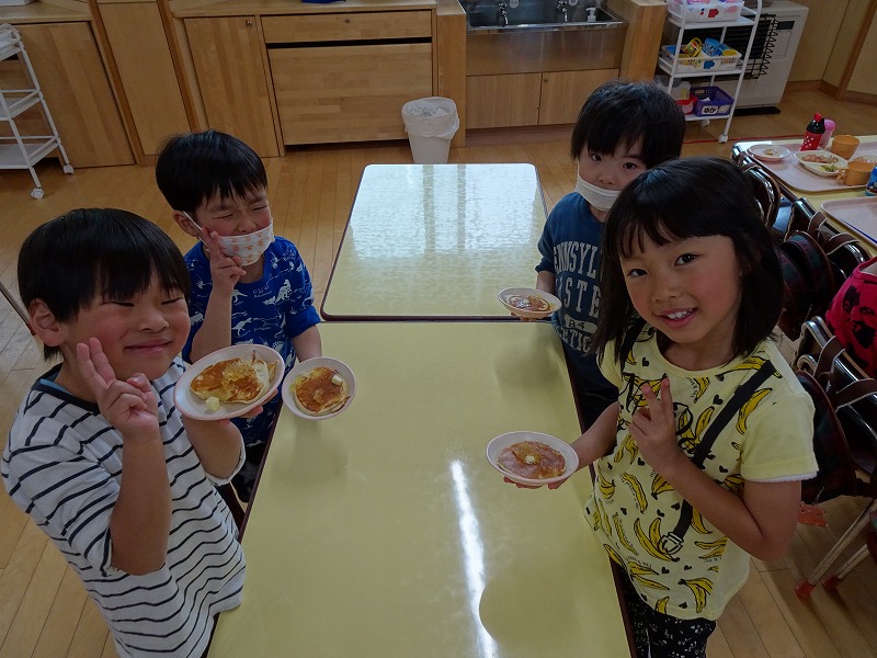 ふじ組さんがホットケーキ作りをしました。しろくまちゃんのホットケーキの絵本のように材料を混ぜて、少しずつ焼きあがる様子を見ながら美味しいホットケーキが完成しました。ふじ組さんのお部屋はホットケーキの美味しそうな匂いでいっぱいになりました。みんなで作ったホットケーキ、とっても美味しかったね!