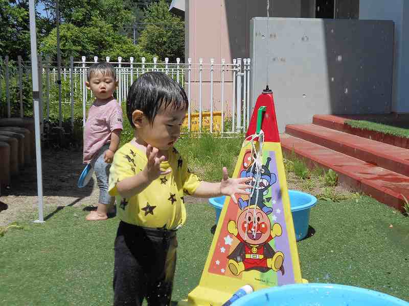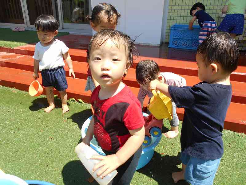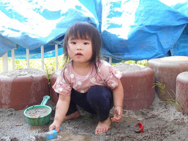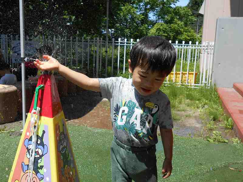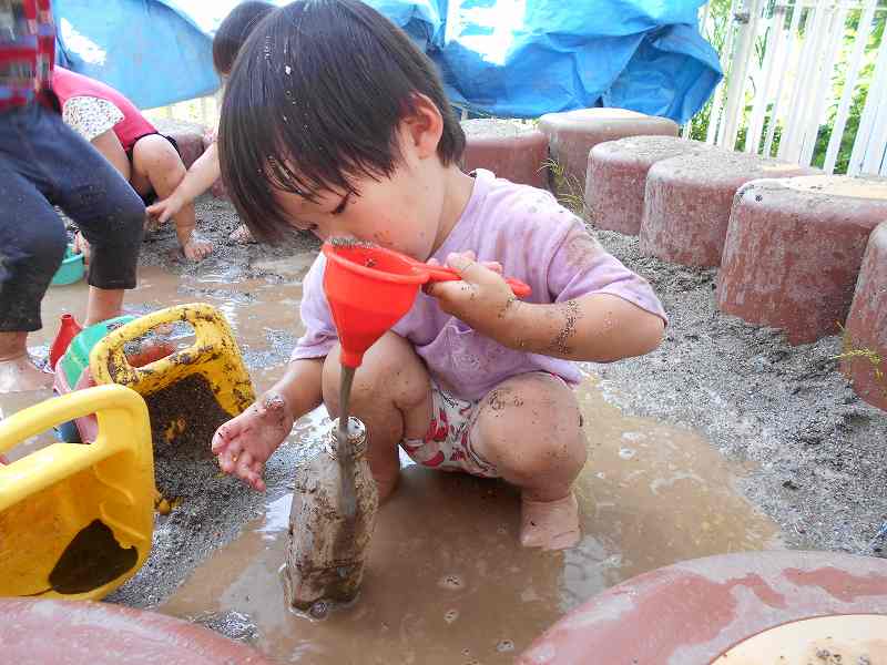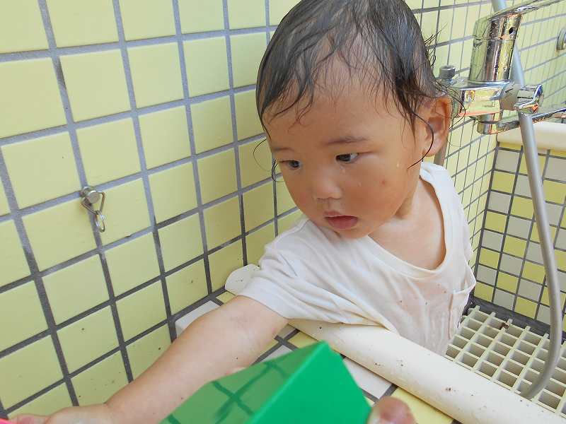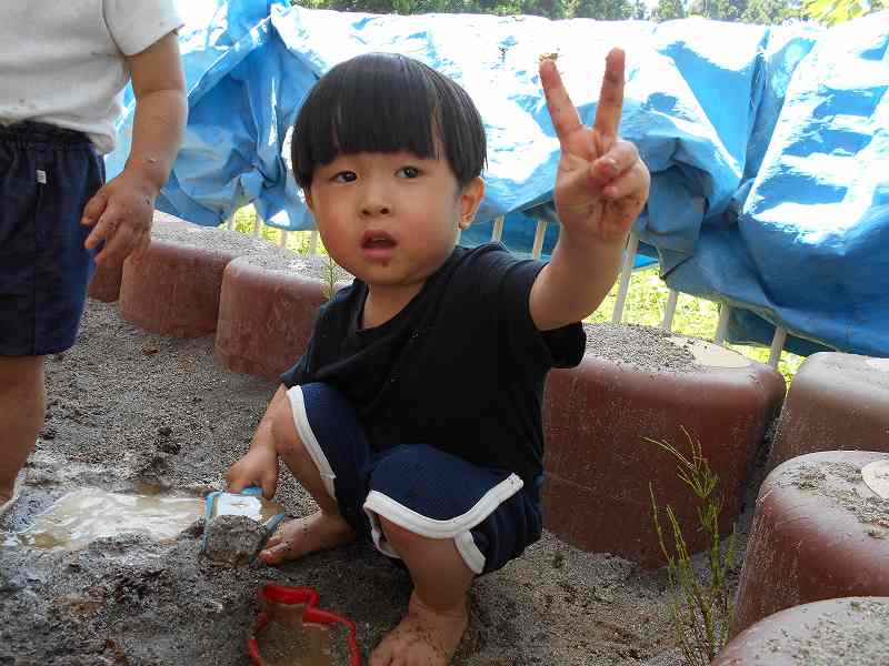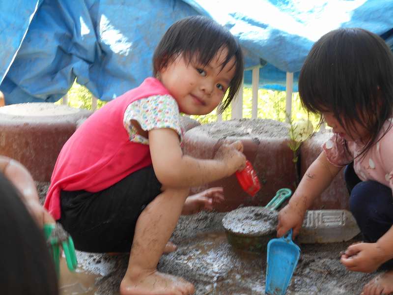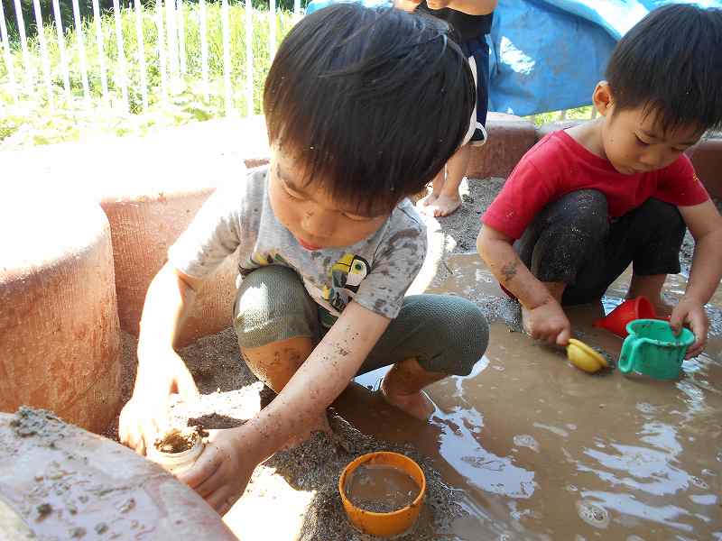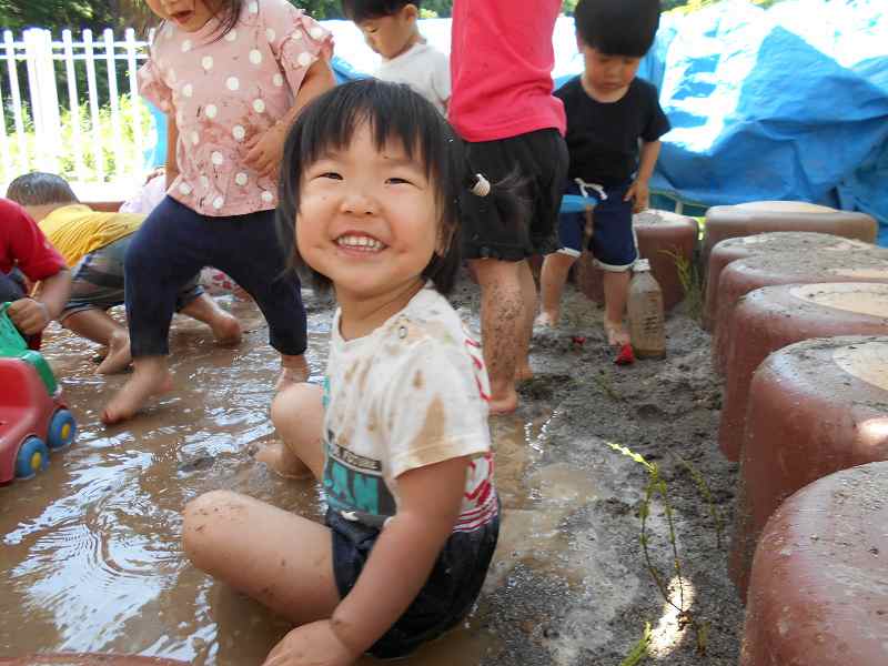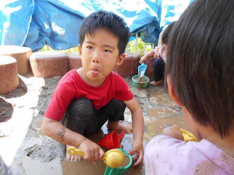 泥や水の感触を楽しみながら、溜まった泥水に入ったり、噴水のお水を浴びたりと夏ならではの遊びを存分に楽しんでいます。お顔に水や泥がはねてもへっちゃらです!