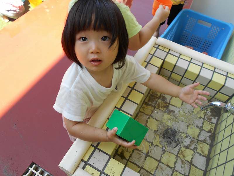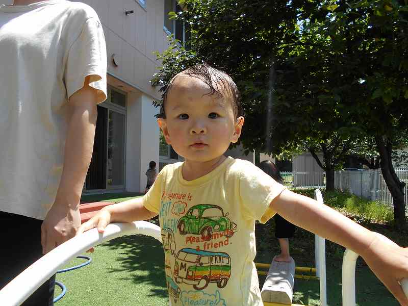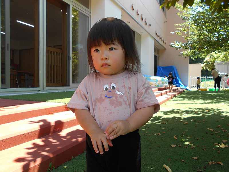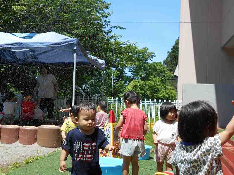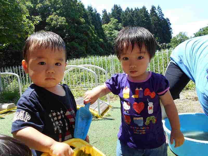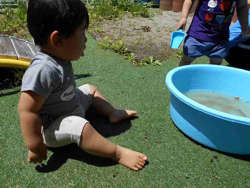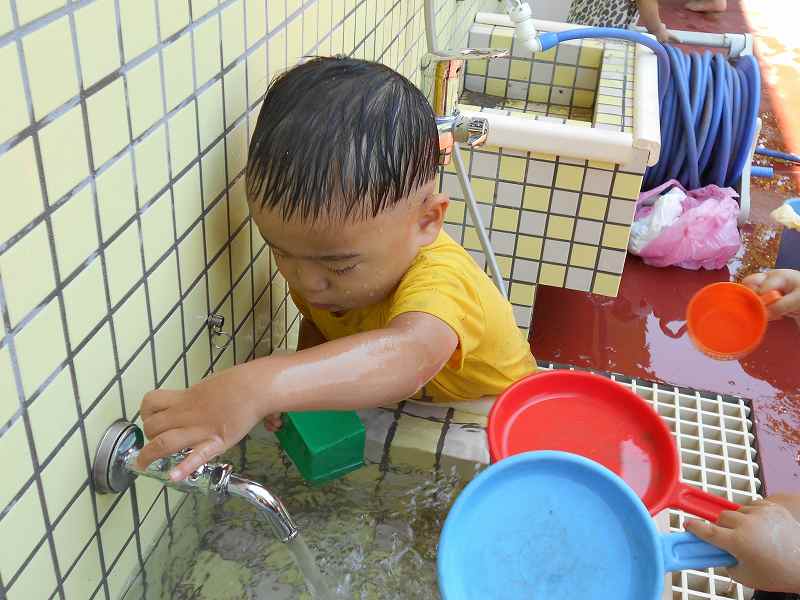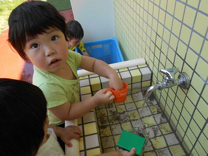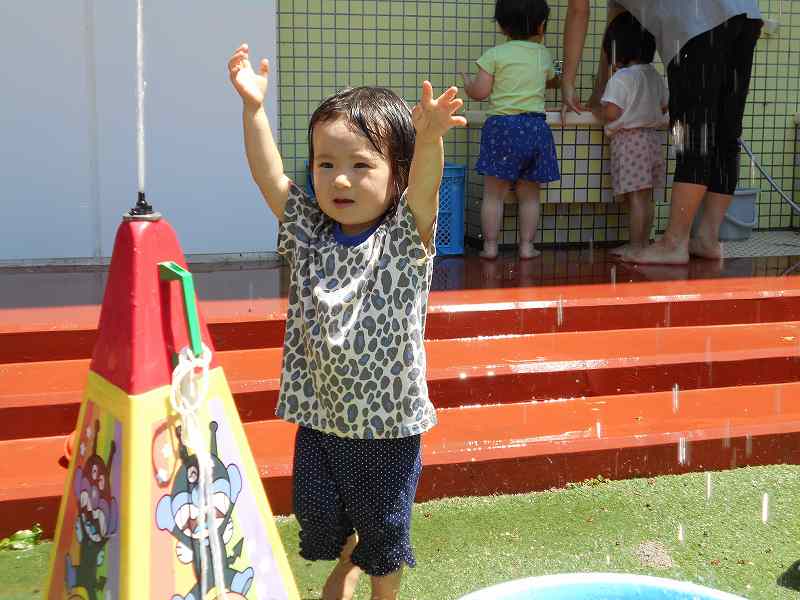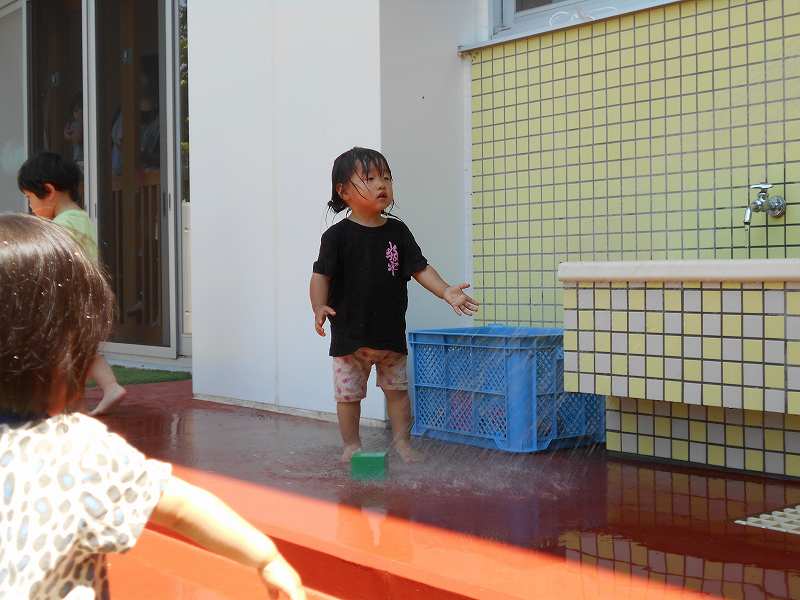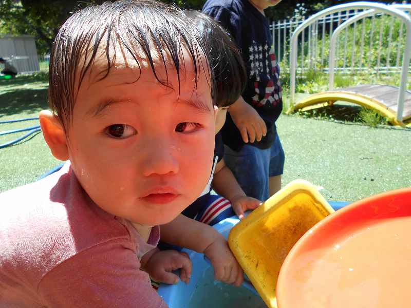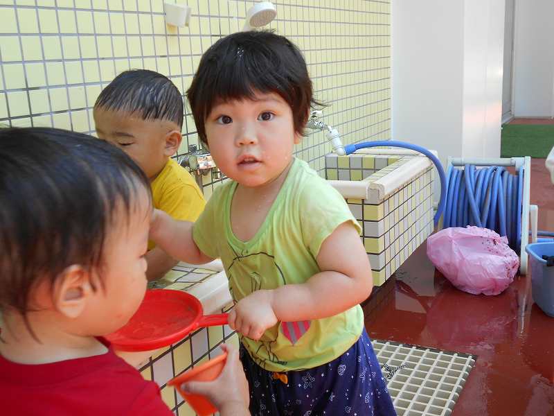 泥や水の感触を楽しみながら、溜まった泥水に入ったり、噴水のお水を浴びたりと夏ならではの遊びを存分に楽しんでいます。お顔に水や泥がはねてもへっちゃらです!
