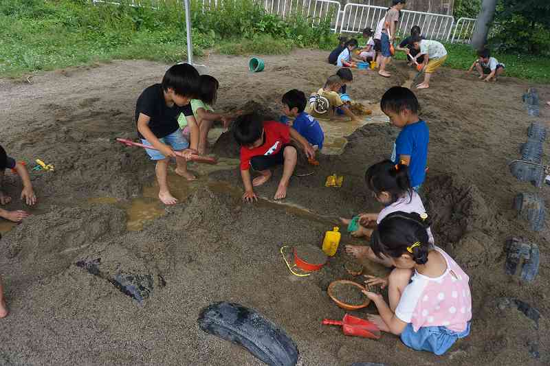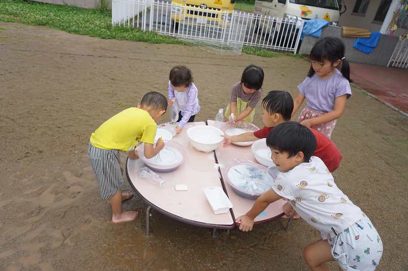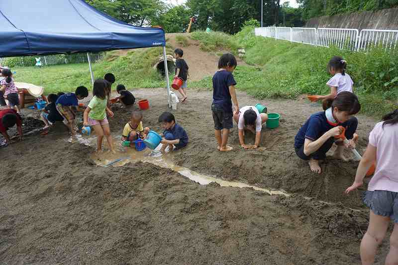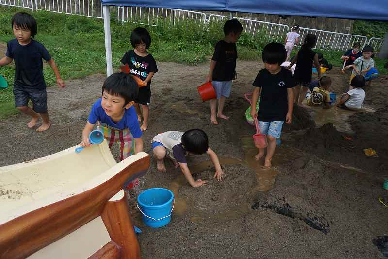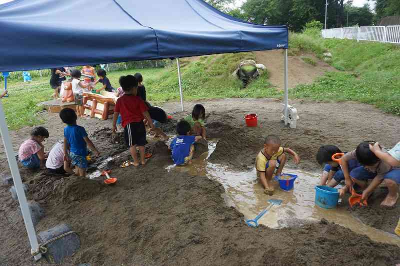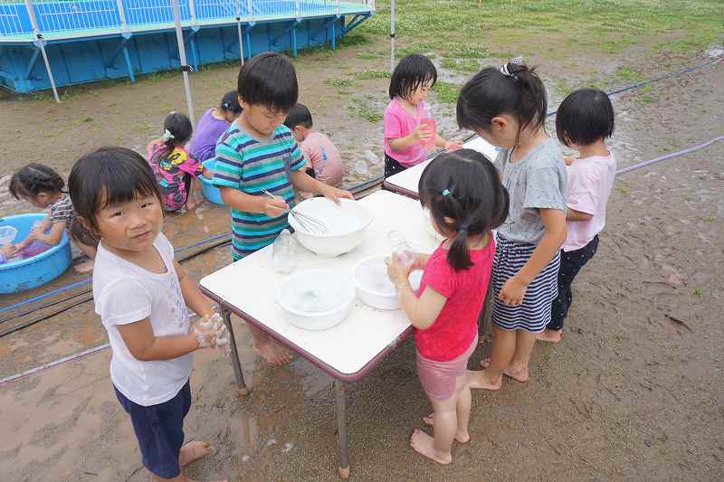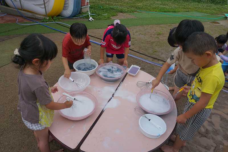 幼児組さんは北園庭で泥あそびや水あそび、水鉄砲や泡あそび、色水あそびなど夏ならではの遊びを存分に楽しんでいます。全身泥だらけになりながら、水たまりや川を作ったり、泡だて器を使ってふわふわな泡を作ったり、楽しそうな声が園庭からたくさん聞こえてきます!