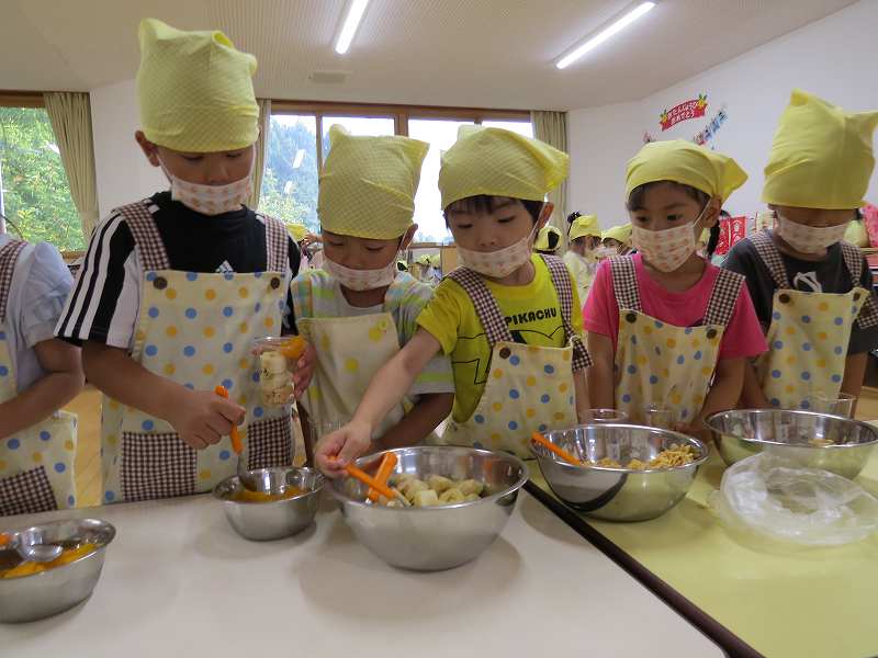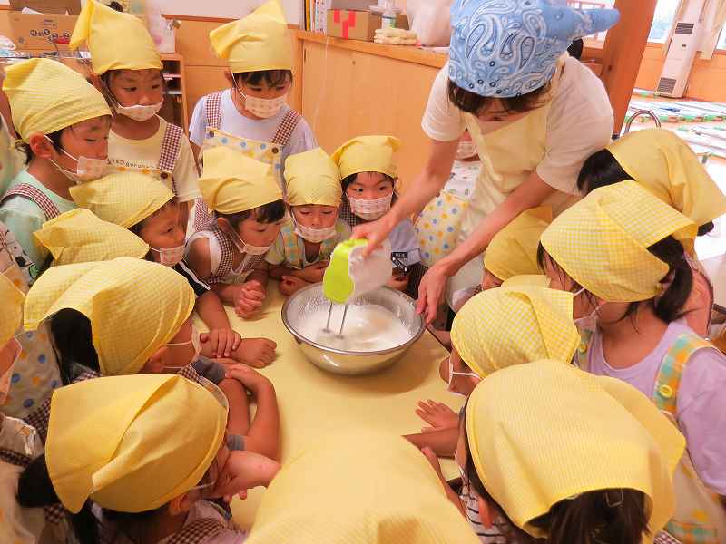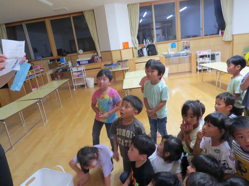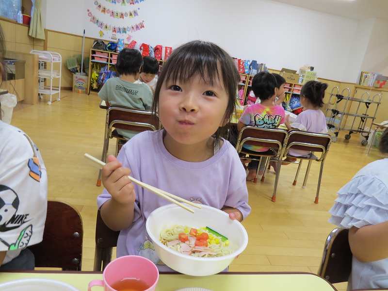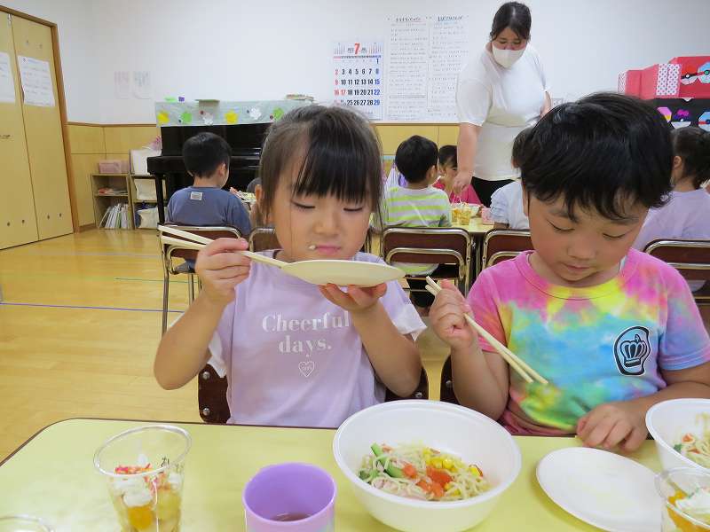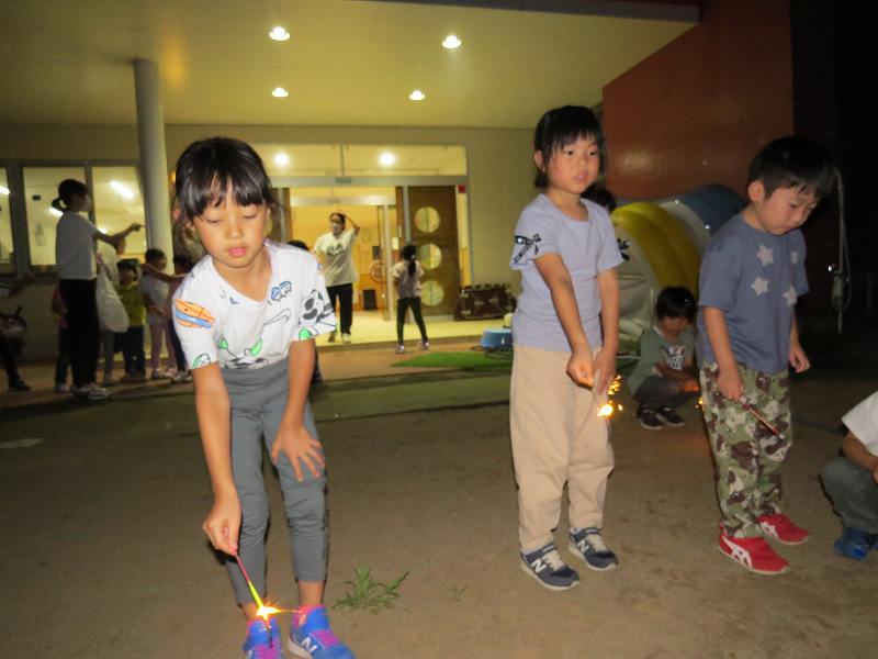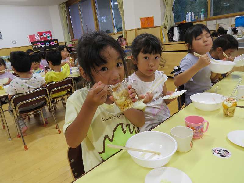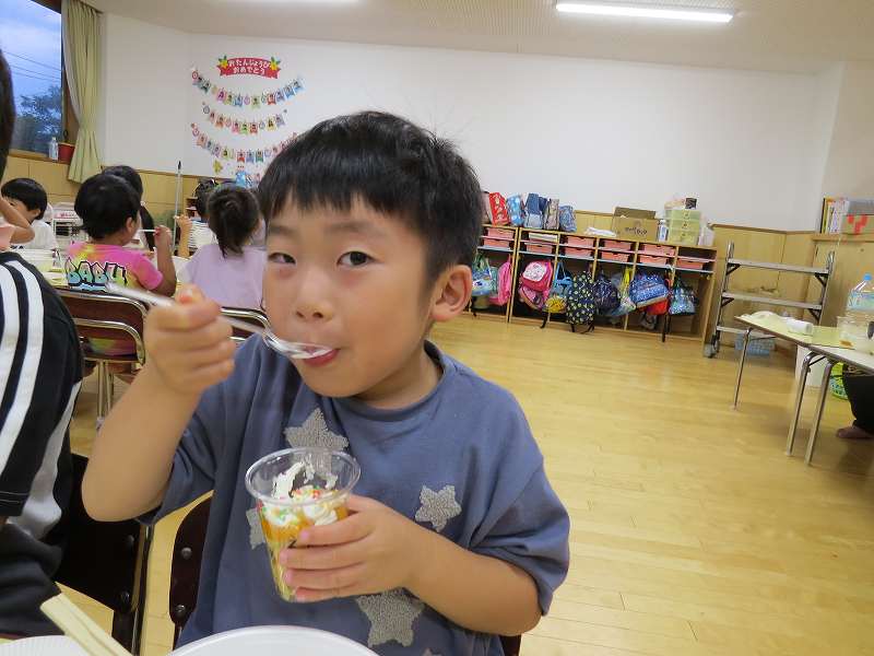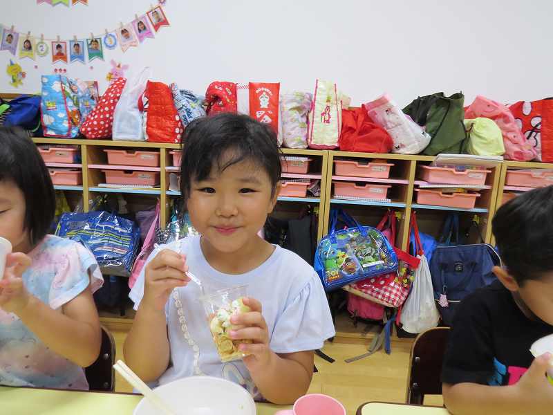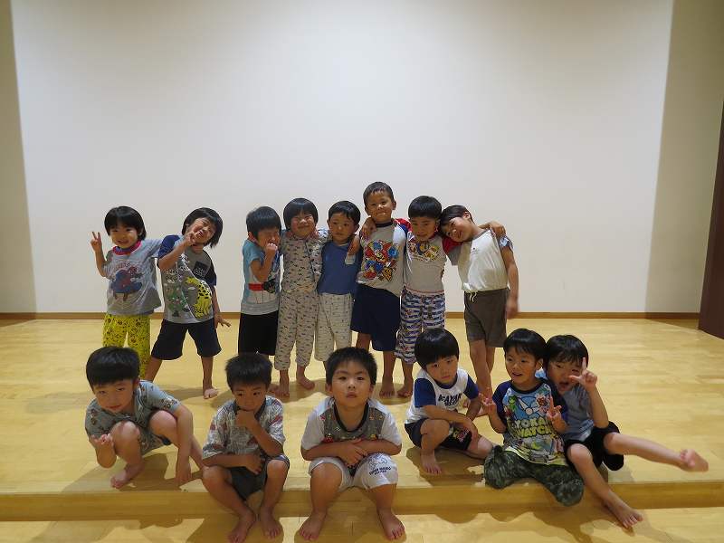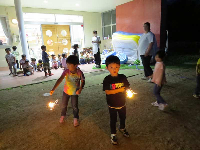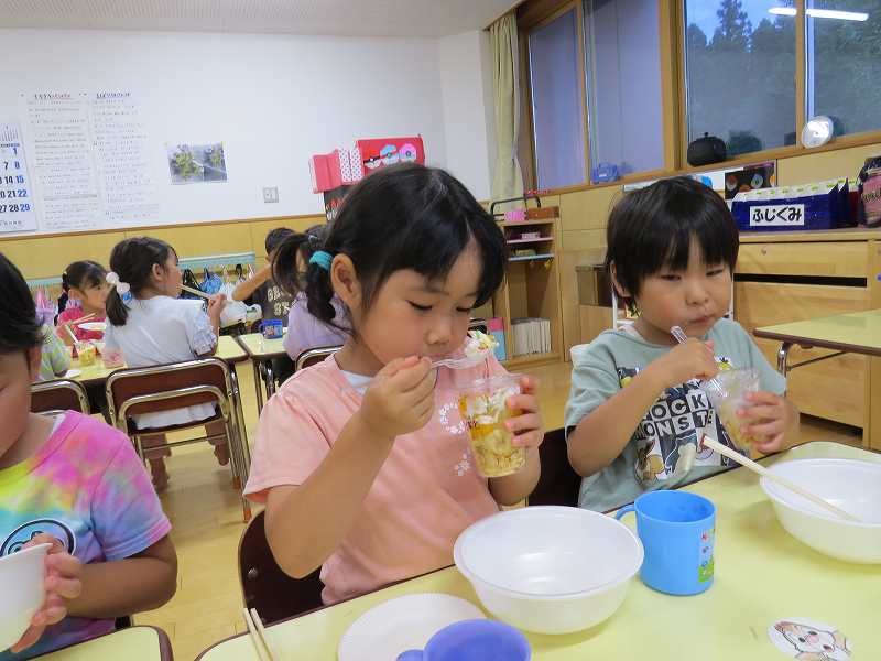 7月22日(土)~23日(日)ふじ組さんのお泊り保育がありました。お昼から集まり、始まりの会をしてお泊り保育がスタート!わくわくランドで遊び、小野川温泉でお風呂に入った後は田んぼアートがある展望台へ行きました。園に戻ると夕食作り。メニューは「冷やし中華・ポテトサラダ・フルーツパフェ」でした。野菜や果物を切り、ポテトサラダを作ったり、パフェを盛りつけたら美味しい夕食の完成。みんなで作った夕食は格別でした。夕食後は花火や夜の宝探しゲームを楽しみ1日目が終了。めいいっぱい遊んで、いっぱい食べて大満足のふじ組さん。おやすみなさいをすると、あっという間に夢の中でした。
