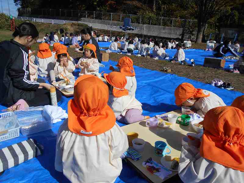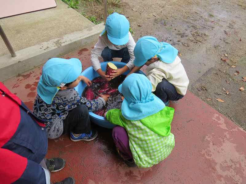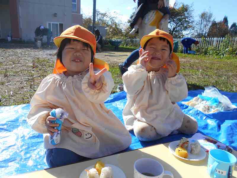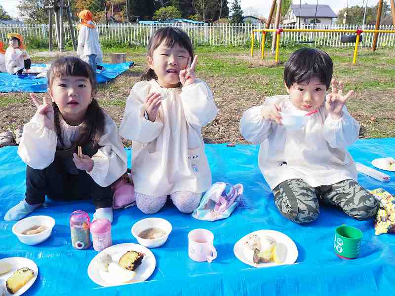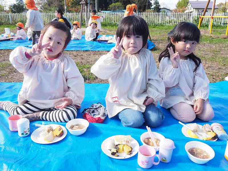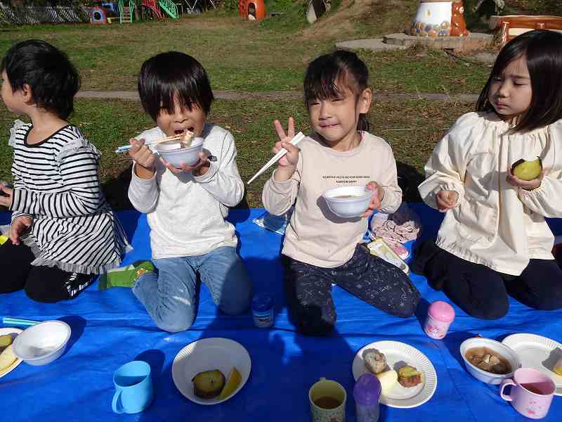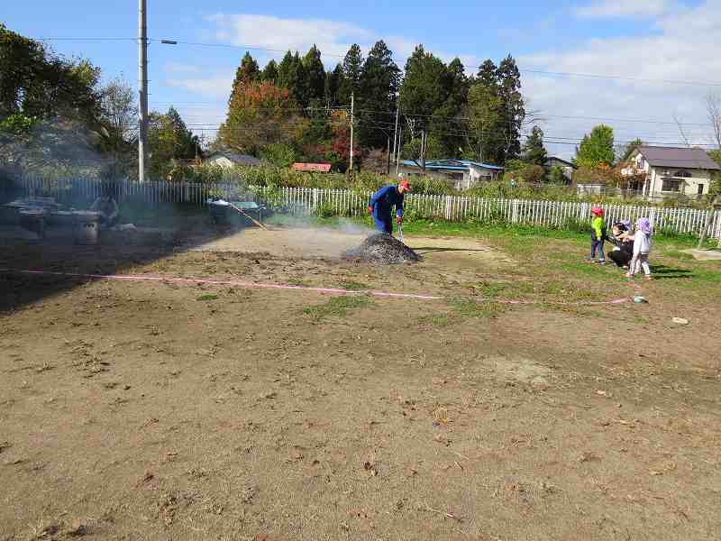 8日(水)ふじ組さんが育てたサツマイモと里芋をを使って、焼いも&芋煮パーティーをしました。おいしい焼いもが出来るようにと、数日前から落ち葉をたくさん集めてくれた子ども達のおかげで、ホクホクであま~い焼いもが出来ました!大きなお鍋二つで作った芋煮もとっても美味しくて、きれいに完食でした!