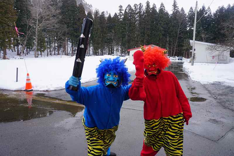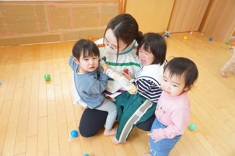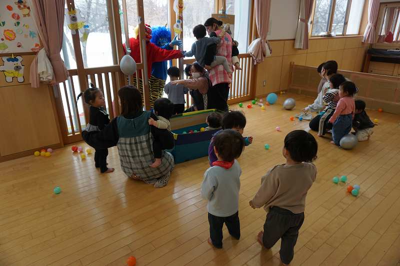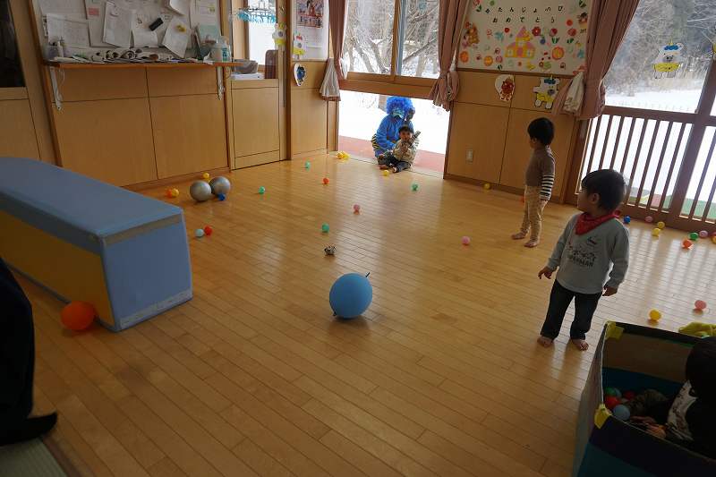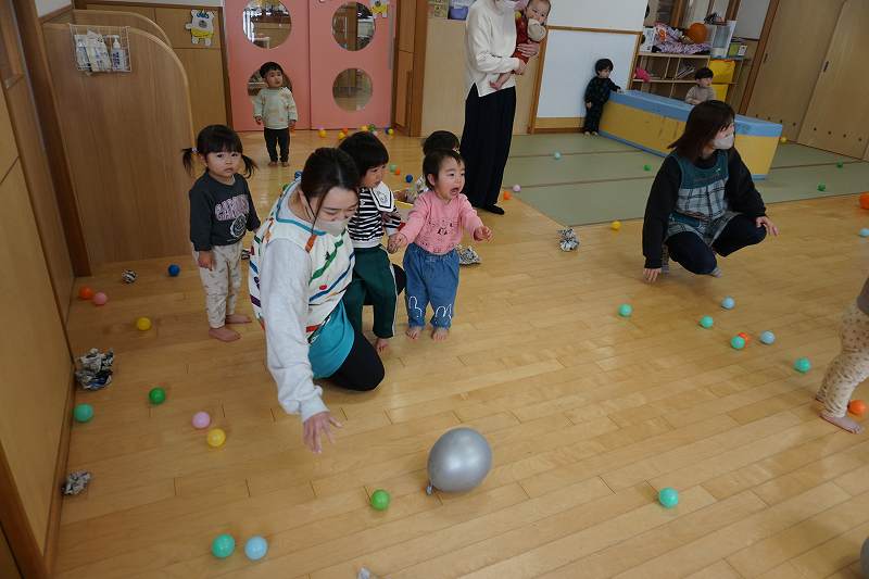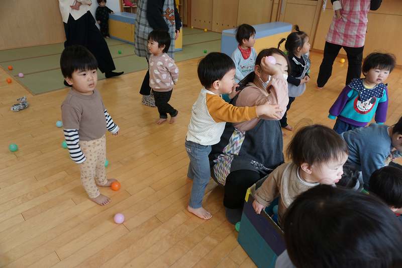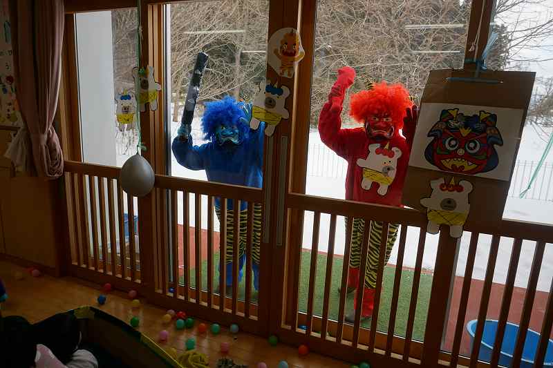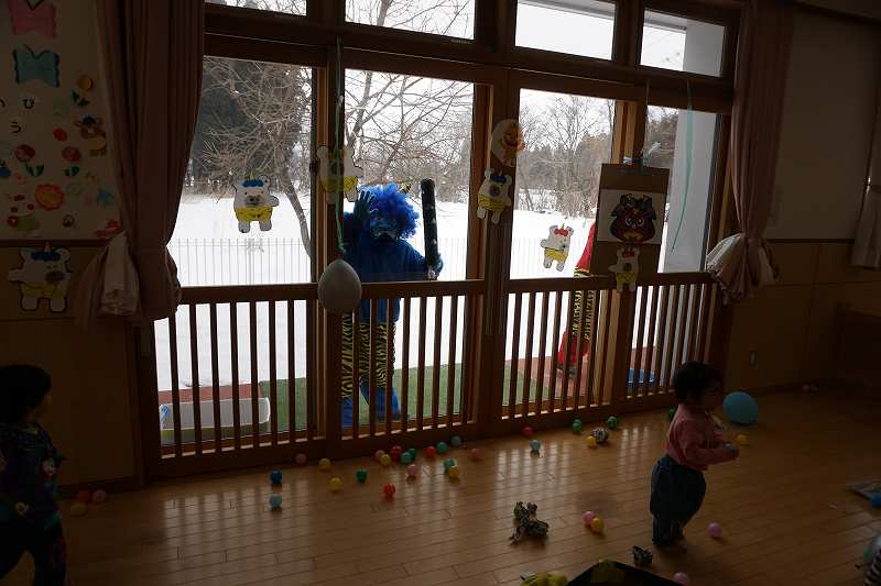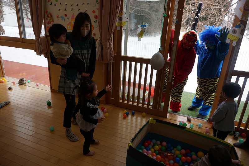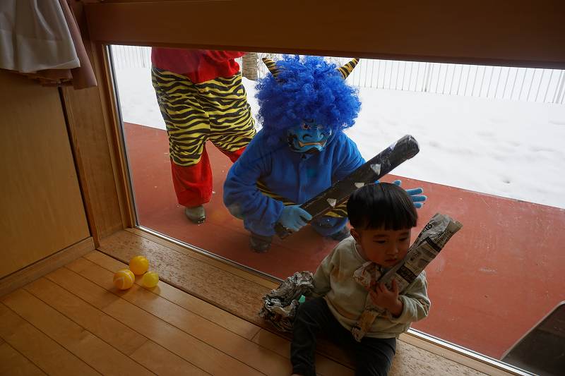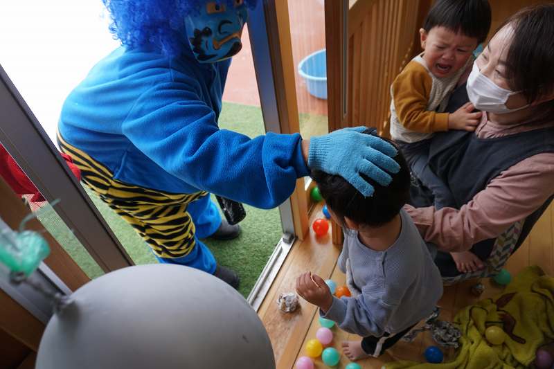 お遊戯室へ登場する前に、じつはこっそり乳児組さんのお部屋にも鬼さんが遊びに来ていました。