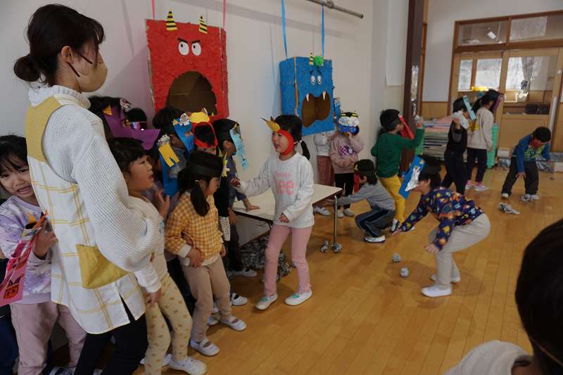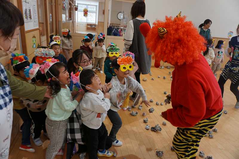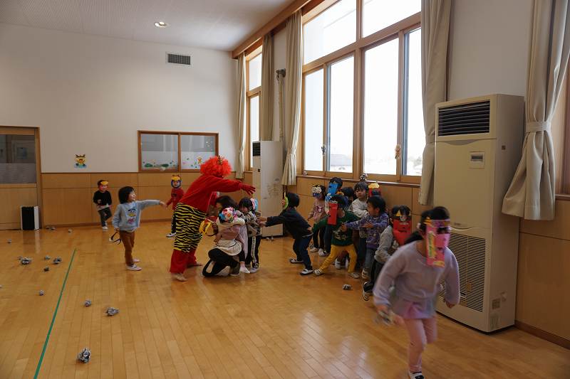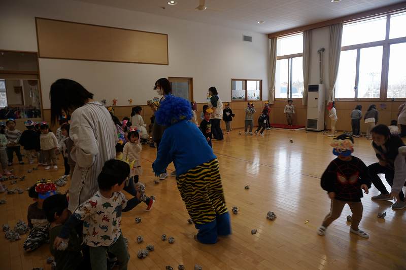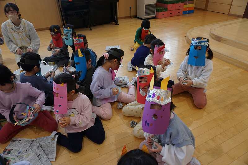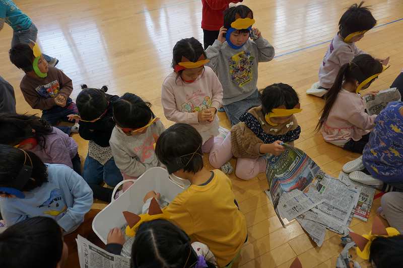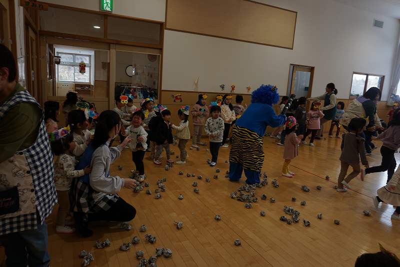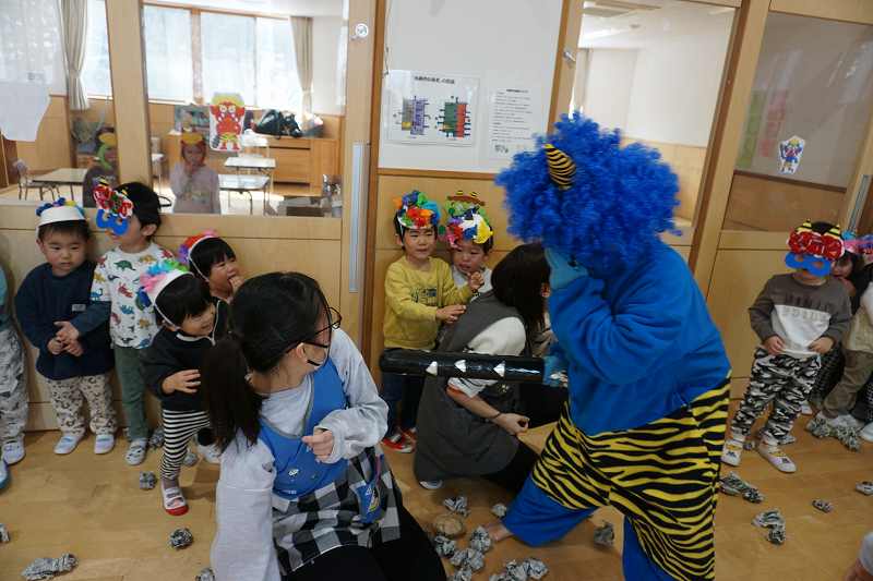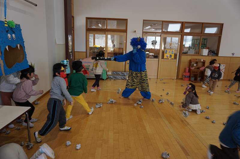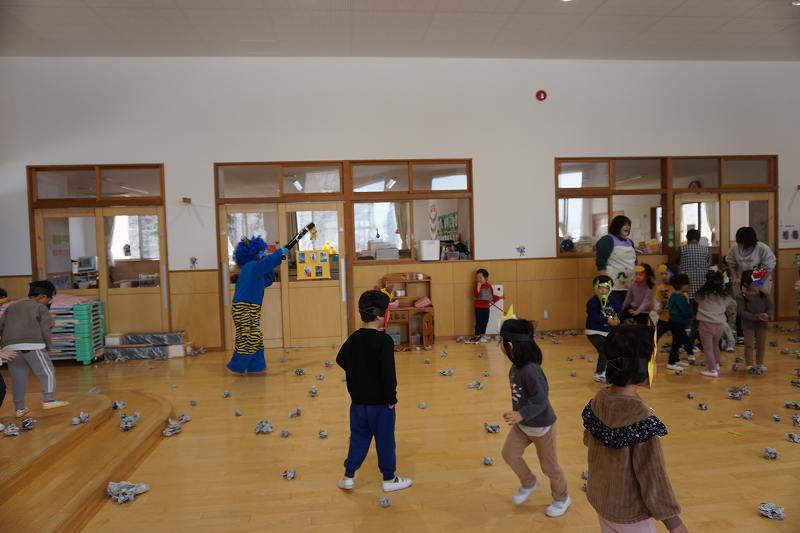 2月3日節分前日の2日(金)お遊戯室で豆まき集会を行いました。節分の由来のお話を聞いたり、制作した鬼のお面を紹介した後は、みんなで心の中にいる鬼を退治しよう!と新聞紙で豆作りをしました。豆を作り豆まきごっこをしていると・・・あわてんぼうの鬼さんが一日早くこども園のお遊戯室に!まさかの鬼の登場にビックリして逃げ回る子ども達。ビックリしながらも勇敢なお友だちは鬼に向かって豆を投げ、みごとに鬼を退治してくれました!