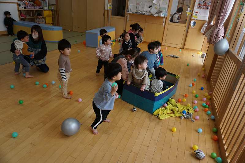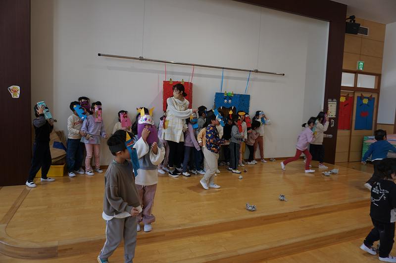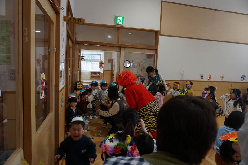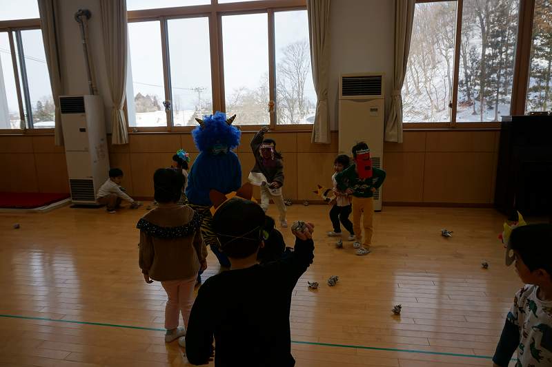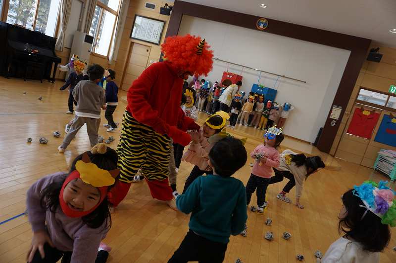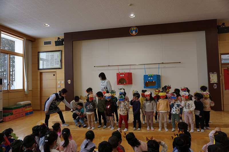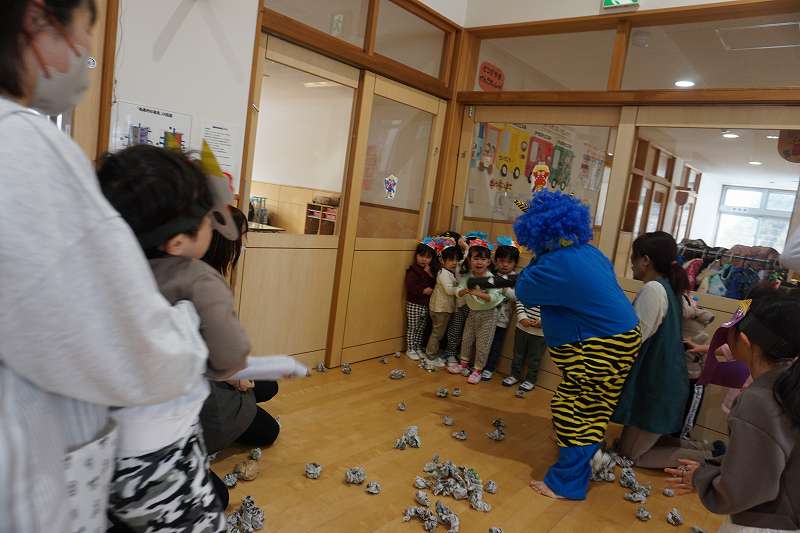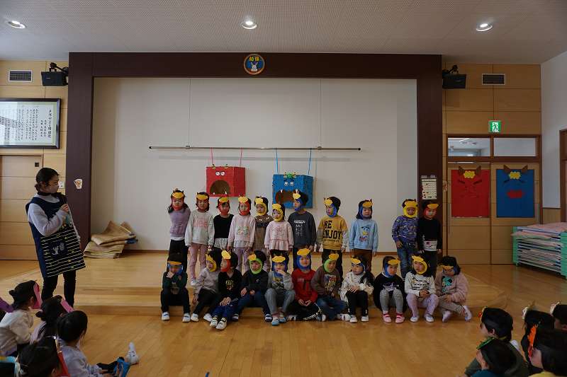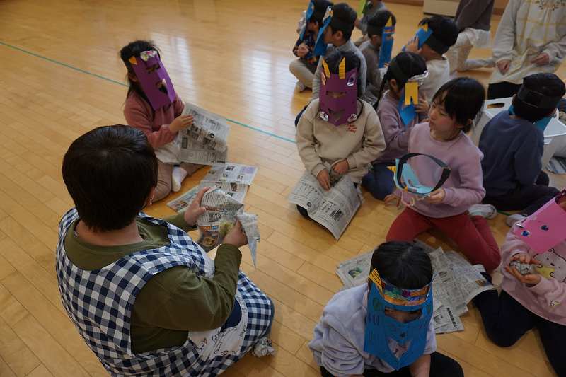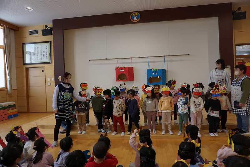 2月3日節分前日の2日(金)お遊戯室で豆まき集会を行いました。節分の由来のお話を聞いたり、制作した鬼のお面を紹介した後は、みんなで心の中にいる鬼を退治しよう!と新聞紙で豆作りをしました。豆を作り豆まきごっこをしていると・・・あわてんぼうの鬼さんが一日早くこども園のお遊戯室に!まさかの鬼の登場にビックリして逃げ回る子ども達。ビックリしながらも勇敢なお友だちは鬼に向かって豆を投げ、みごとに鬼を退治してくれました!