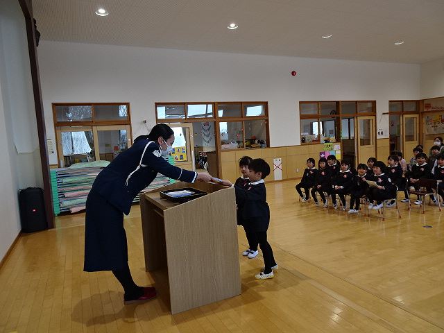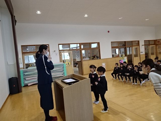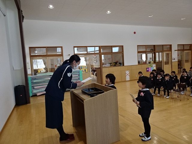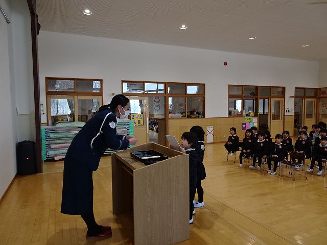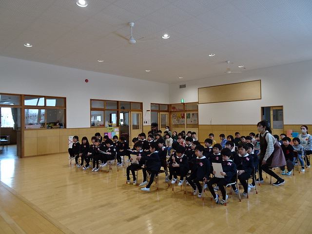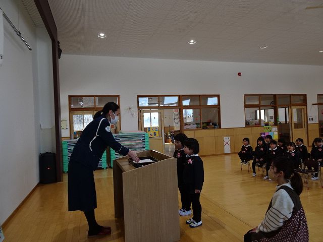 2月14日(水)ふじ組さんとすみれ組さんがかもしかクラブ修了式に参加しました。2年間、かもしかクラブで交通安全の紙芝居を見たり指導員さんから交通ルールのお話を聞いたりし、命の大切さを学んだふじ組さん。教えて頂いた交通ルールを守って、4月から元気に小学校に通いましょうね。