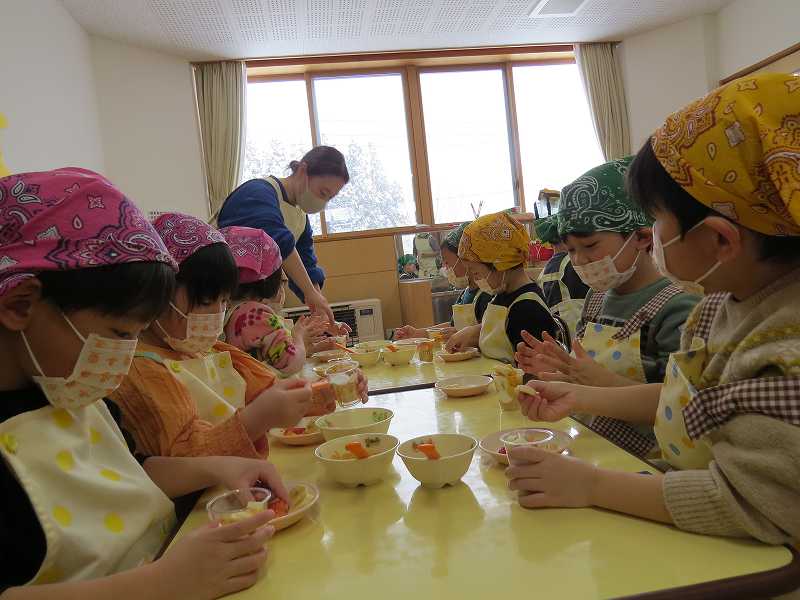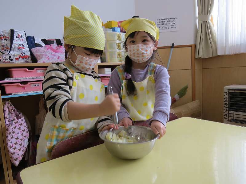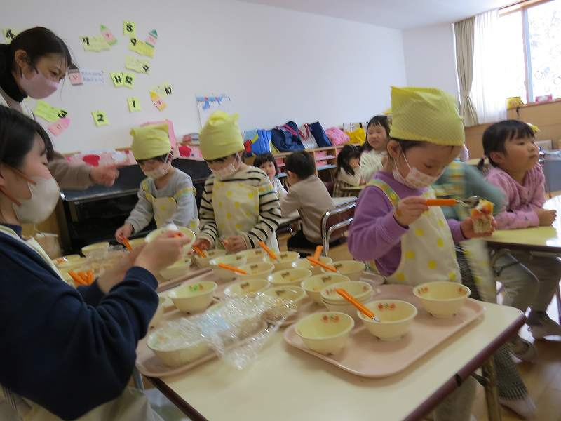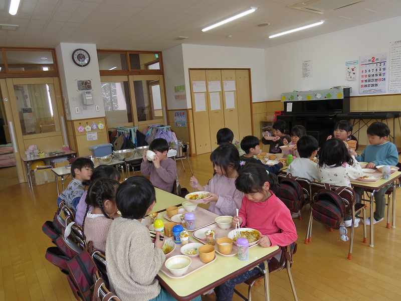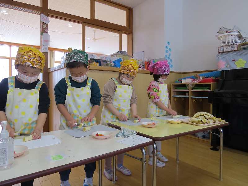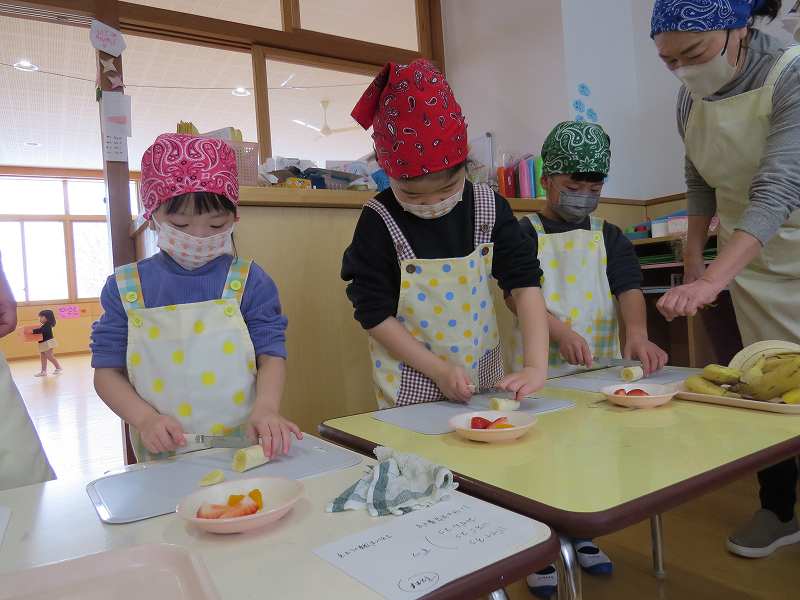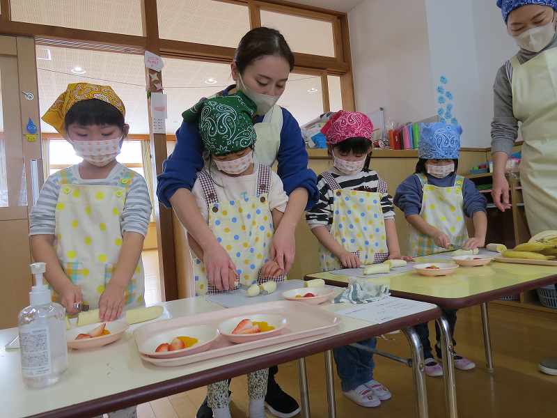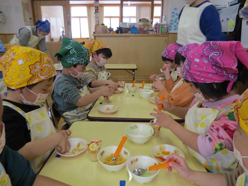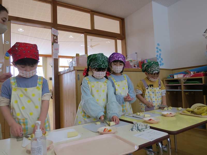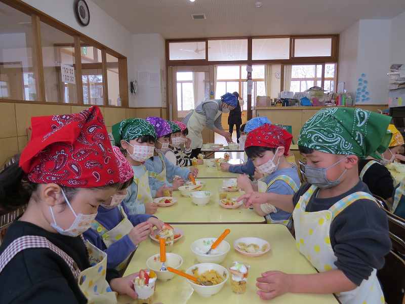 2月22日(木)ランチパーティがありました。ふじ組さんはサラダやカレーの野菜を包丁で切り、すみれ組さんはパフェのバナナをステーキナイフで切り、さくら組さんはポテトサラダのジャガイモをマッシャーで潰しました。フルーツパフェは、ぱんだ組さん~ふじ組さんが自分で盛り付けをして、オリジナルのスペシャルパフェを作りました!さくら組さん~ふじ組さんは好きなクラスを選び、異年齢で会話も弾みながらの楽しい食事になりました。