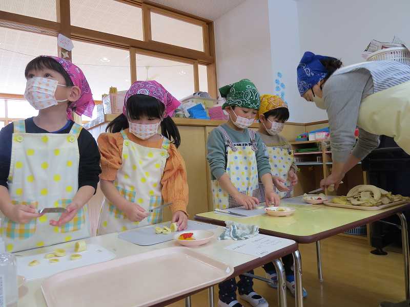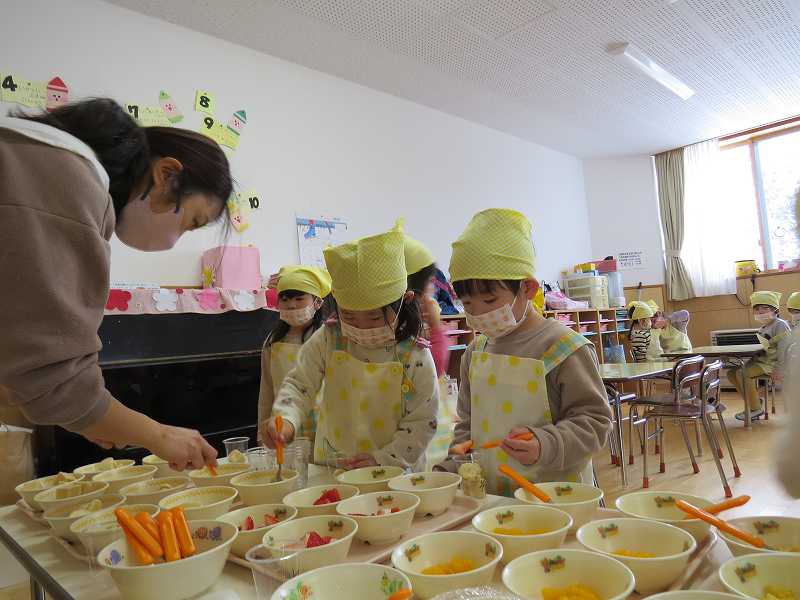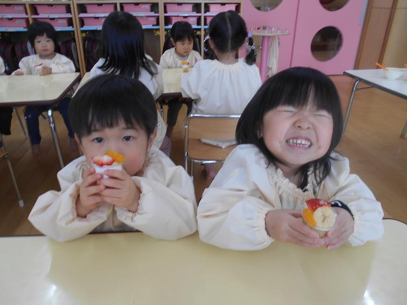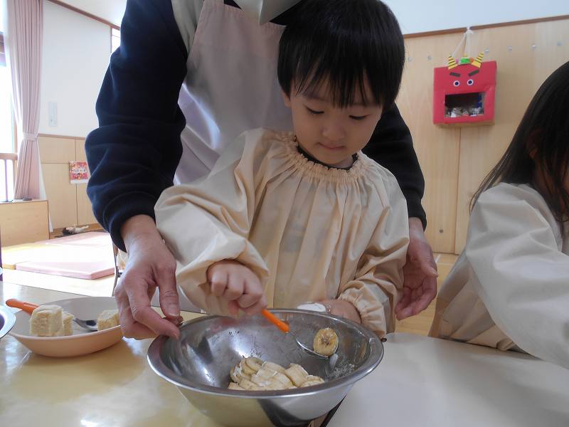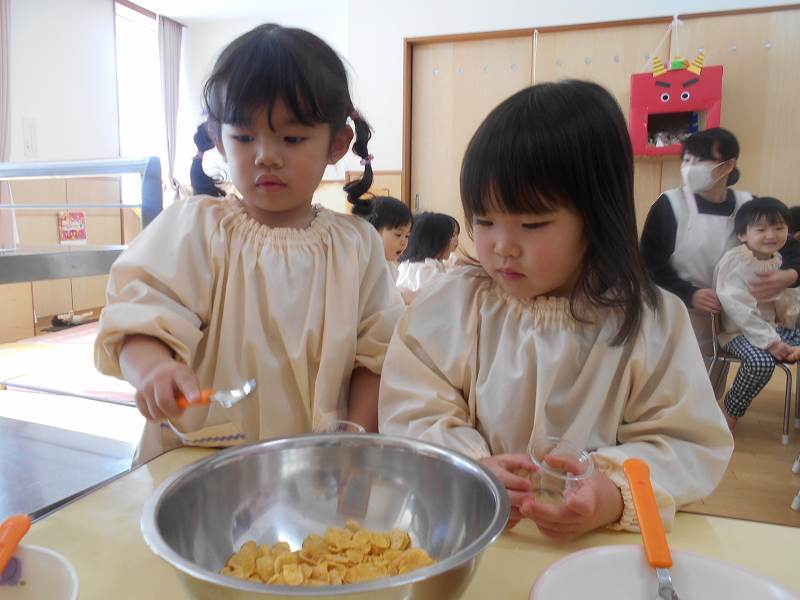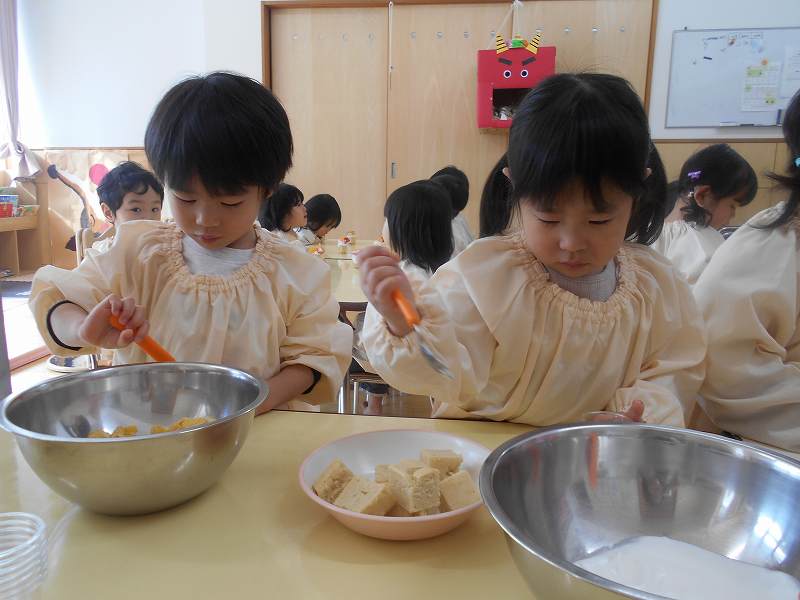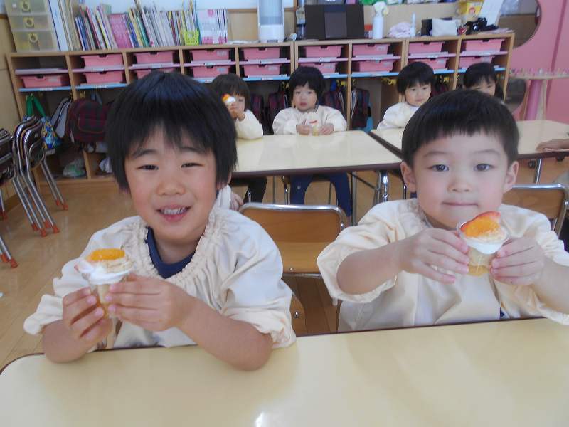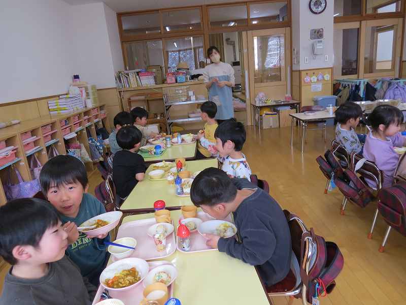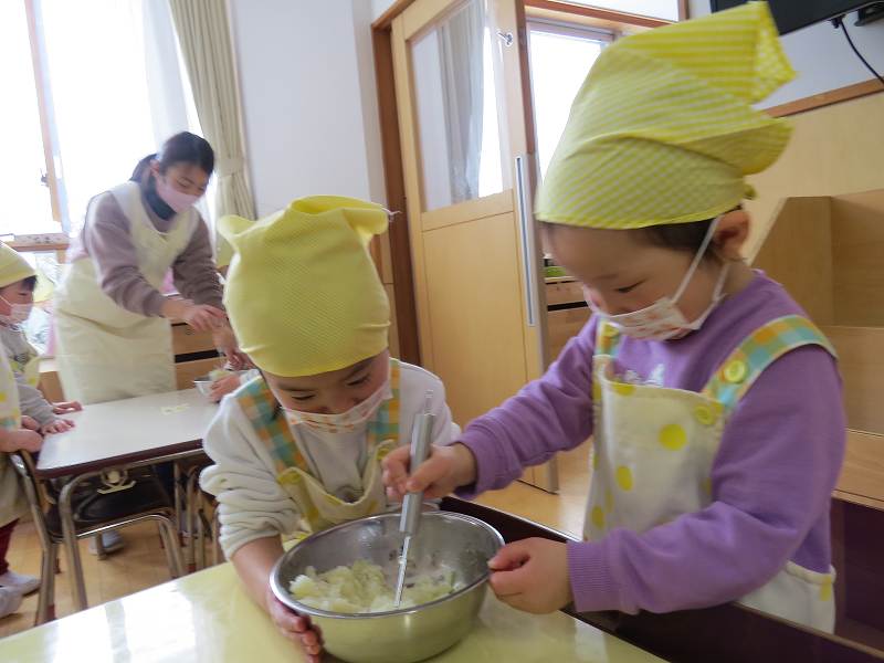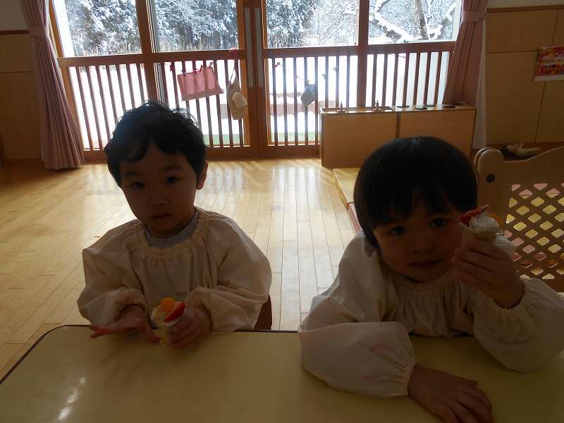 2月22日(木)ランチパーティがありました。ふじ組さんはサラダやカレーの野菜を包丁で切り、すみれ組さんはパフェのバナナをステーキナイフで切り、さくら組さんはポテトサラダのジャガイモをマッシャーで潰しました。フルーツパフェは、ぱんだ組さん~ふじ組さんが自分で盛り付けをして、オリジナルのスペシャルパフェを作りました!さくら組さん~ふじ組さんは好きなクラスを選び、異年齢で会話も弾みながらの楽しい食事になりました。