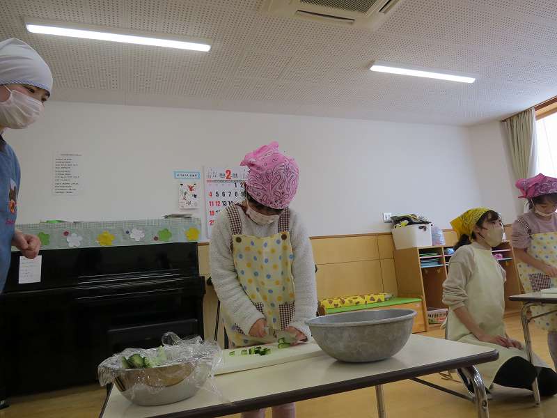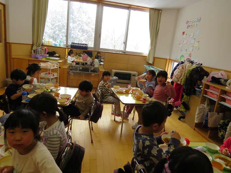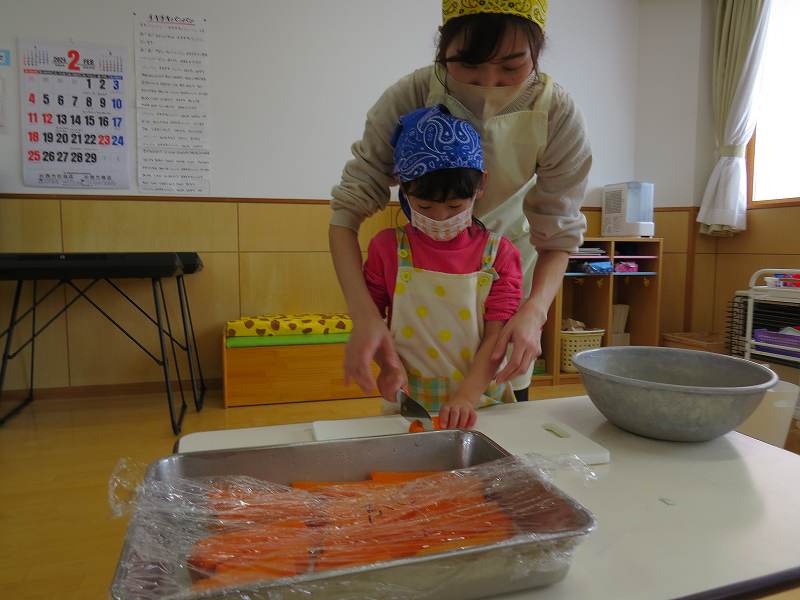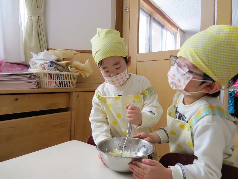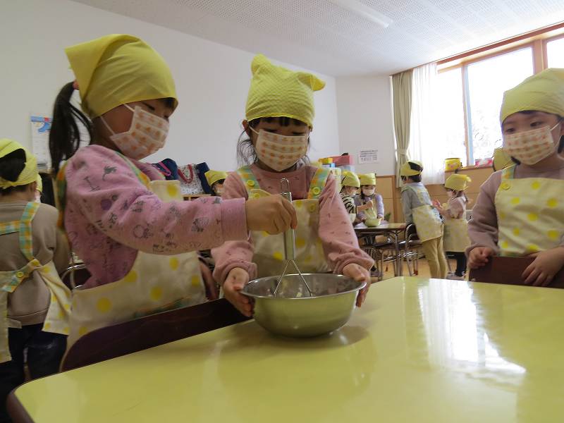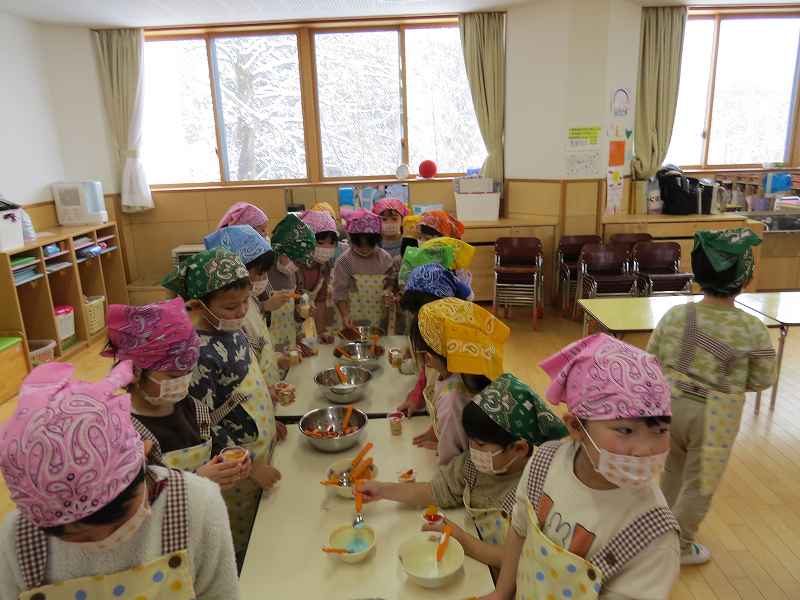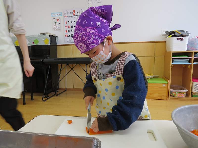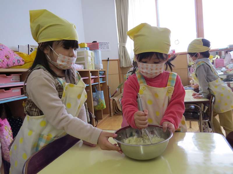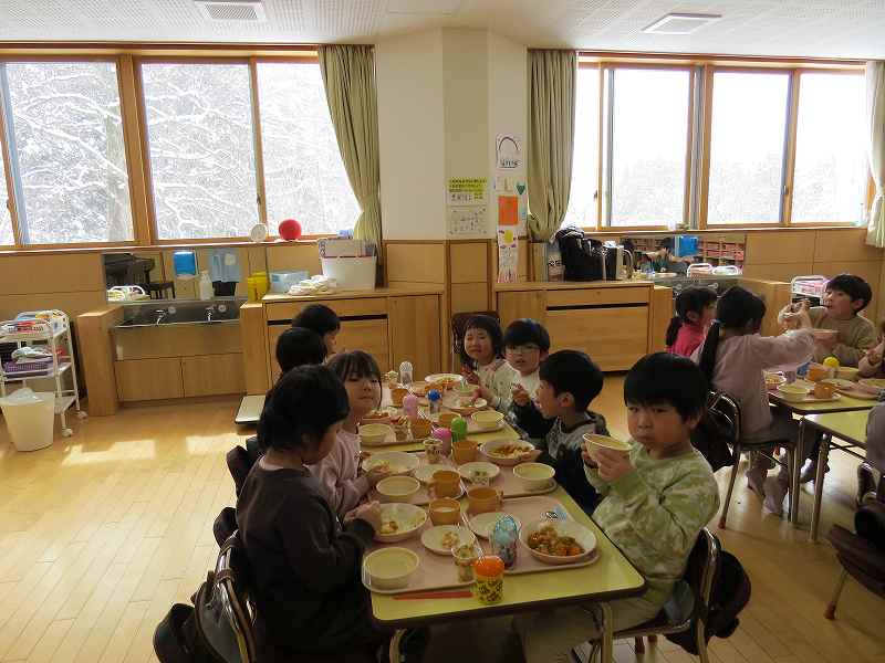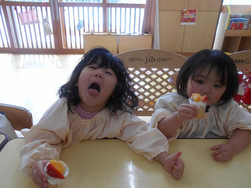 2月22日(木)ランチパーティがありました。ふじ組さんはサラダやカレーの野菜を包丁で切り、すみれ組さんはパフェのバナナをステーキナイフで切り、さくら組さんはポテトサラダのジャガイモをマッシャーで潰しました。フルーツパフェは、ぱんだ組さん~ふじ組さんが自分で盛り付けをして、オリジナルのスペシャルパフェを作りました!さくら組さん~ふじ組さんは好きなクラスを選び、異年齢で会話も弾みながらの楽しい食事になりました。
