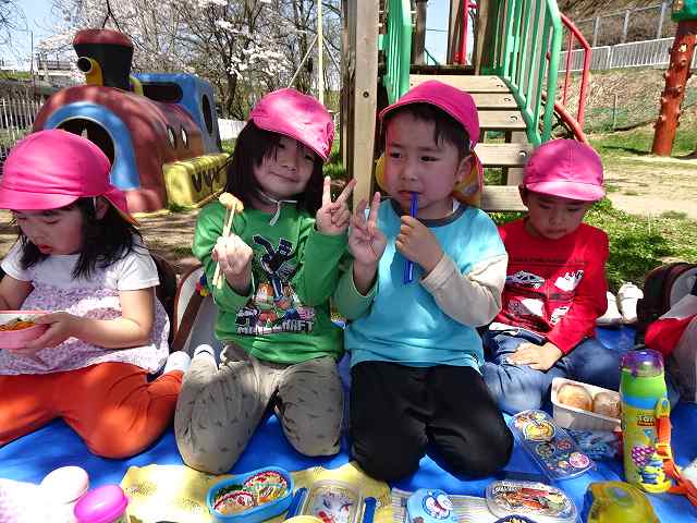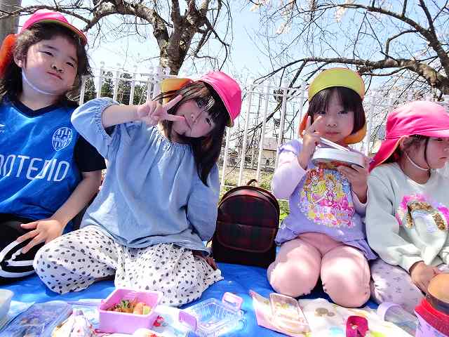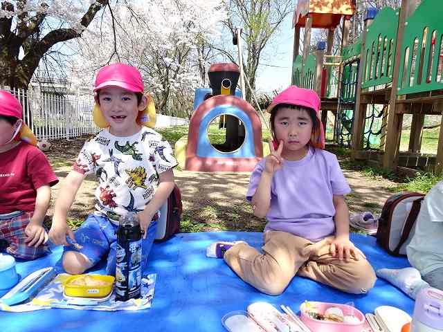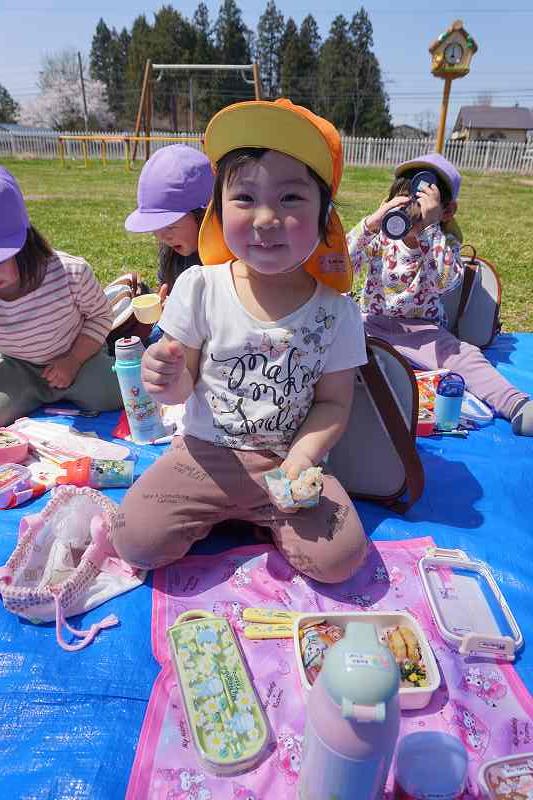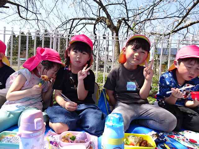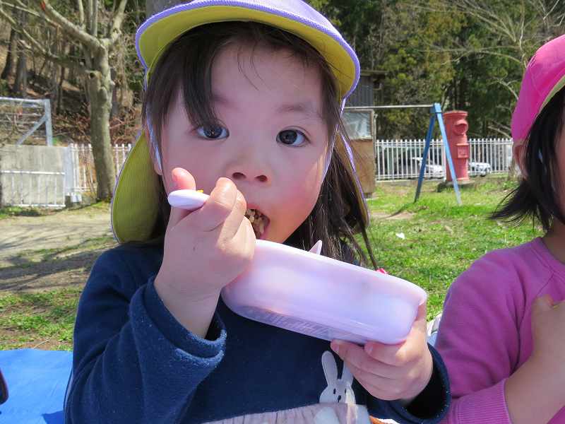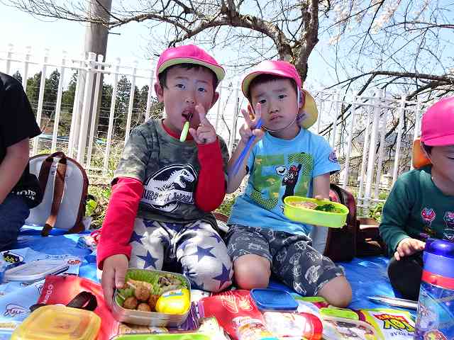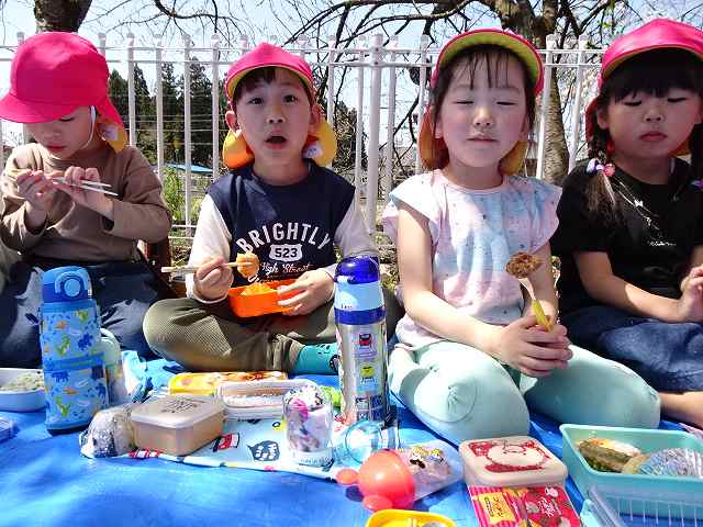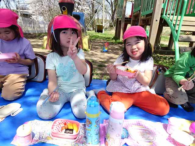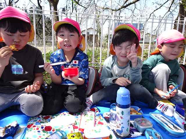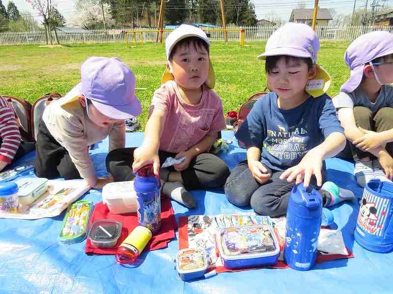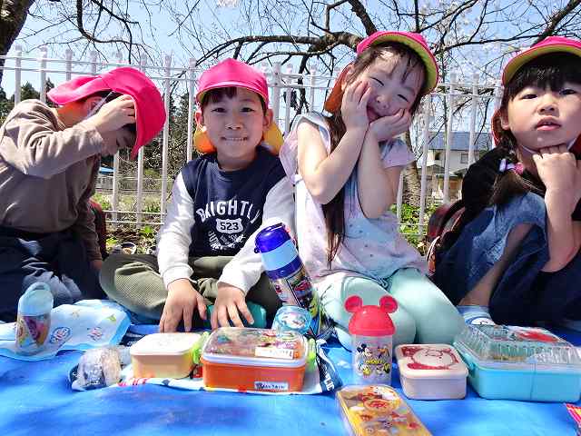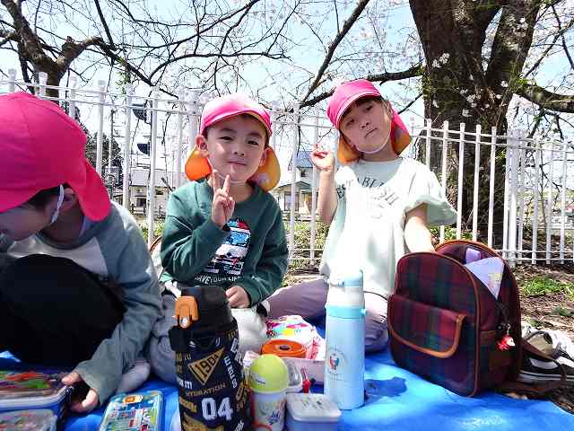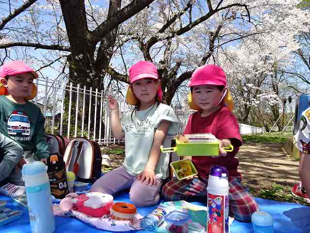 15日(月)のお弁当の日。園庭の桜がきれいな満開になったので、幼児組さんがお花見をしました。お天気も良くきれいな桜の下で会話も弾みなが美味しいお弁当をいただきました。