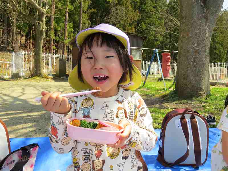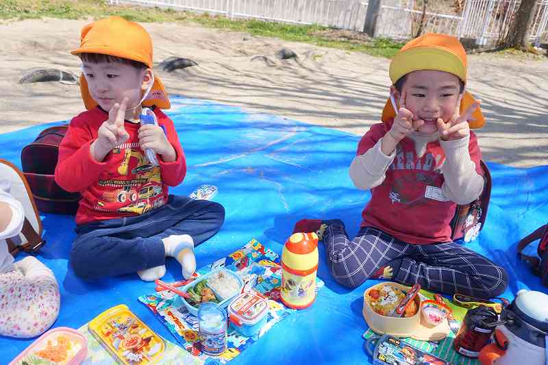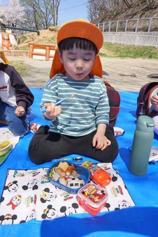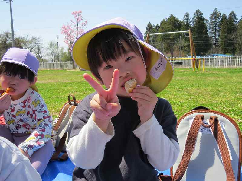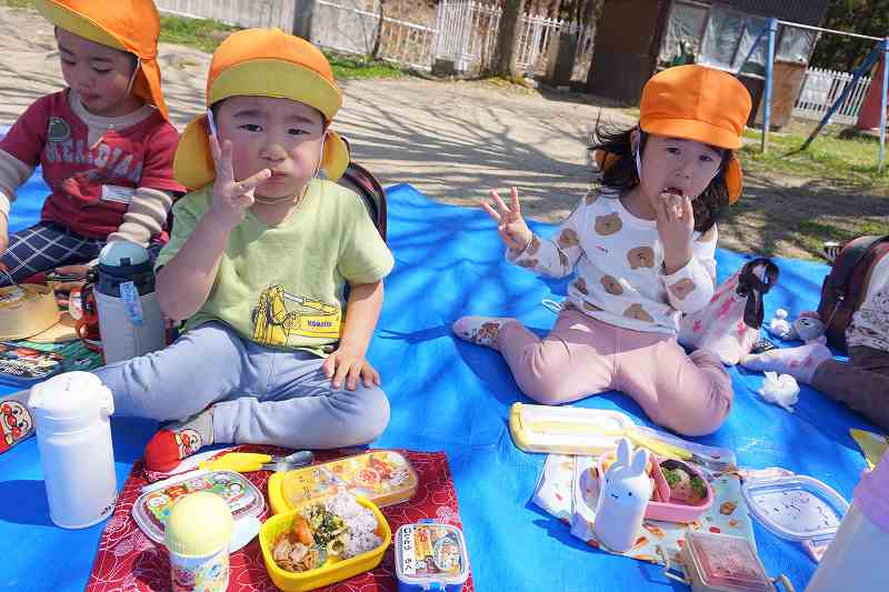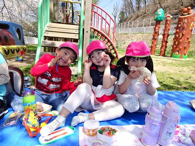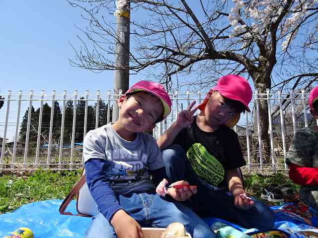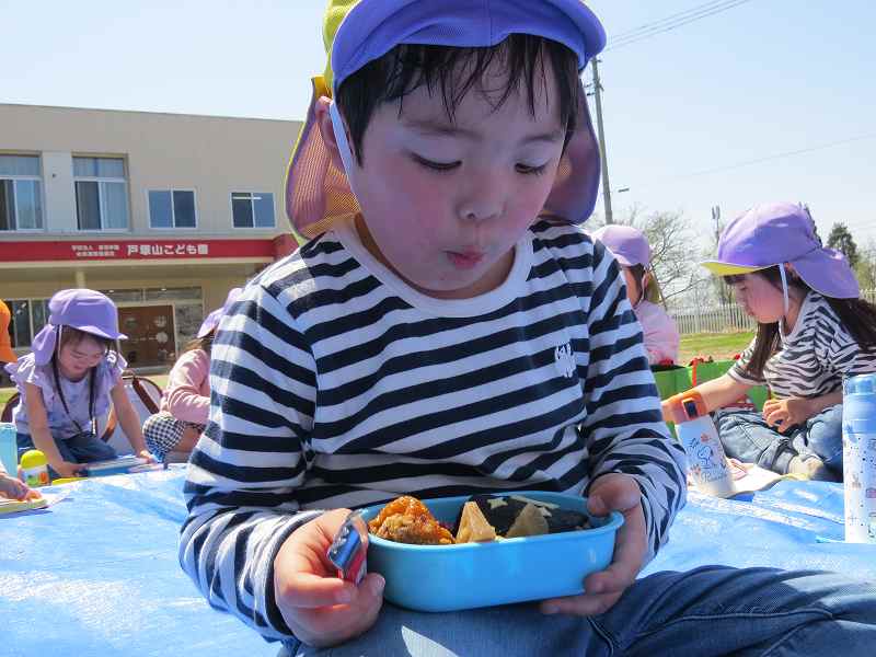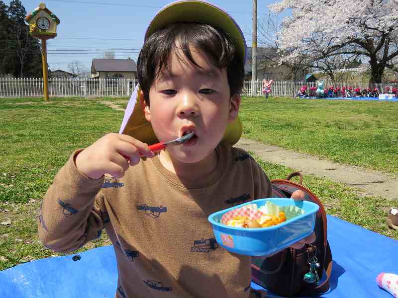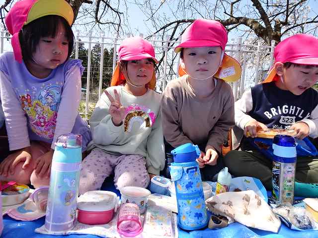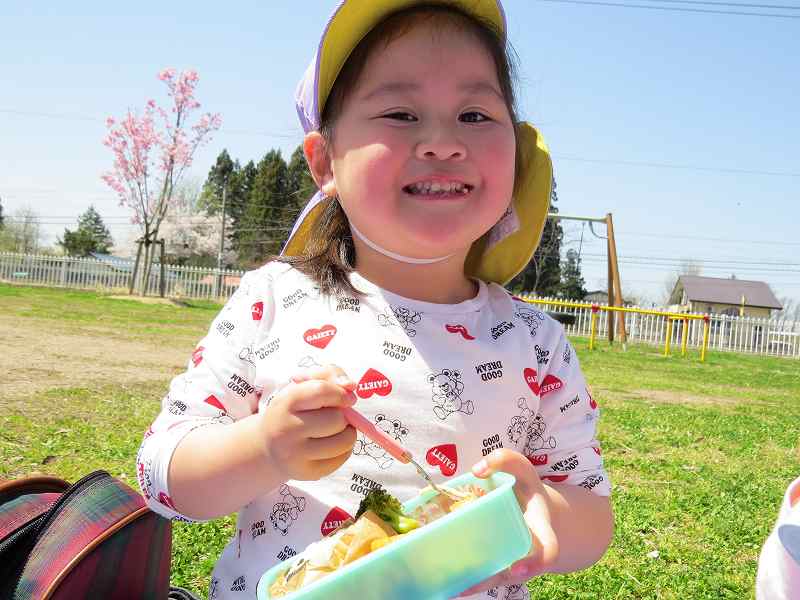 15日(月)のお弁当の日。園庭の桜がきれいな満開になったので、幼児組さんがお花見をしました。お天気も良くきれいな桜の下で会話も弾みなが美味しいお弁当をいただきました。