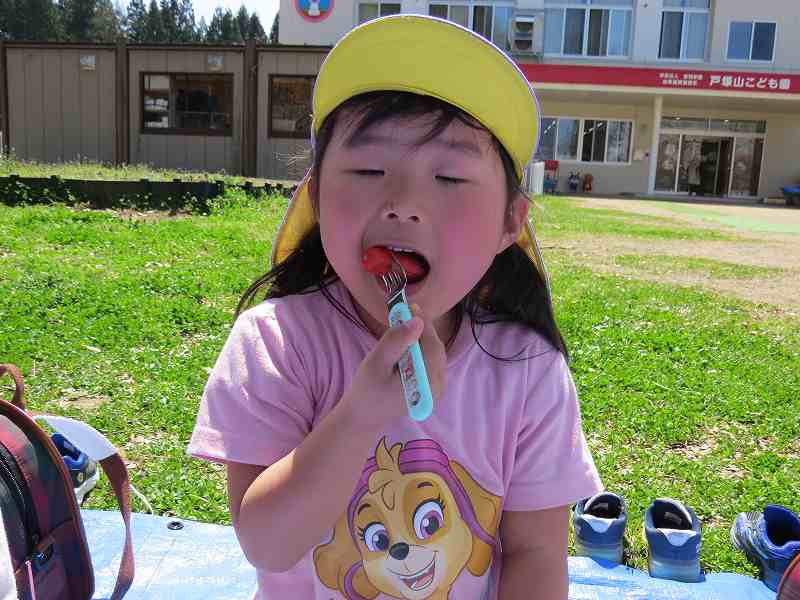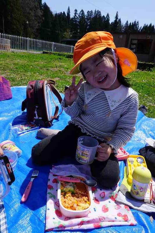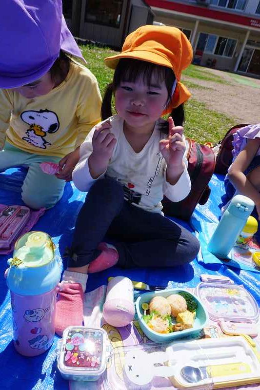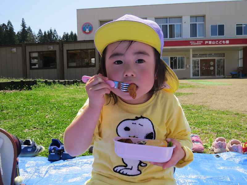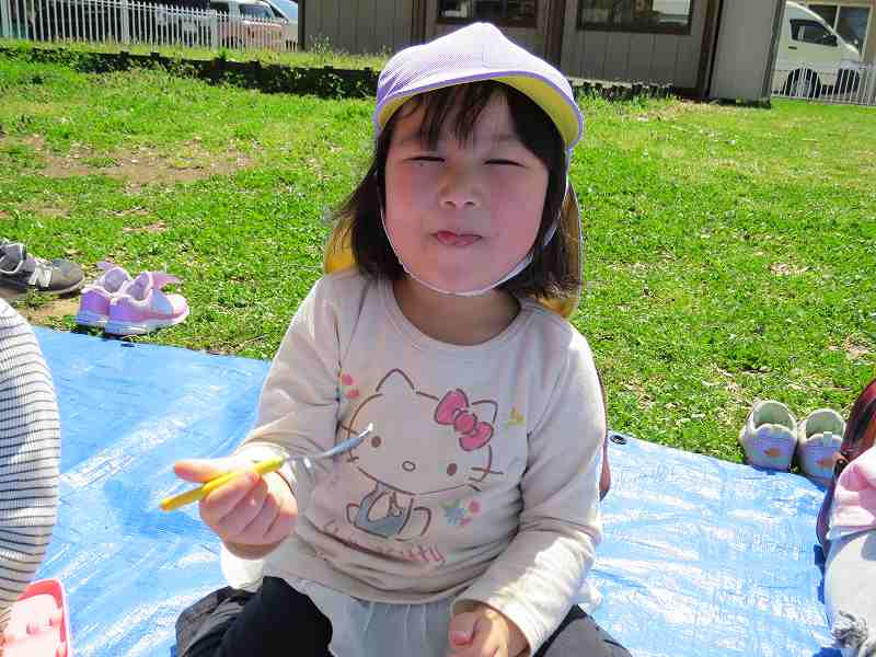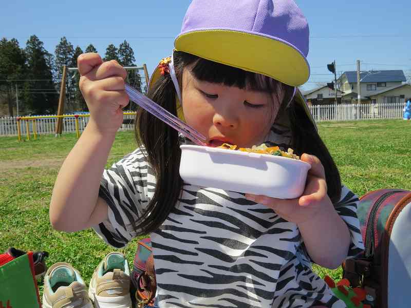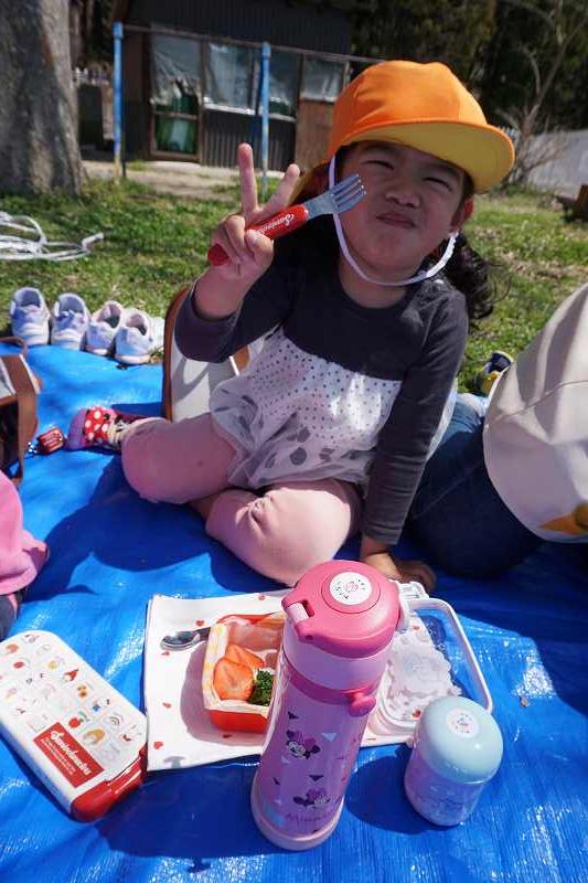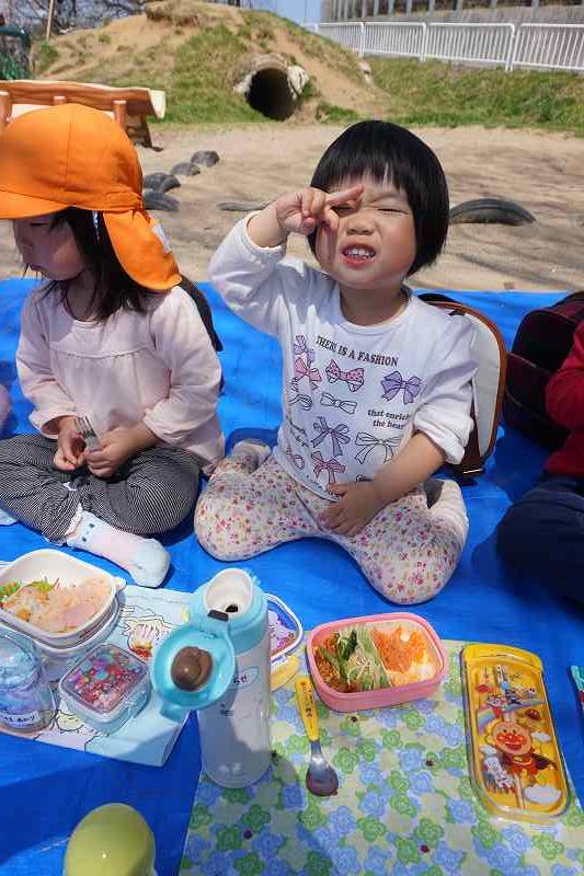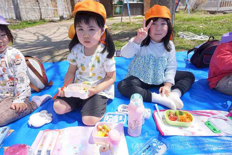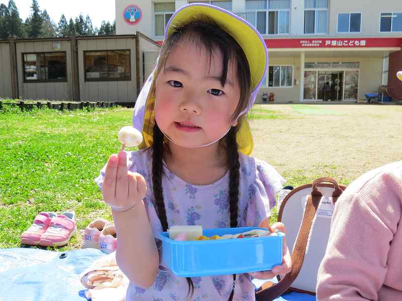 15日(月)のお弁当の日。園庭の桜がきれいな満開になったので、幼児組さんがお花見をしました。お天気も良くきれいな桜の下で会話も弾みなが美味しいお弁当をいただきました。