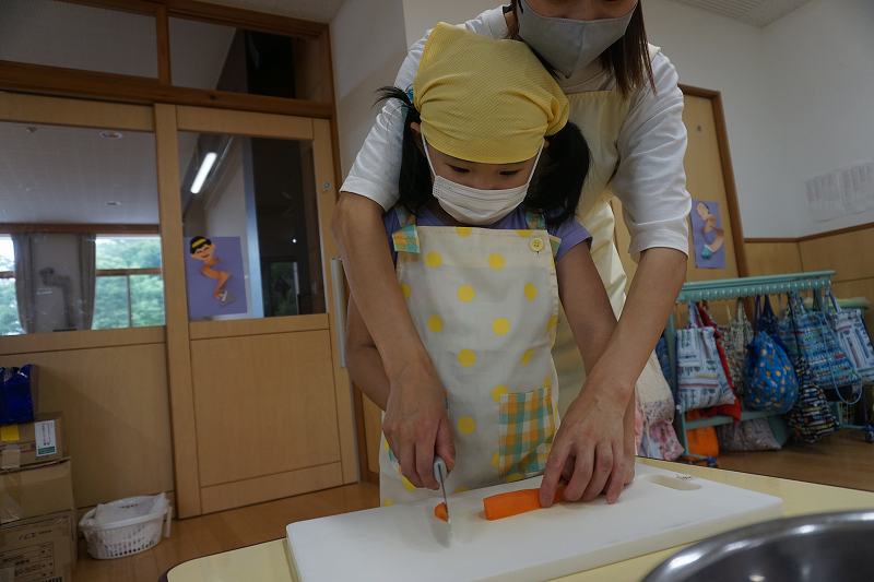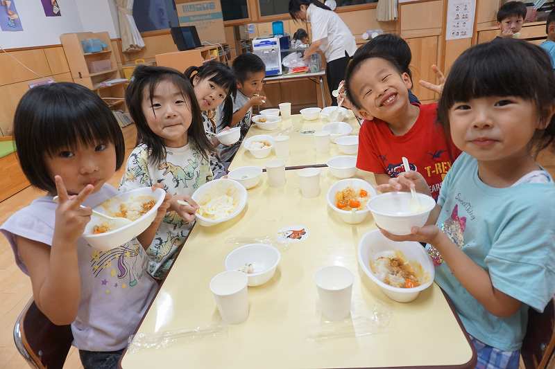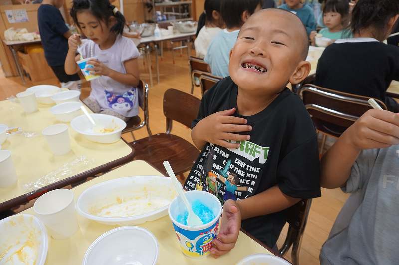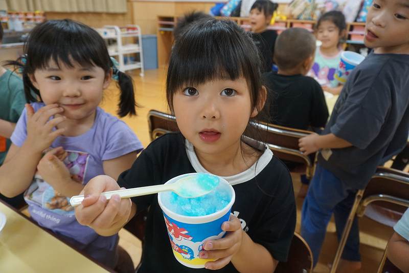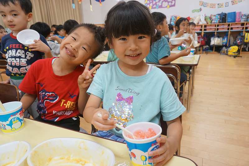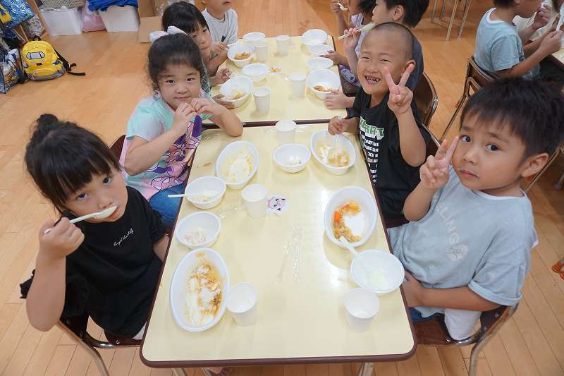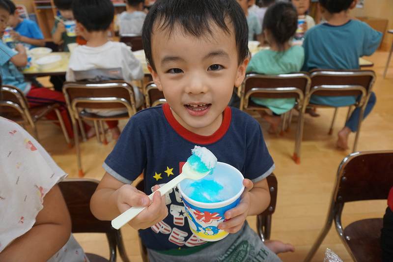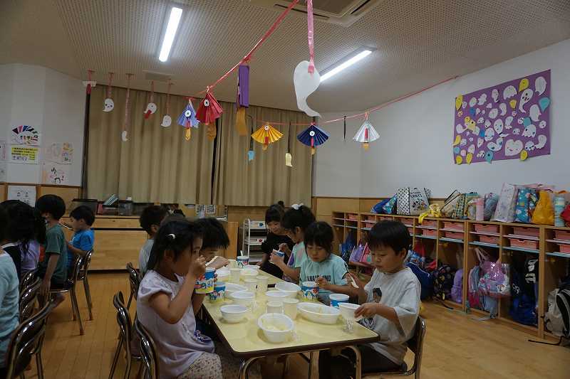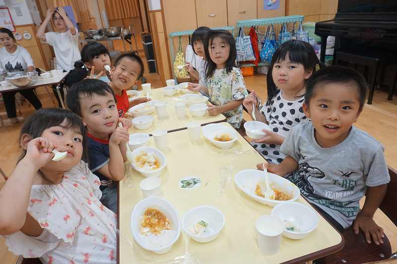 園に帰ってきてからは、みんなで夕食作り。メニューは「カレーライス・ポテトサラダ・かき氷」包丁で野菜やハムを切り、ポテトサラダのジャガイモを潰しました。夕食の仕上げは給食の先生にお願いし、美味しいカレーが出来上がる間、“おばけやしきごっこ”をしました!薄暗いふじ組のお部屋がおばけやしき変わり、グループごとに分かれでおばけに変身した子ども達。脅かすのも脅かされるのもとっても楽しくて、大盛り上がりでした!待ちに待った夕食も完成。みんなで作ったカレーライスとポテトサラダは格別でおかわりするお友だちも多かったです!かき氷も好きな味を選び、ニコニコで食べていました。