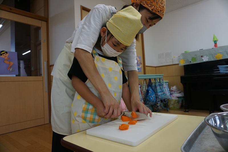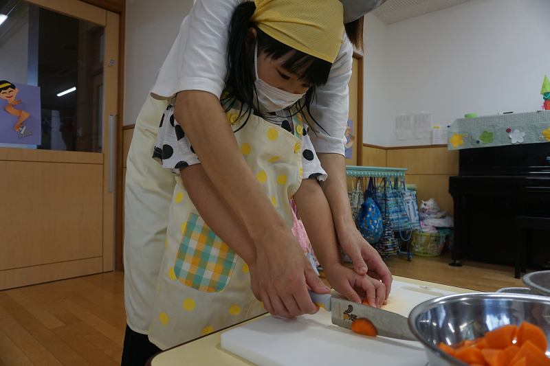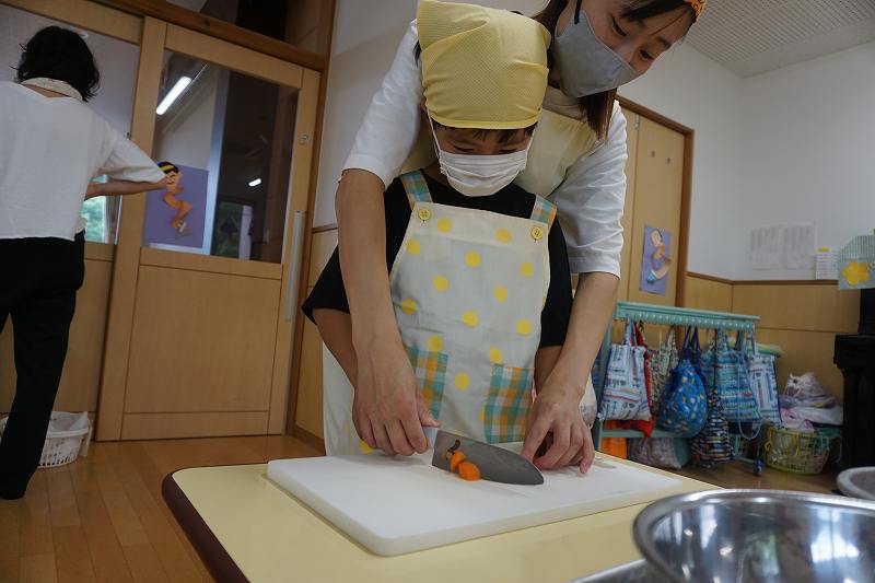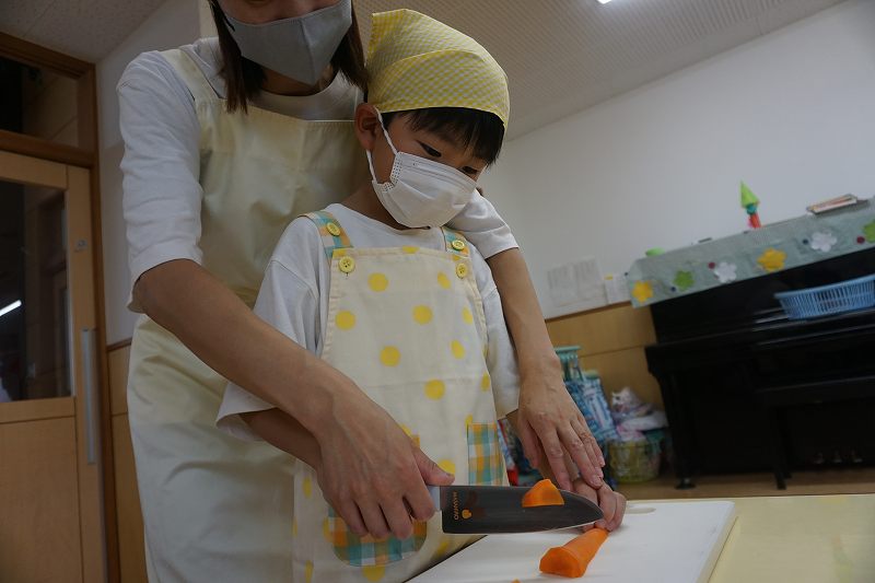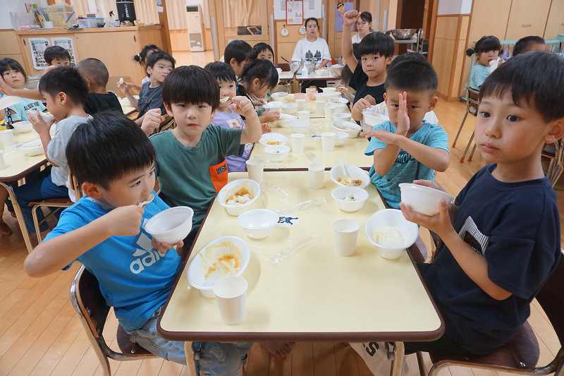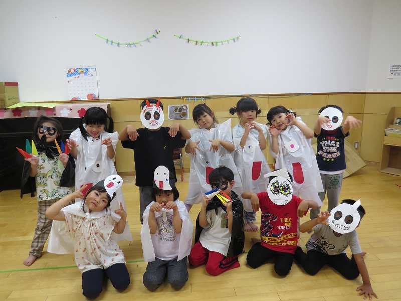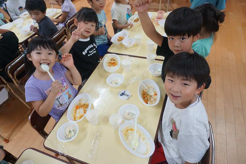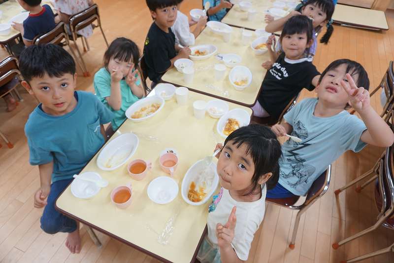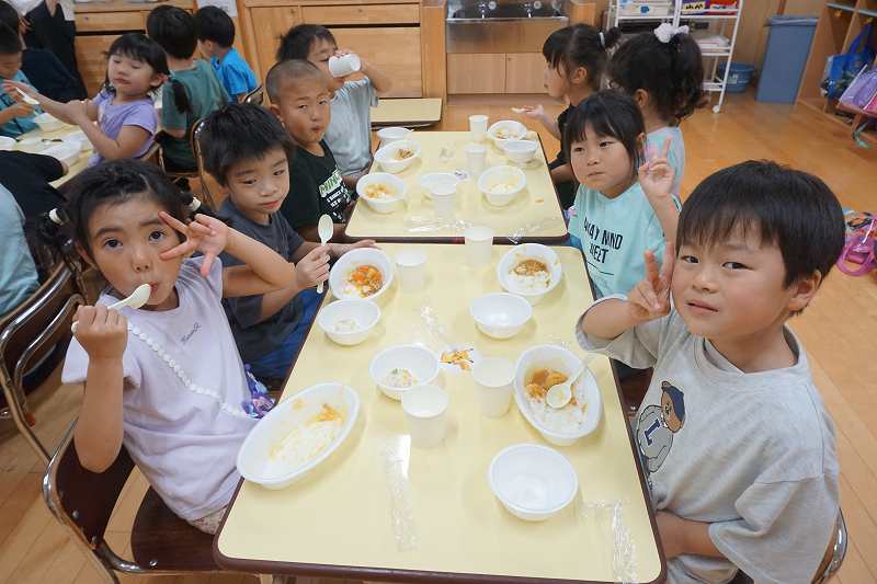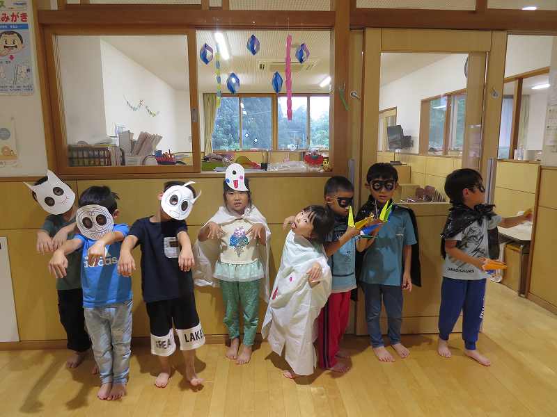 園に帰ってきてからは、みんなで夕食作り。メニューは「カレーライス・ポテトサラダ・かき氷」包丁で野菜やハムを切り、ポテトサラダのジャガイモを潰しました。夕食の仕上げは給食の先生にお願いし、美味しいカレーが出来上がる間、“おばけやしきごっこ”をしました!薄暗いふじ組のお部屋がおばけやしき変わり、グループごとに分かれでおばけに変身した子ども達。脅かすのも脅かされるのもとっても楽しくて、大盛り上がりでした!待ちに待った夕食も完成。みんなで作ったカレーライスとポテトサラダは格別でおかわりするお友だちも多かったです!かき氷も好きな味を選び、ニコニコで食べていました。