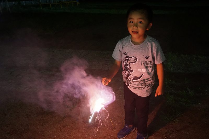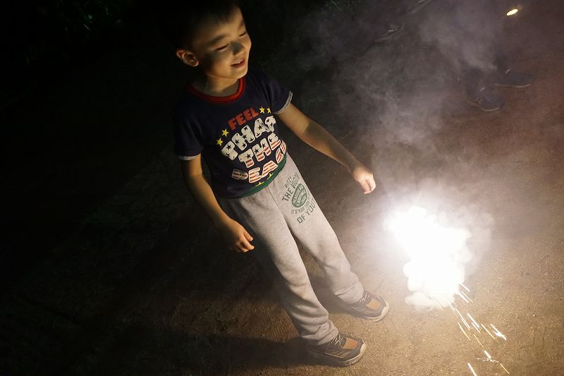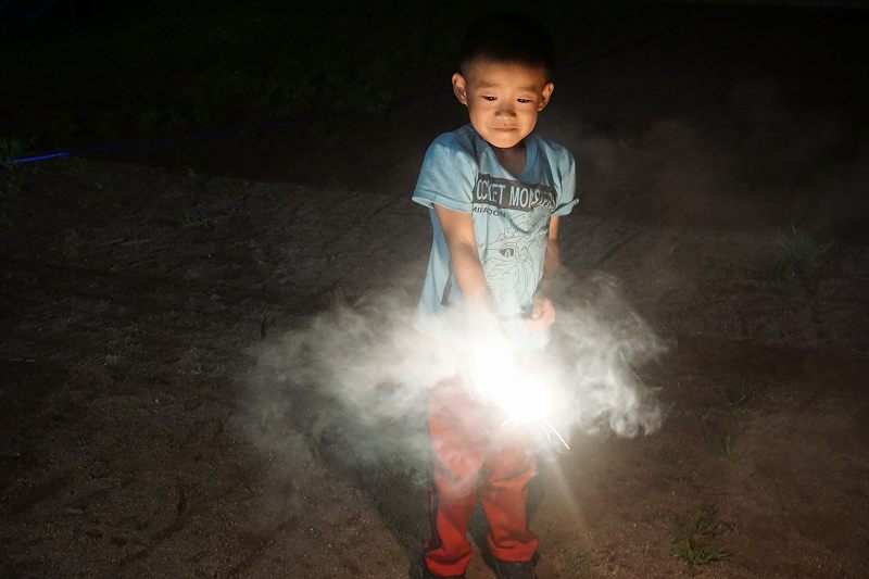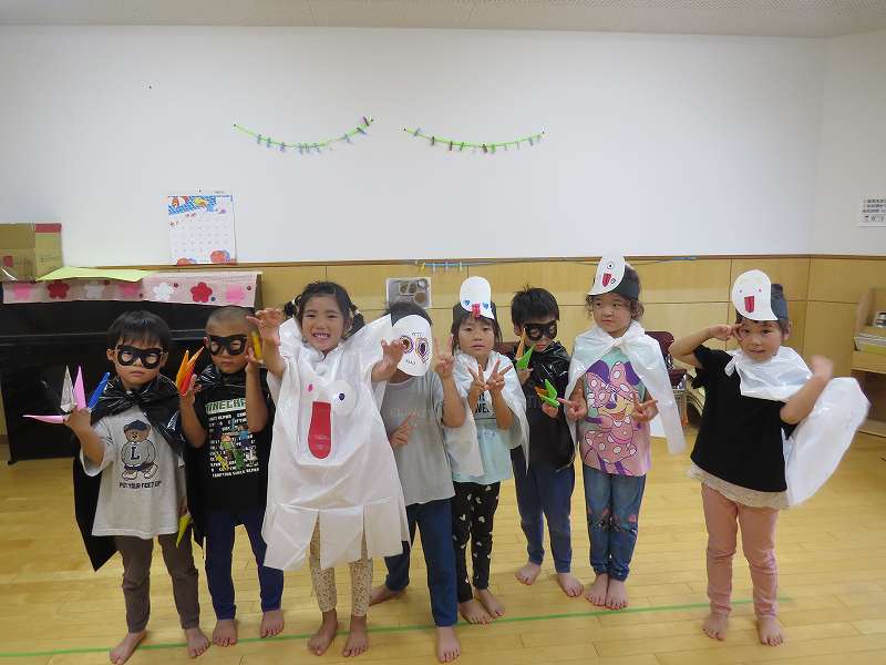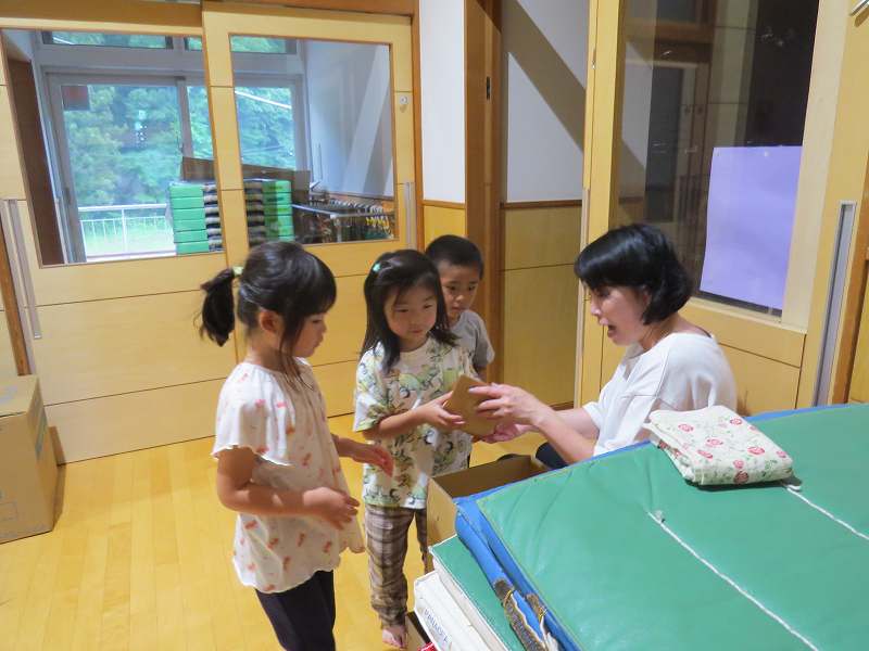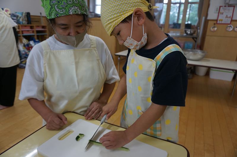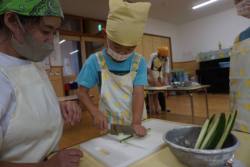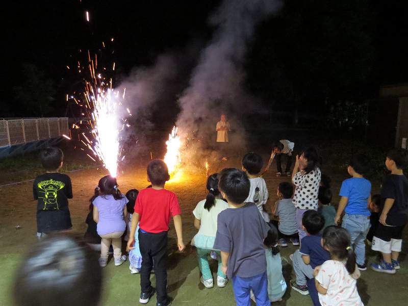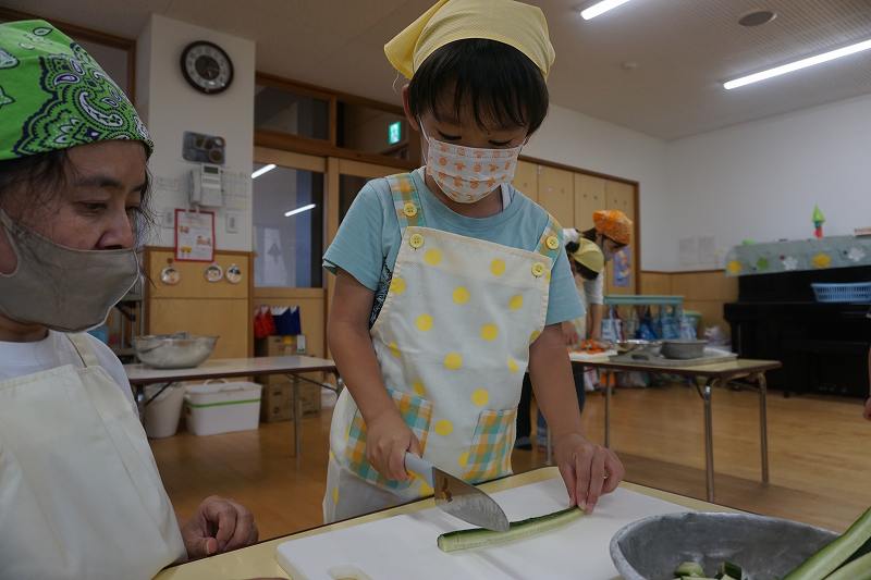 園に帰ってきてからは、みんなで夕食作り。メニューは「カレーライス・ポテトサラダ・かき氷」包丁で野菜やハムを切り、ポテトサラダのジャガイモを潰しました。夕食の仕上げは給食の先生にお願いし、美味しいカレーが出来上がる間、“おばけやしきごっこ”をしました!薄暗いふじ組のお部屋がおばけやしき変わり、グループごとに分かれでおばけに変身した子ども達。脅かすのも脅かされるのもとっても楽しくて、大盛り上がりでした!待ちに待った夕食も完成。みんなで作ったカレーライスとポテトサラダは格別でおかわりするお友だちも多かったです!かき氷も好きな味を選び、ニコニコで食べていました。