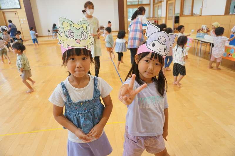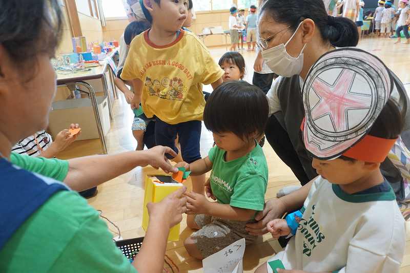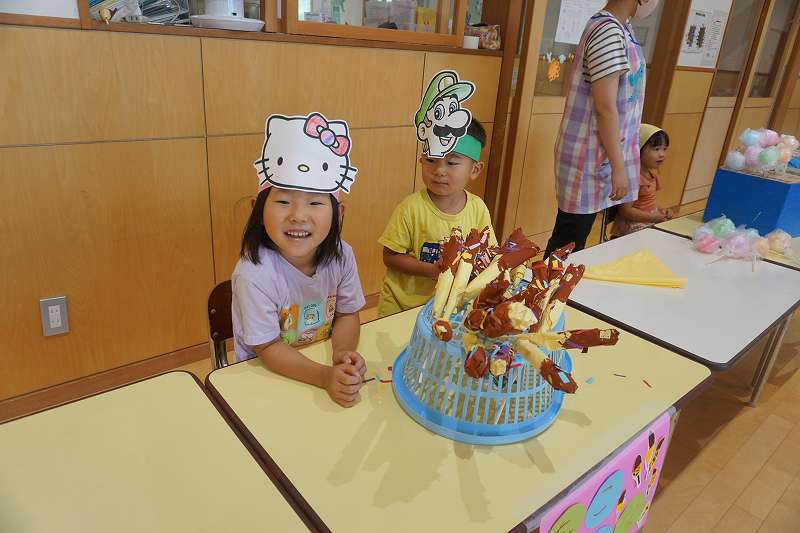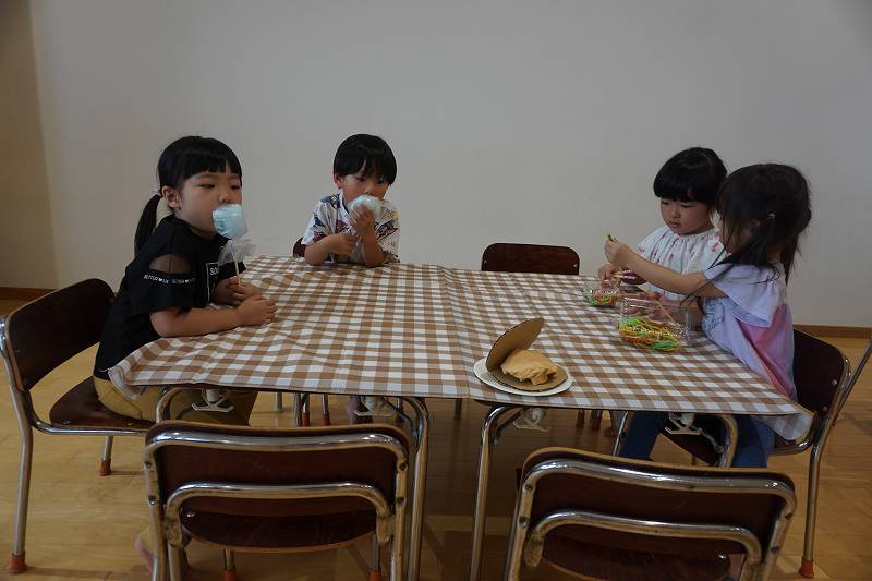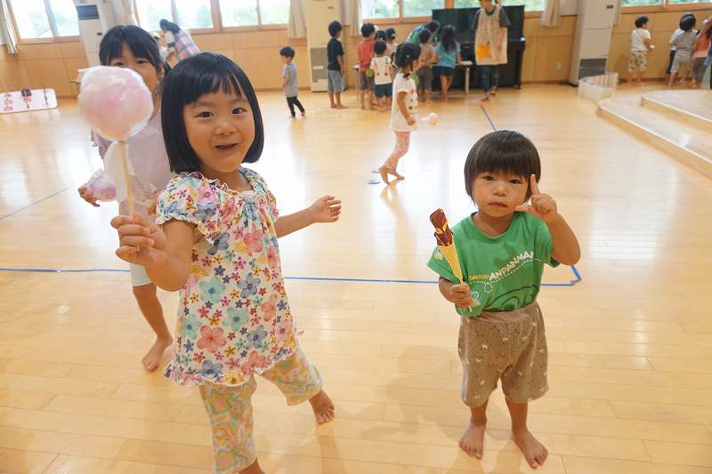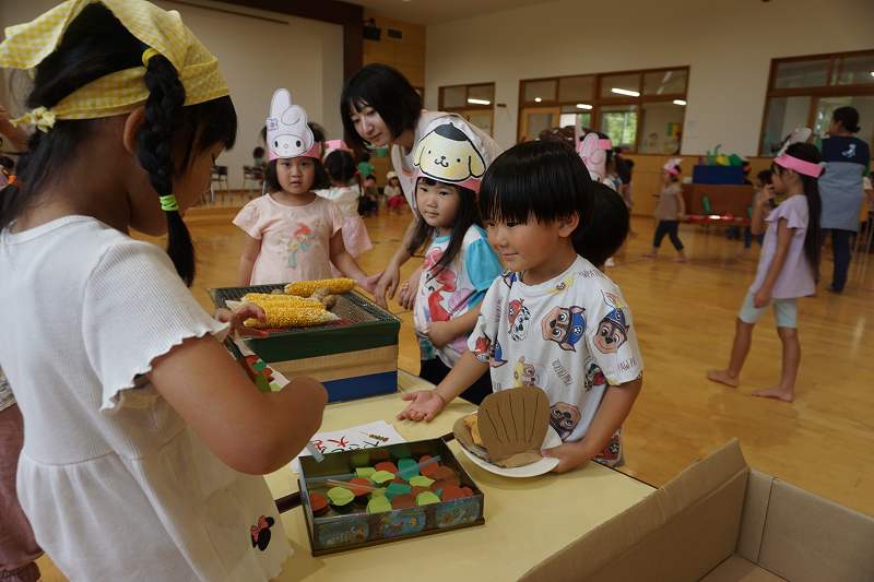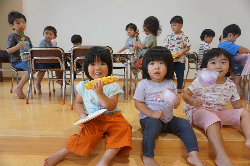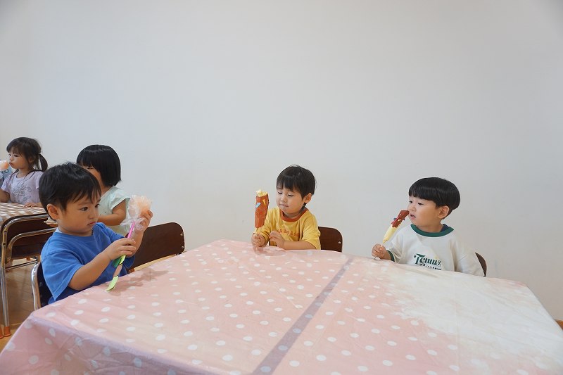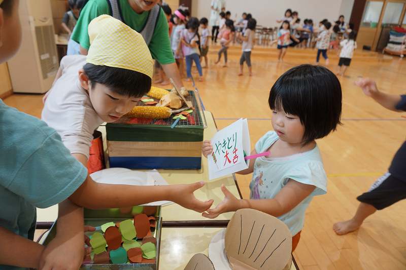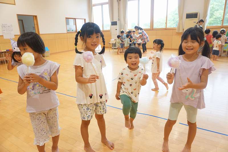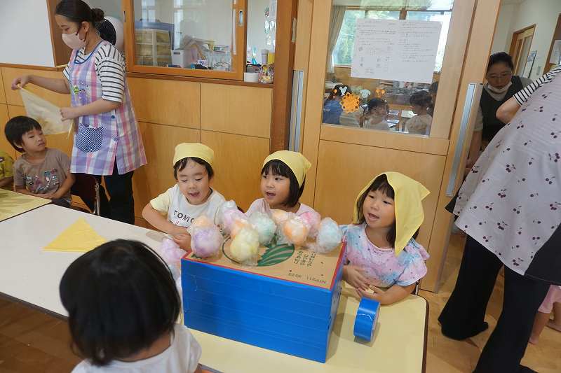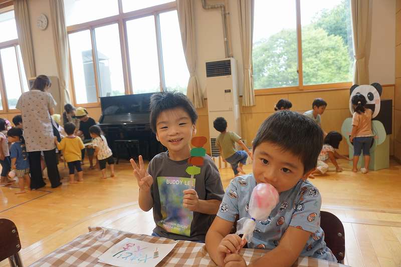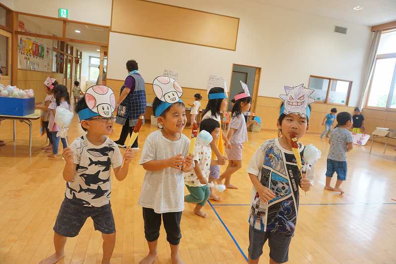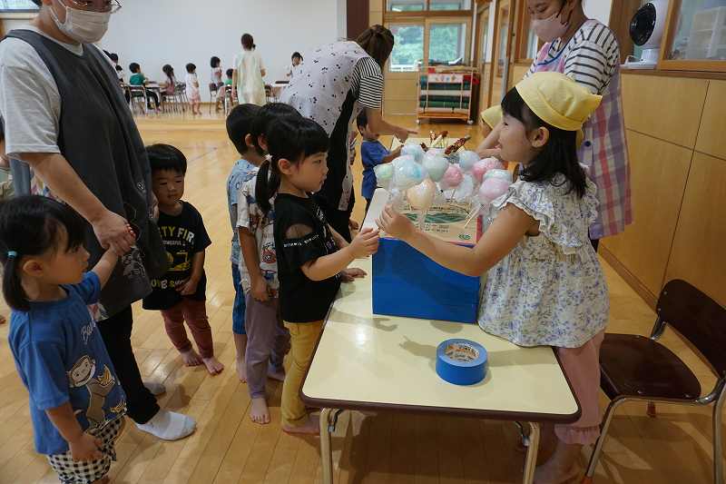 「いらっしゃいませー」とお遊戯室に元気いっぱいの声が響き渡り始まったおまつりごっこ!お遊戯室にはやきそばやわたあめ、チョコバナナなど美味しそうなお店がずらりと並びました。すみれ組のお部屋ではお面作りを楽しみ、ふじ組のおみこしコーナーからは「わっしょい!わっしょい!」と元気におみこしを担ぐ掛け声も聞こえてきました。くじ引きコーナーには様々な景品が並び、何が当たるかドキドキしながら、おまつりごっこの最後にはくじ引きも楽しんだ子ども達でした!
