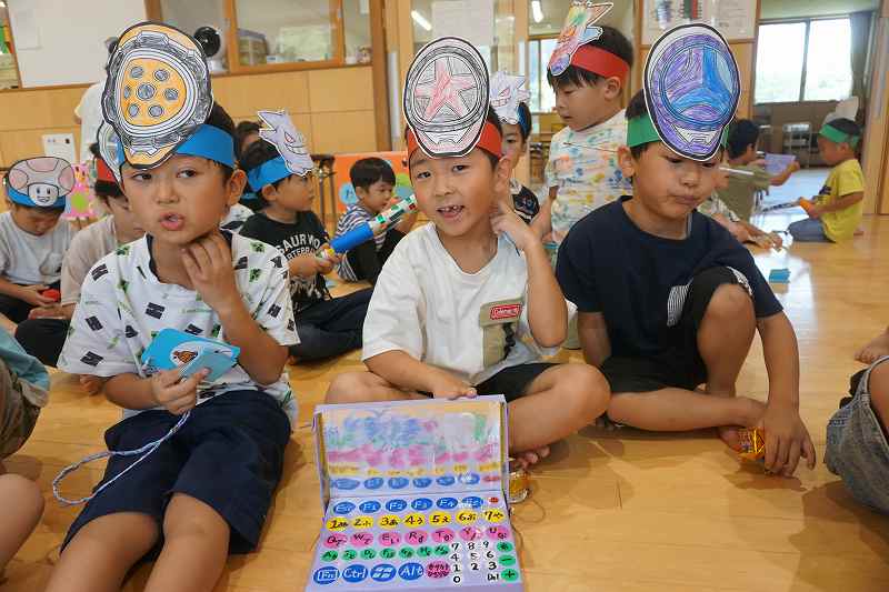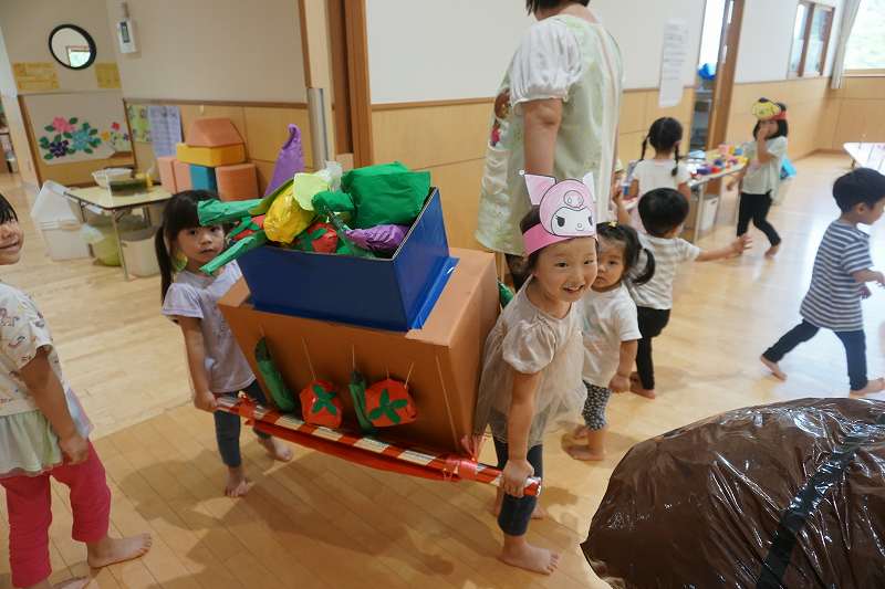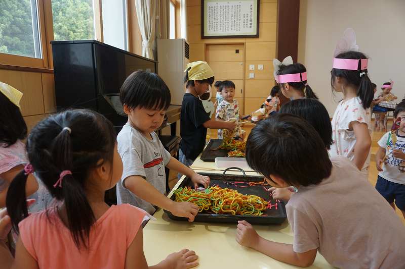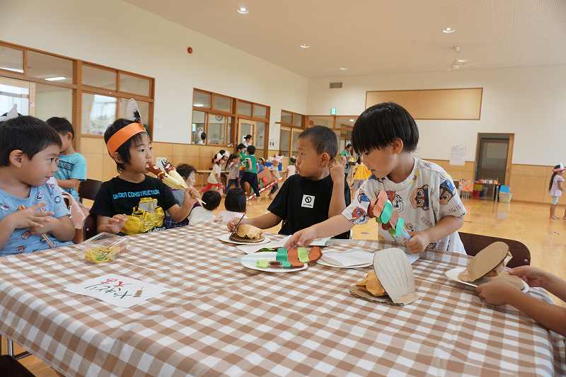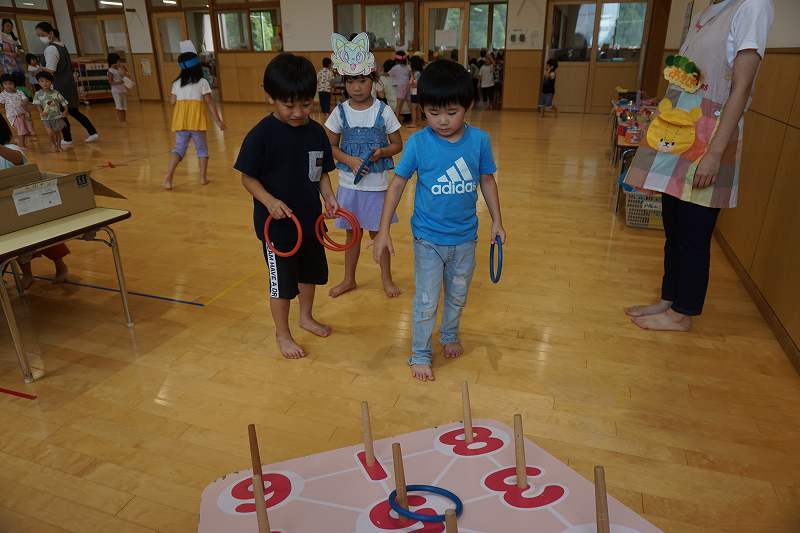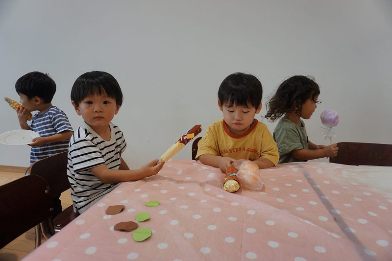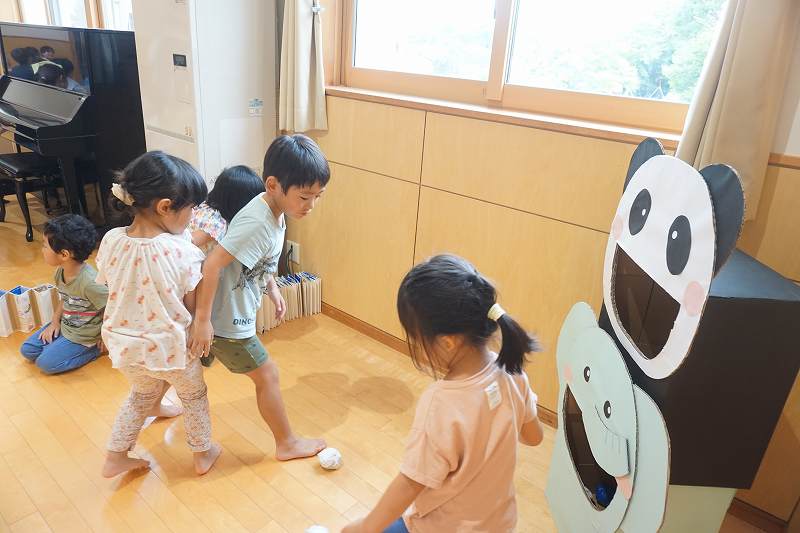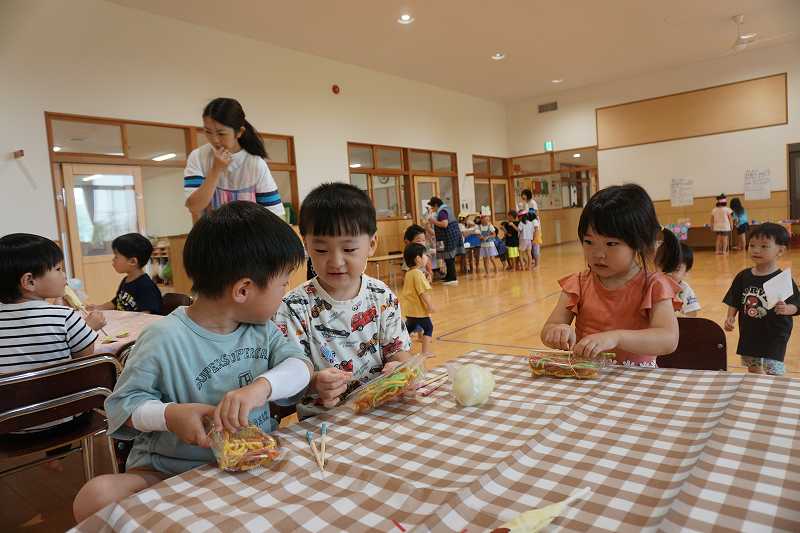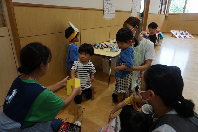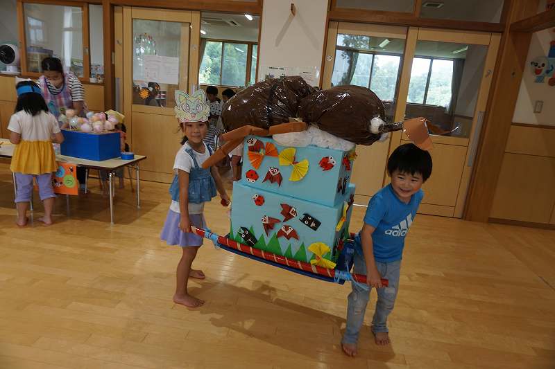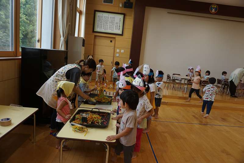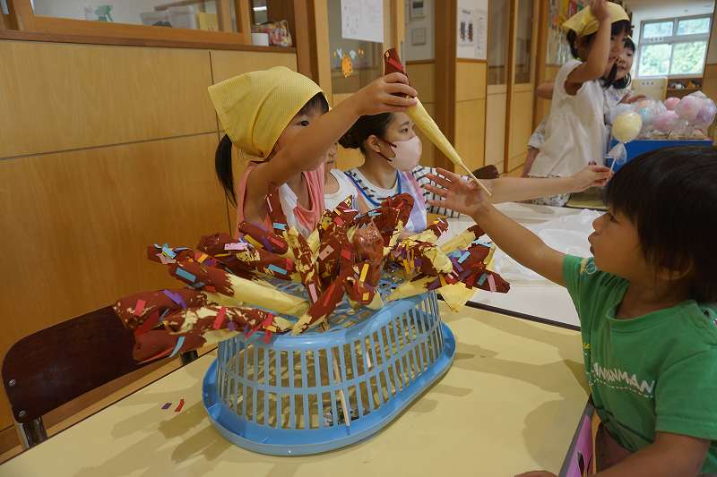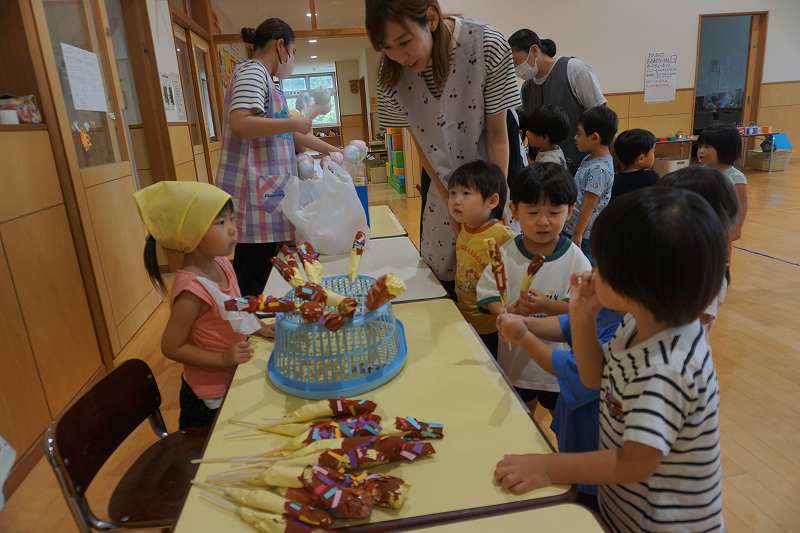 「いらっしゃいませー」とお遊戯室に元気いっぱいの声が響き渡り始まったおまつりごっこ!お遊戯室にはやきそばやわたあめ、チョコバナナなど美味しそうなお店がずらりと並びました。すみれ組のお部屋ではお面作りを楽しみ、ふじ組のおみこしコーナーからは「わっしょい!わっしょい!」と元気におみこしを担ぐ掛け声も聞こえてきました。くじ引きコーナーには様々な景品が並び、何が当たるかドキドキしながら、おまつりごっこの最後にはくじ引きも楽しんだ子ども達でした!