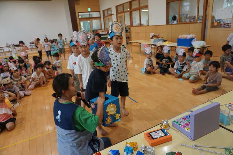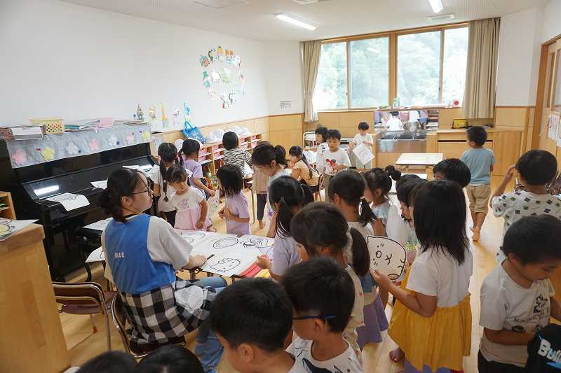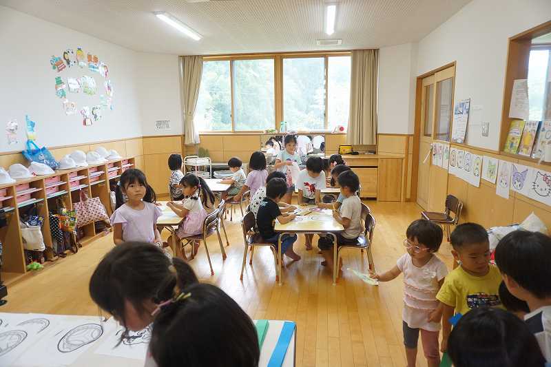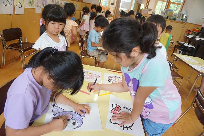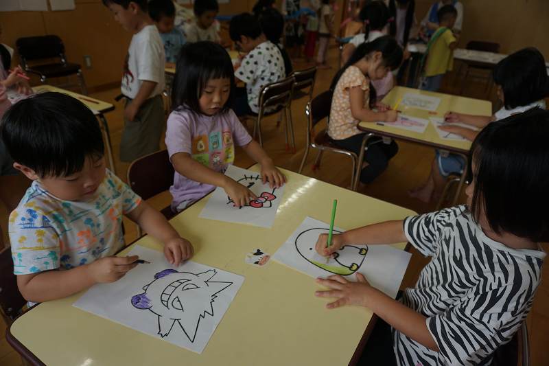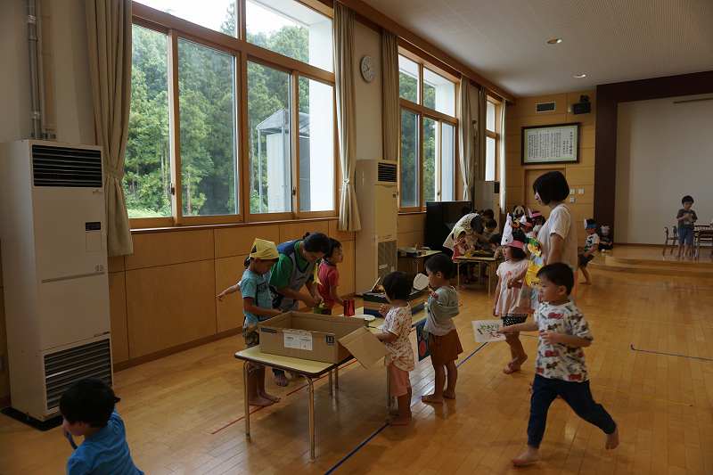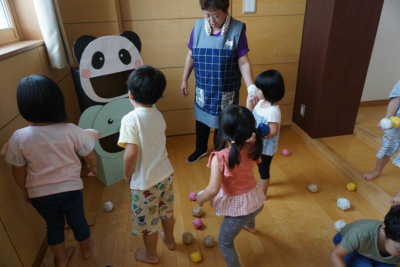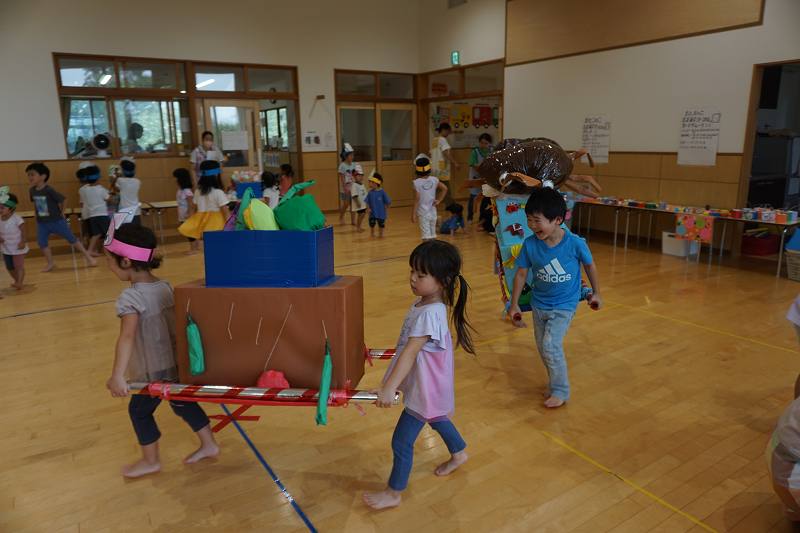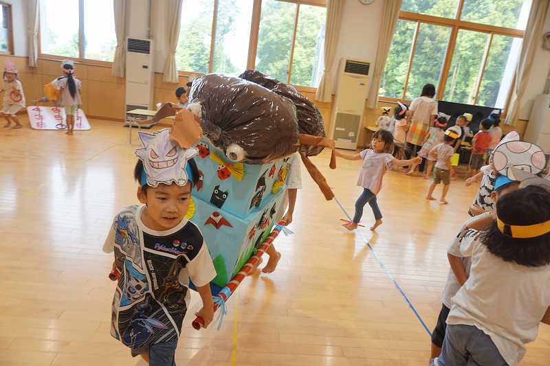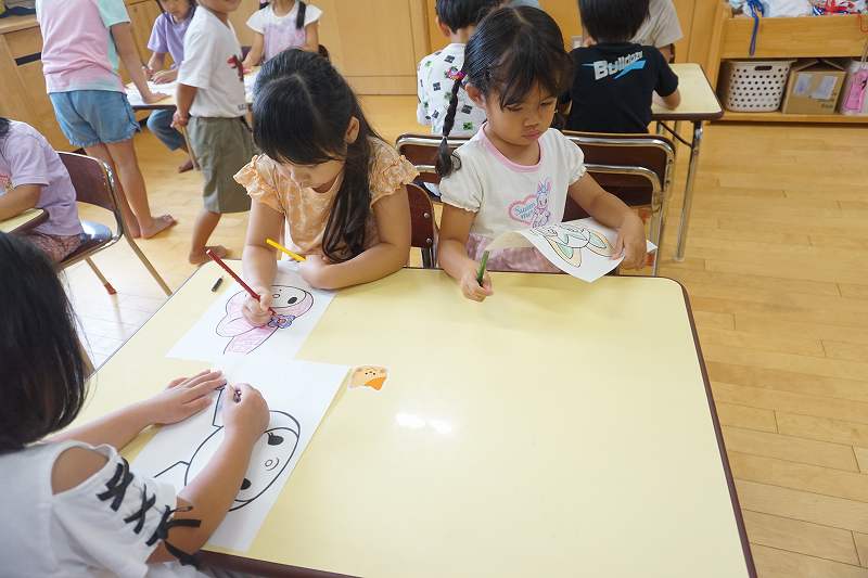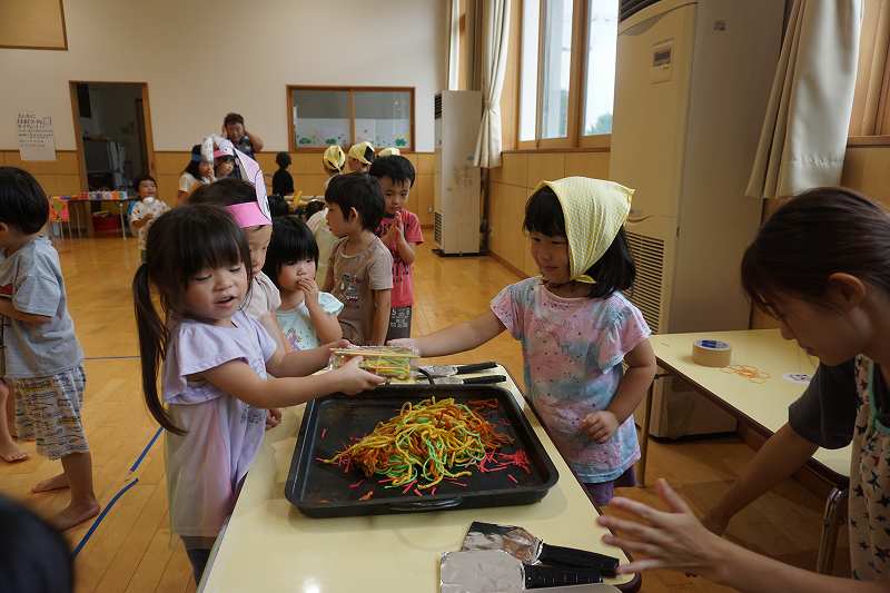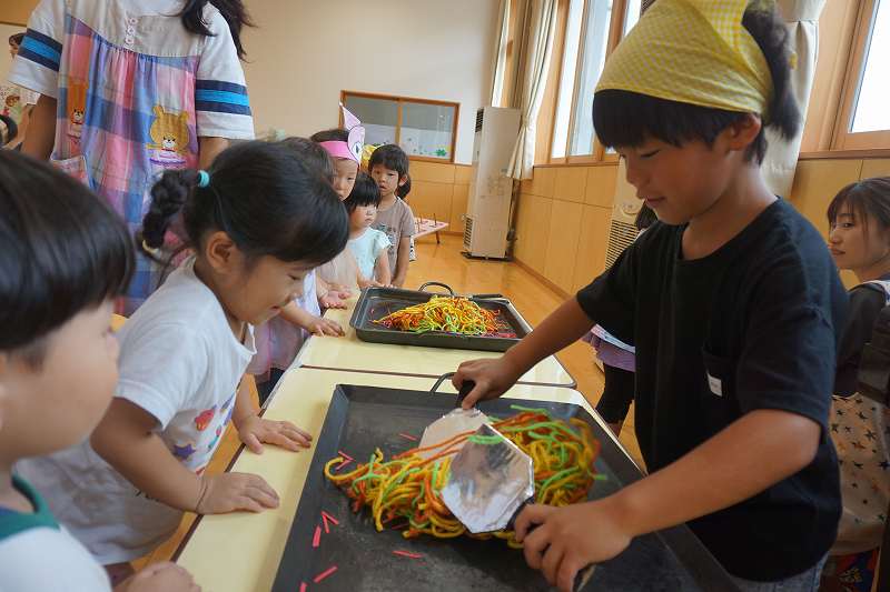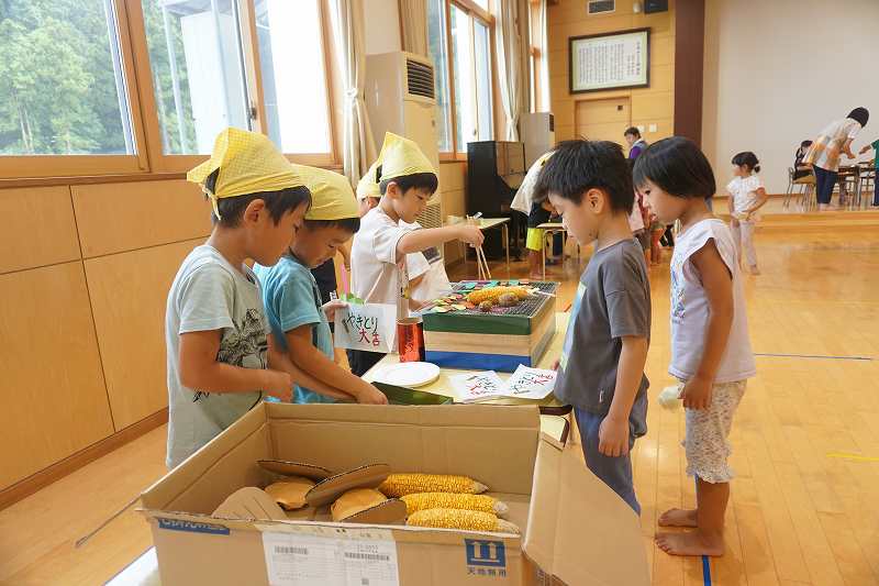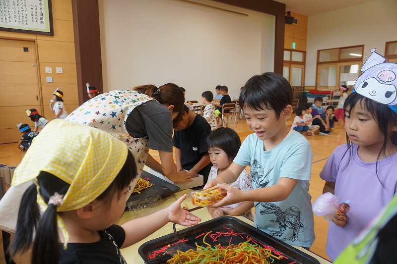 「いらっしゃいませー」とお遊戯室に元気いっぱいの声が響き渡り始まったおまつりごっこ!お遊戯室にはやきそばやわたあめ、チョコバナナなど美味しそうなお店がずらりと並びました。すみれ組のお部屋ではお面作りを楽しみ、ふじ組のおみこしコーナーからは「わっしょい!わっしょい!」と元気におみこしを担ぐ掛け声も聞こえてきました。くじ引きコーナーには様々な景品が並び、何が当たるかドキドキしながら、おまつりごっこの最後にはくじ引きも楽しんだ子ども達でした!
