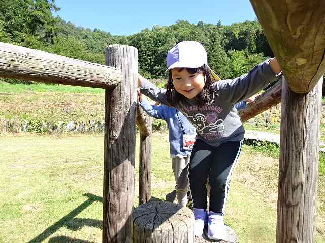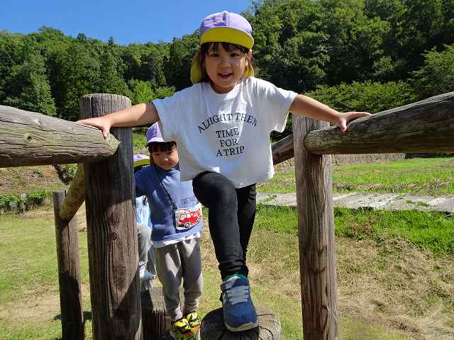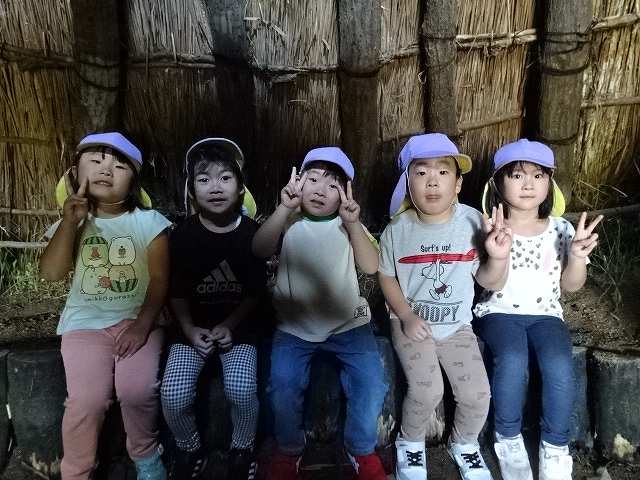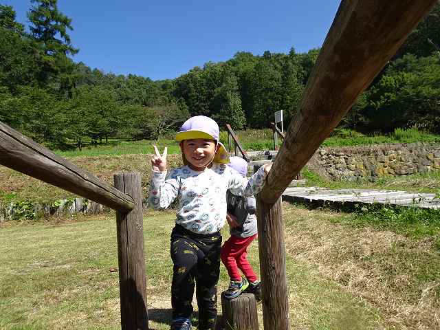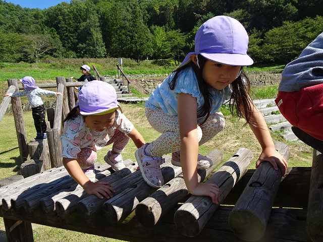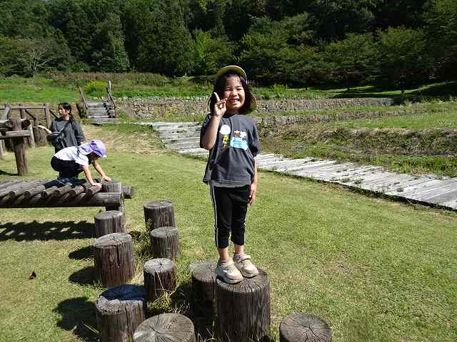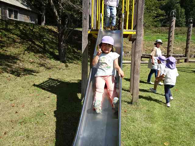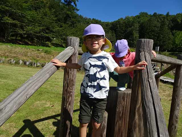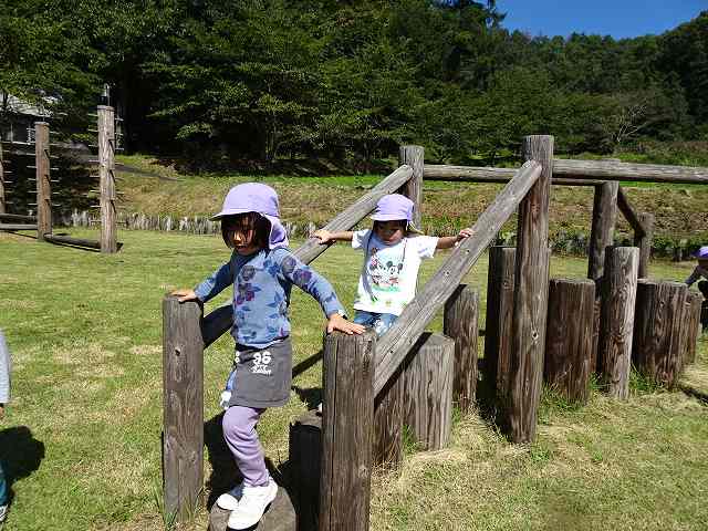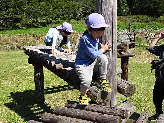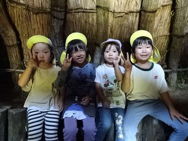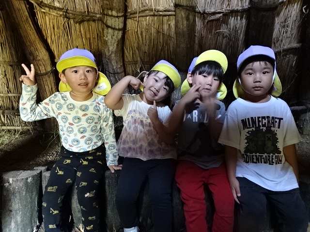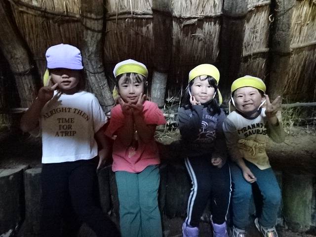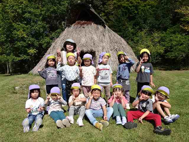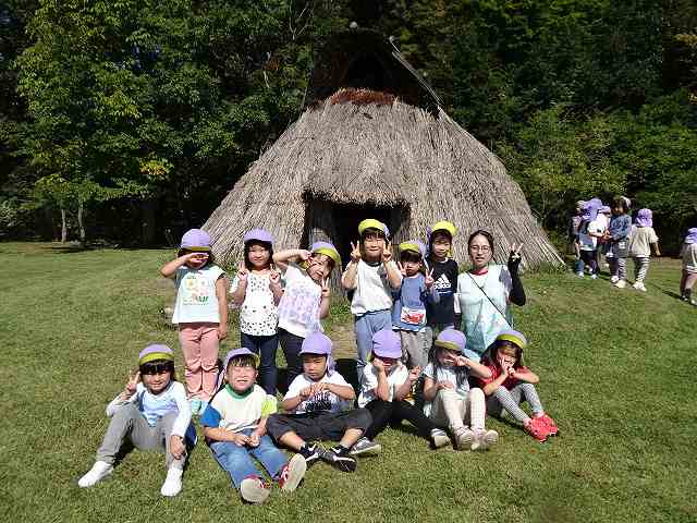 1日(火)高畠町のまほろばの里・歴史公園へ園外保育に行ってきました。散策の途中で縄文時代の家を見つけると興味津々の子ども達。ドキドキしながら薄暗い家の中に入りました。アスレチックでは体を動かしてたくさん遊びお腹もペコペコ。お昼は秋晴れの心地よい空の下、給食の先生が作ってくれたお弁当を美味しくいただきました!