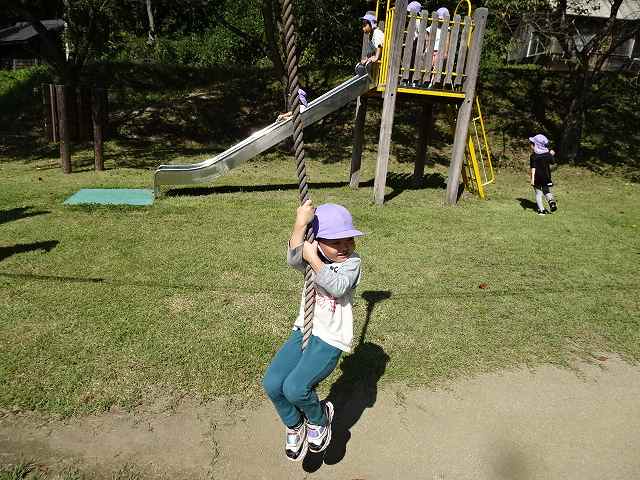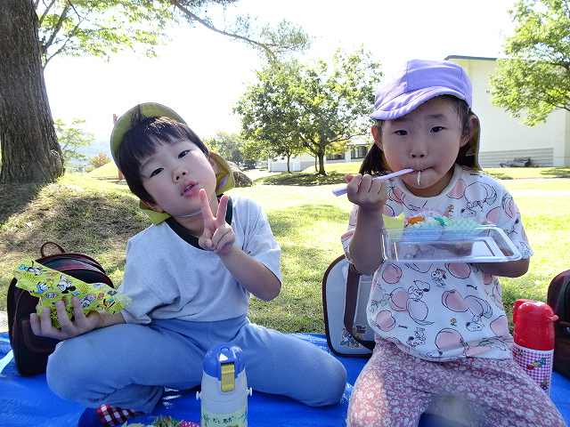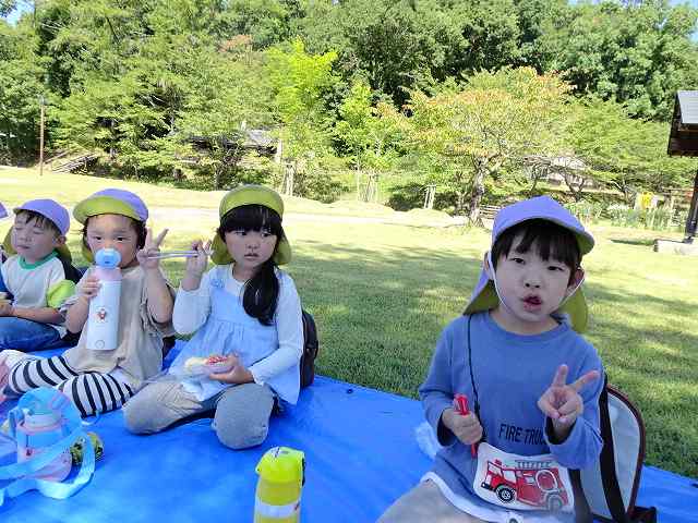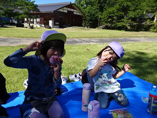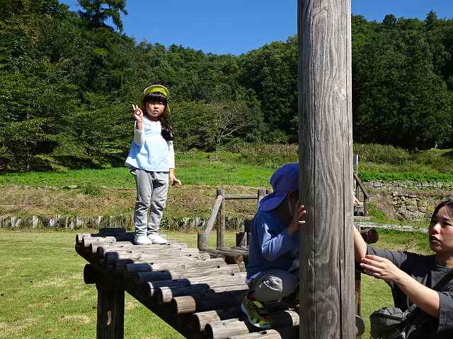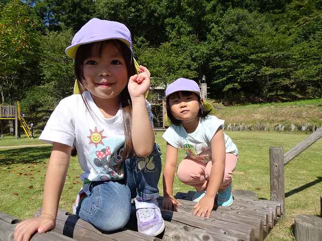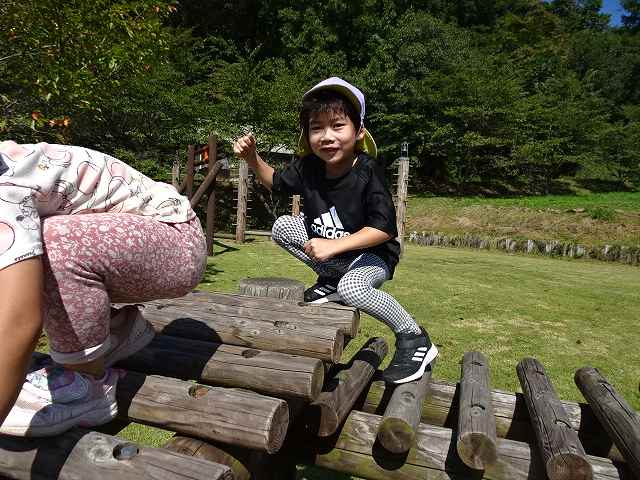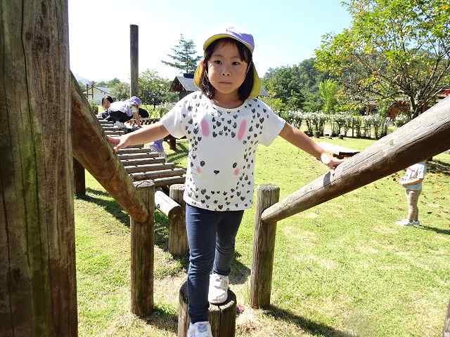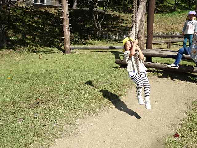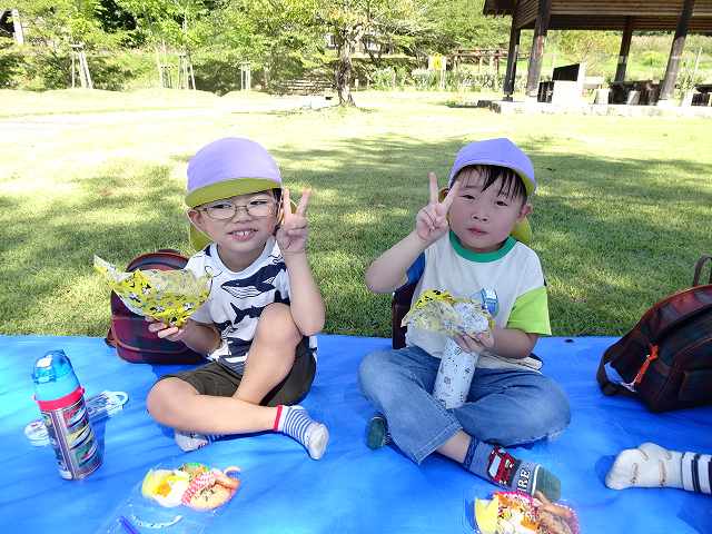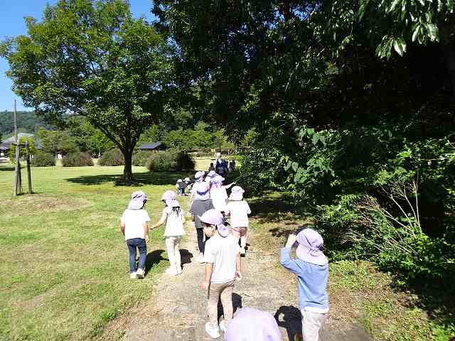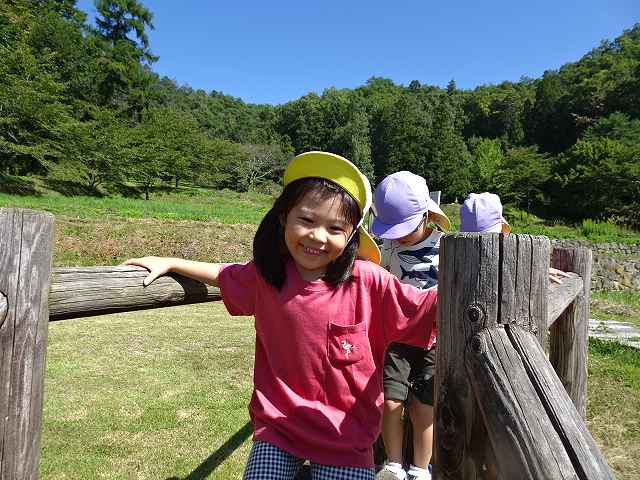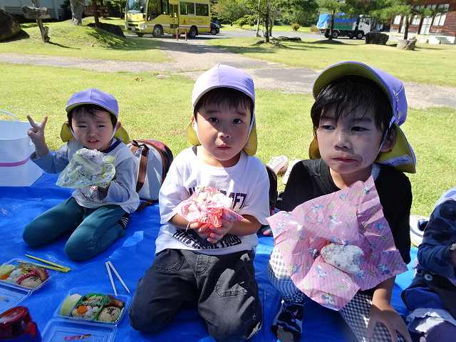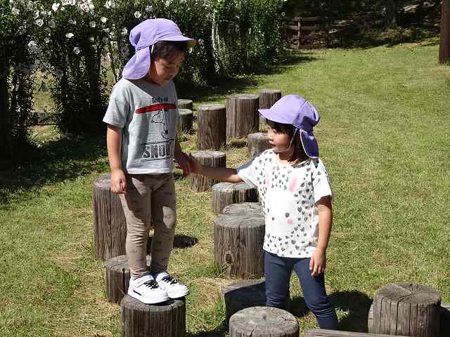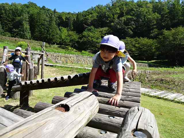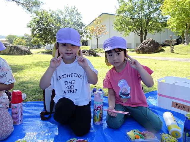 1日(火)高畠町のまほろばの里・歴史公園へ園外保育に行ってきました。散策の途中で縄文時代の家を見つけると興味津々の子ども達。ドキドキしながら薄暗い家の中に入りました。アスレチックでは体を動かしてたくさん遊びお腹もペコペコ。お昼は秋晴れの心地よい空の下、給食の先生が作ってくれたお弁当を美味しくいただきました!